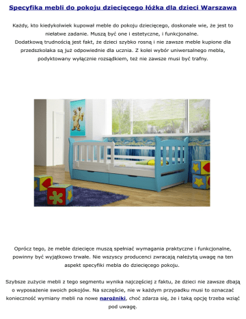 Specyfika mebli do pokoju dziecięcego łóżka dla dzieci Warszawa Każdy, kto kiedykolwiek kupował meble do pokoju dziecięcego, doskonale wie, że jest to niełatwe zadanie. Muszą być one i estetyczne, i funkcjonalne. Dodatkową trudnością jest fakt, że dzieci szybko rosną i nie zawsze meble kupione dla przedszkolaka są już odpowiednie dla ucznia. Z kolei wybór uniwersalnego mebla, podyktowany wyłącznie rozsądkiem, też nie zawsze musi być trafny. Oprócz tego, że meble dziecięce muszą spełniać wymagania praktyczne i funkcjonalne, powinny być wyjątkowo trwałe. Nie wszyscy producenci zwracają należytą uwagę na ten aspekt specyfiki mebla do dziecięcego pokoju. Szybsze zużycie mebli z tego segmentu wynika najczęściej z faktu, że dzieci nie zawsze dbają o wyposażenie swoich pokojów. Na szczęście, nie w każdym przypadku musi to oznaczać konieczność wymiany mebli na nowe narożniki, choć zdarza się, że i taką opcję trzeba wziąć pod uwagę. Szczególnie podatne na zniszczenie i zużycie są dziecięce meble tapicerowane, takie jak krzesła czy pufy. Trudno wyobrazić sobie bez nich wyposażenie dziecięcego pokoju, jednak dbanie o czystość tego typu mebli może przyprawiać rodziców o ból głowy. Ciągłe pranie i czyszczenie, które może być konieczne w przypadku młodszych dzieci, zmniejsza żywotność i wytrzymałość tkanin. Rozwiązaniem, które warto rozważyć, jest zakup tkanin zmywalnych, które są łatwe w konserwacji i odporne na zabrudzenia. Można się w nie zaopatrzyć, korzystając z ofert specjalistycznych sklepów, takich jak www.bestsale.pl. Tego typu tkaniny są nie tylko funkcjonalne, ale i ładne. Dzięki dużemu doborowi wzorów i kolorów, można wybrać odpowiednie obicie dla pufy czy dziecięcego krzesła, dostosowane do każdego wnętrza. Wyposażając dziecięcy pokój, można oczywiście pomijać meble tapicerowane, kupując wybory, na przykład, z litego drewna. Należy tylko odpowiedzieć sobie na pytanie, czy takie meble będą funkcjonalne, wygodne i bezpieczne dla dziecka? Niekoniecznie. Znacznie lepszą opcją wydaje się inwestycja w praktyczne tkaniny zmywalne.