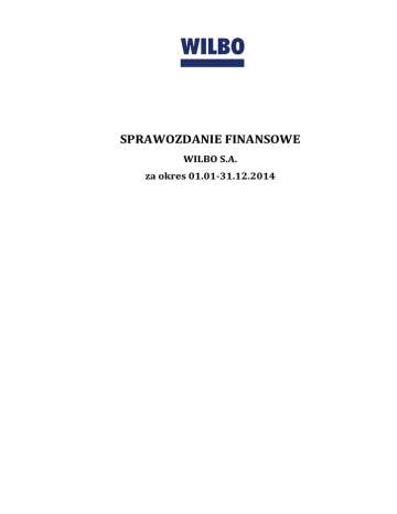 SPRAWOZDANIE FINANSOWE WILBO S.A. za okres 01.01-31.12.2014 Sprawozdanie finansowe za 2014 rok --------------------------------------------------------------------------------------------------------------------------- 1. Wprowadzenie do sprawozdań finansowych Roczne sprawozdanie finansowe WILBO S.A. z siedzibą w Gdyni przy ulicy Przemysłowej 8, zawiera: 1) roczne sprawozdanie z sytuacji finansowej sporządzone na dzień 31.12.2014r., 2) roczne sprawozdanie z całkowitych dochodów za okres od 01.01.2014r. do 31.12.2014r., 3) roczne zestawienie zmian w kapitale własnym, 4) roczne sprawozdanie z przepływów pieniężnych, 5) dodatkowe noty objaśniające. 1.1 Ogólna charakterystyka Wilbo S.A. Nazwa: Wilbo S.A. Siedziba: 81-029 Gdynia, ul. Przemysłowa 8 Numer identyfikacyjny Regon: 191312270 Numer NIP: 587-00-08-034 Rejestracja: Sąd Rejonowy w Gdańsku, VIII wydział KRS Numer KRS: 64401 Przedmiot działalności: Przetwarzanie ryb, skorupiaków i mięczaków PKD 10.20.Z 1.2 Polityka rachunkowości przyjęta do sporządzenia jednostkowego sprawozdania finansowego Wilbo S.A. sporządza sprawozdania finansowe zgodnie z Międzynarodowymi Standardami Sprawozdawczości Finansowej. Sprawozdanie jest sporządzone zgodnie z koncepcją kosztu historycznego, z wyjątkiem aktywów finansowych, które wycenione są w wartości godziwej i obejmuje okres od 01 stycznia 2014 roku do 31 grudnia 2014 roku. Zasady rachunkowości przyjęte przy sporządzaniu sprawozdania finansowego, w szczególności zasady wyceny aktywów i pasywów oraz pomiary wyniku finansowego za rok 2013 i rok 2014 były stosowane w sposób ciągły i zapewniający porównywalność informacji. Wszystkie kwoty przedstawione w sprawozdaniu finansowym i innych informacjach finansowych są wykazywane w tysiącach złotych. Rzeczowe aktywa trwałe Środki trwałe wycenione są w cenie nabycia lub koszcie wytworzenia pomniejszone o amortyzację i odpisy z tytułu utraty wartości. Cena nabycia i koszt wytworzenia obejmują koszty poniesione na zakup lub wytworzenie składnika rzeczowego majątku trwałego oraz nakłady poniesione w terminie późniejszym w celu zwiększenia przydatności składnika, zmiany części lub jego bieżącej obsługi. Koszty wymiany głównych składników środków trwałych oraz ich ulepszenia zwiększają ich wartość, natomiast koszty remontów, napraw i serwis są kosztem danego okresu przechodzącym przez rachunek zysków i strat. Amortyzacja środków trwałych dokonywana jest według ustalonego planu przy zastosowaniu WILBO SA 2 Sprawozdanie finansowe za 2014 rok --------------------------------------------------------------------------------------------------------------------------metody liniowej przez okres ekonomicznej użyteczności z pominięciem gruntów oraz środków trwałych w budowie. Szacowane okresy przewidywanej użyteczności ekonomicznej dla maszyn i urządzeń wynoszą od 3 do 10 lat. Niskowartościowe składniki środków trwałych o wartości początkowej nie przekraczającej 1 tys. PLN obciążają koszty działalności bieżącej Spółki. Natomiast środki trwałe o wartości powyżej 1 tys. PLN do 3,5 tys. PLN są umarzane jednorazowo w miesiącu następnym po przyjęciu do użytkowania. Aktywa trwałe przeznaczone do sprzedaży Spółka klasyfikuje składnik aktywów trwałych jako przeznaczony do sprzedaży, w sytuacji, gdy jego wartość zostanie odzyskana w drodze sprzedaży, a nie w wyniku jego dalszego wykorzystania, a prawdopodobieństwo jego sprzedaży wystąpi w ciągu 12 miesięcy. Aktywa te wycenione są w wartości bilansowej i wartości godziwej, pomniejszonej o koszty zbycia. Wartości niematerialne Spółka zalicza dany składnik aktywów do wartości niematerialnych i prawnych w sytuacji kiedy można go wyodrębnić lub kiedy wynika to z tytułów umownych, prawnych bez względu na fakt, czy są one zbywalne lub możliwe do wyodrębnienia z jednostki gospodarczej lub innych tytułów lub zobowiązań. Zapasy Zapasy to materiały nabyte w celu dalszej odsprzedaży lub w celu zużycia na własne potrzeby oraz wytworzone przez emitenta produkty gotowe. Wycenę tych składników aktywów ustala się według ceny ewidencyjnej. W skład ceny ewidencyjnej wchodzi wartość zakupu powiększona o dodatkowe koszty z nim związane, w tym: transport, ubezpieczenie, cło, handling. Na koszt wytworzenia wyrobów gotowych składa się wartość materiałów bezpośrednich, robocizny oraz uzasadniona część kosztów pośrednich. Wartość zapasów nie przekracza ceny sprzedaży netto. W ciągu okresu sprawozdawczego dokonuje się odpisów aktualizacyjnych wartości zapasów pod kątem ich wartości ekonomicznej. Stany magazynowe są kontrolowane minimum dwa razu w ciągu roku obrotowego poprzez inwentaryzacje, a ewentualne niedobory stanowią koszty danego okresu rozliczeniowego. Należności handlowe Należności z tytułu dostaw robót i usług są wykazywane w wartości zafakturowanej. Na należności nieściągalne lub, gdy ściągnięcie pełnej kwoty przestało być prawdopodobne, Spółka tworzy odpisy aktualizacyjne. Odpis na należności tworzy się w pełnej wysokości dla należności dochodzonej na drodze sądowej lub, gdy należność jest przeterminowana powyżej 6 miesięcy. Należności nieściągalne są odpisywane w pozostałe koszty w momencie tworzenia odpisu aktualizacyjnego. Środki pieniężne Wykazywane są w wartości nominalnej i obejmują środki pieniężne w kasie i na rachunkach bankowych. WILBO SA 3 Sprawozdanie finansowe za 2014 rok --------------------------------------------------------------------------------------------------------------------------Rezerwy Spółka tworzy rezerwy w przypadku, gdy jest w stanie wiarygodnie oszacować wartość kosztu w przyszłości. Kredyty bankowe Kredyty i pożyczki zalicza się do zobowiązań krótkoterminowych, chyba że jednostka posiada prawo spłaty zobowiązania po upływie co najmniej 12 miesi