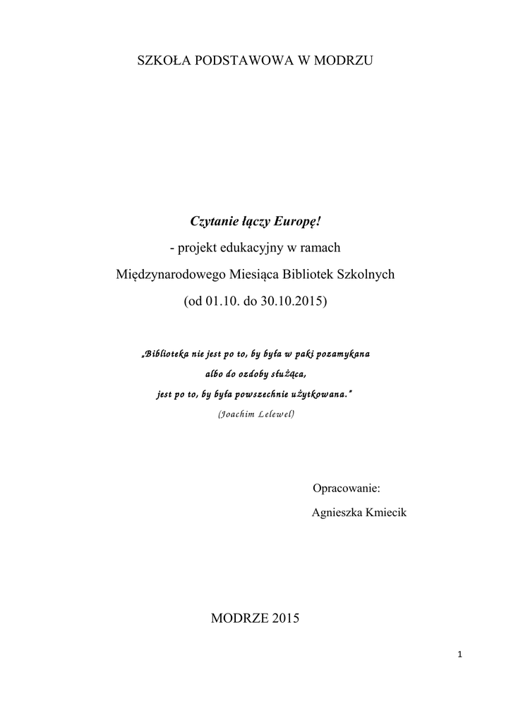 SZKOŁA PODSTAWOWA W MODRZU Czytanie łączy Europę! - projekt edukacyjny w ramach Międzynarodowego Miesiąca Bibliotek Szkolnych (od 01.10. do 30.10.2015) „ Biblioteka nie jest po p o to, by była w paki pozam ykana albo do ozdoby służąca, słu ca, jest po to, by była pow szechnie użytkow u ytkow ana.” ana. ” (Joachim Lelew el) Opracowanie: Agnieszka Kmiecik MODRZE 2015 1 „ Czytanie to najlepszy sposób uczenia się. si . Czytanie najlepsz najle pszą psz nauką. nauk . ” (A leksander Puszkin) Międzynarodowy Miesiąc Bibliotek Szkolnych obchodzi się w październiku. Święto jest organizowane od 1999 roku przez INTERNATIONAL ASSOCIATION OF SCHOOL LIBRARIANSHIP - IASL. Najpierw był to jeden dzień, od 2008 roku - cały październik. Celem akcji jest zwrócenie uwagi na ogromną rolę bibliotek w życiu szkoły, w nauce i rozwijaniu zainteresować czytelniczych. W tym roku wszelkie działania skupiają się wokół hasła: „Biblioteka szkolna rządzi!”. Nasza biblioteka również włączyła się do organizacji MMBS. W tym roku przygotowaliśmy szereg ciekawych przedsięwzięć, które trwać będą przez cały październik. Cel główny: - zwrócenie uwagi na rolę bibliotek w życiu szkoły, w nauce i rozwijaniu zainteresowań czytelniczych, - promocja biblioteki szkolnej jako miejsca skupiającego różnorodne aspekty życia kulturalnego. Cele szczegółowe: - pokazanie oferty i dorobku biblioteki szkolnej, - zachęcenie uczniów do zwiększenia czytelnictwa, - rozwijanie pasji czytania, pozytywnego nastawienia do książki i jej bohaterów, - integracja nauczycieli i uczniów wokół biblioteki, - zwrócenie uwagi uczniów, nauczycieli i rodziców na bibliotekę, jako aktywną, widoczną agendę szkoły, - docenienie pracy pozalekcyjnej uczniów, - stworzenie warunków do rozwijania zainteresowań uczniów, wzbogacanie słownictwa, umiejętności językowych, - utrwalenie nazw państw należących do Unii Europejskiej, - poznanie sylwetek znanych pisarzy danego kraju, flagi, osłuchanie z językiem, - zagospodarowanie wolnego czasu z książką. Harmonogram obchodów (wg tematyki): - od 01.10. do 02.10.2015 - Poznajemy bibliotekę szkolną i jej zbiory - od 05.10. do 09.10.2015 - Tydzień duński (baśnie Hansa Christiana Andersena) - od 12.10. do 16.10.2015 - Tydzień francuski (baśnie Charlesa Perraulta) - od 19.10. do 23.10.2015 - Tydzień niemiecki (baśnie braci Grimm) 2 - od 26.10. do 30.10.2015 - Tydzień angielski (baśnie Jacoba Jacobsona) - 30.10.2015 - podsumowanie projektu podczas dużej przerwy. Opis działania: przedszkole - Z wizytą w bibliotece... (uzgodnienie terminu z bibliotekarzem) - głośne czytanie fragmentów baśni dzieciom przez dorosłe osoby (codziennie przez 10 min. przez cały październik) - akcja „Słodkie wypożyczenia” - w zamian za wypożyczoną książkę czytelnik otrzymuje drobny słodki upominek - słuchanie hymnu państw należących do UE (październik 2015) - kolorowanki o książkach, o bohaterach baśni, o flagach państw należących do UE (od 16.10. do 30.10.) - Bal w Baśniolandii... - dzieci przebierają się za postaci z baśni - 29.10. (udział dobrowolny) kl. I-III - wizyta w bibliotece i wypożyczenie książki - Rajd czytelniczy - lekcje, podczas których zachęca się do czytania książek - czytanie baśni - słuchanie fragmentów baśni - wykorzystanie e-booka (poznanie tworzywa słuchowiska) - akcja „Słodkie wypożyczenia” - w zamian za wypożyczoną książkę czytelnik otrzymuje drobny słodki upominek - ilustracja do mojej ulubionej baśni - poznanie sylwetek znanych pisarzy danego kraju, flagi, osłuchanie z językiem państw należących do UE - Bal w Baśniolandii... - dzieci przebierają się za postaci z baśni - 29.10. (udział dobrowolny) 3 kl. IV-VI - wykonanie gazetki bibliotecznej o tematyce związanej z Międzynarodowym Miesiącem Bibliotek Szkolnych pod hasłem: „Biblioteka szkolna rządzi!” (do 02.10. - bibliotekarz) - wizyta w bibliotece i wypożyczenie książki - Rajd czytelniczy - lekcje, podczas których zachęca się do czytania książek - akcja „Słodkie wypożyczenia” - w zamian za wypożyczoną książkę czytelnik otrzymuje drobny słodki upominek - czytanie baśni - plakat promujący ulubioną baśń - poznanie sylwetek znanych pisarzy danego kraju, flagi, osłuchanie z językiem państw należących do UE - Bal w Baśniolandii... - dzieci przebierają się za postaci z baśni - 29.10. (udział dobrowolny). Podsumowanie wszystkich działań nastąpi 30.10. podczas dużej przerwy. Zdjęcia dokumentujące miesięczne obchody bibliotecznego święta zamieszczone zostaną na stronie internetowej szkoły. Efekty: Uczniowie - utrwalają położenie danego państwa na mapie Unii Europejskiej, - wyszukują flagę danego kraju, utrwalają jej kolory, - powtarzają „zaczarowane słowa” w danym języku, - pracują indywidualnie z tekstem, wykorzystując księgozbiór podręczny na temat danego kraju, - ukierunkowują swoje zainteresowania czytelnicze, dokonując wyboru książki. Modrze, 22.09.2015r. /-/ Agnieszka Kmiecik Zatwierdzam do realizacji: /-/ Anna Łykowska 4