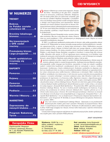 OD WYDAWCY W NUMERZE TRENDY Dobrze, że Polska została członkiem UE.........…4 Bronimy lokalnego biznesu.….……………6 Na inwestycjach z OFE nadal tracimy……............…8 Promujemy biznes i jego przyjaciół……10 Banki spółdzielcze trzymają się mocno....................12 RAPORTY Pomorze.…………....15 Kujawy..….....………30 Pomorze Zachodnie..............41 Podlasie…....……….52 Warmia i Mazury.….62 MARKETING Zapraszamy do naszych klubów…...74 Program Rabatowy Tęcza.……...............75 ddajemy w Państwa ręce czwarty numer magazynu „Europejska Firma”. Nazwaliśmy go tak, gdyż słowo „europejska” oznacza też nowoczesna, cywilizowana, kulturalna, ekologiczna. Od 6 lat każda polska firma jest jednocześnie europejska, gdyż nasz kraj jest członkiem Wspólnoty Europejskiej, a przedsiębiorstwa u nas działające muszą spełniać wysokie wymagania dotyczące ekologii, norm bezpieczeństwa, praw konsumentów. Ważnym elementem jest również działanie naszych firm na obszarze chronionym barierami celnymi i administracyjnymi ustanawianymi przez UE. W tym sensie każda firma działająca na tym terytorium jest firmą europejską, a podmioty z innych obszarów celnych są obce, bo konkurencyjne. W działaniach Komisji Europejskiej można wyraźnie dostrzec takie rozróżnienie. Dba ona o nasze firmy jak o własne. Chroni je cłami np. przed produktami z Chin, sprzedawanymi po dumpingowych cenach. Wspiera też rozwój europejskich przedsiębiorstw dotacjami. W 2002 r. na publicznych spotkaniach przekonywałem do korzyści, jakie polska gospodarka odniesie z akcesji do UE. Wskazywałem na zmianę wizerunku naszego państwa wśród przedsiębiorców i menedżerów zagranicznych firm, co sprawi, że chętniej będą inwestowali w Polsce. Podkreślałem znaczenie zniesienia barier celnych z krajami, do których trafia duża część naszego eksportu, co ułatwi polskim firmom wymianę handlową. Za istotną uważałem również możliwość podjęcia legalnej pracy przez Polaków w wielu krajach Europy Zachodniej, szczególnie że bezrobocie w naszym kraju było wówczas wielkie. Zdawałem sobie sprawę, że UE jest organizacją mocno etatystyczną, że jej biurokraci mają tendencję do narzucania swoich pomysłów samodzielnym państwom, a część ich koncepcji jest niemądra. Korzyści z akcesji Polski do Wspólnoty miały jednak być większe. I tak się stało. ngerencje urzędników na rynku z reguły nie są dobre. Globalny krach gospodarczy, z którym mamy do czynienia, pokazuje jednak, że czasami bywają potrzebne. Analizując przyczyny kłopotów amerykańskiej gospodarki, szybko rosnącego tam bezrobocia, zauważyłem, że mają one związek z upadkiem małych i średnich firm handlowych i produkcyjnych, które nie wytrzymały w starciu z wielkimi koncernami i konkurencją z krajów niskokosztowych. Ewidentnie zaszkodziła im ekspansja wielkich sieci handlowych, które nie chcą na swoich półkach produktów lokalnych czy regionalnych firm, lecz wolą te dostarczane przez wielkie koncerny i reklamowane w telewizjach. Małe i średnie firmy handlowe i produkcyjne oraz miejsca pracy w nich niszczone są przez naturalne procesy gospodarcze związane z rozwojem technologii i wzrostem wydajności pracy. Jako liberałowi trudno było mi przekonywać do ingerowania w tę biznesową walkę. Zagrożenia związane z oligarchizacją gospodarki dla społeczeństwa i demokracji są jednak tak wielkie, że gdy je dostrzegłem jesienią 2008 r., zdecydowałem stanąć w obronie lokalnego biznesu. Przyszło mi to dość łatwo, gdyż od 6 lat zabiegam o interesy lokalnych banków spółdzielczych, których klientami są małe i średnie firmy, a od czterech lat wydaję magazyn „Europejski Bank Spółdzielczy”. W październiku 2008 r. ogłosiłem powstanie Instytutu Lokalnego Biznesu. Na razie to bardziej projekt marketingowy niż badawczy. Z jego pomocą chcę przekonywać do ochrony interesów lokalnych firm i banków, głównie po to, by chronić realne miejsca pracy w biznesie. Do swoich koncepcji przekonuję w Internecie na stronach www.ilb.edu.pl, www.ibs.edu.pl, www.europejskafirma.pl, w magazynach „Europejska Firma” i „Europejski Bank Spółdzielczy” oraz na konferencjach. O hamowaniu ekspansji hipermarketów dyskutowałem z prof. Grzegorzem W. Kołodką na naszym III Kongresie Zarządzania Należnościami w grudniu 2008 r. ówię o tym również na Konferencjach Lokalnego Biznesu. Zapraszamy na nie przedstawicieli dynamicznych firm, banków, gmin miast i powiatów. Promujemy też przyjaciół biznesu. Słowo „biznes” w czasach kryzysu nie jest dobrze kojarzone. Niesłusznie, bo tylko dynamiczne, dobrze zarządzane firmy i banki mogą wyciągnąć nas z kryzysu, stworzyć realne miejsca pracy i zapewnić zrównoważony rozwój w przyszłości. Czwarty numer naszego magazynu trafi głównie do najdynamiczniejszych firm, banków spółdzielczych oraz urzędów gmin, miast i powiatów Polski północnej. JERZY KRAJEWSKI Europejska Firma Ogólnopolski Magazyn Instytutu Lokalnego Biznesu Nr 1 (4) POLSKA PÓŁNOCNA MARZEC 2010 Wydawca: ULAN Sp. z o.o. Adres redakcji i wydawcy: 05-270 Marki ul. Świerkowa 2a tel./faks (22) 77 14 200 www.europejskafirma.pl Red. naczelny: Jerzy Krajewski e-mail: [email protected] Skład: Jacek Niespodziany Druk: ArtDruk, Kobyłka Nakład: 3000 egz. e-mail: [email protected] Europejska Firma str.3