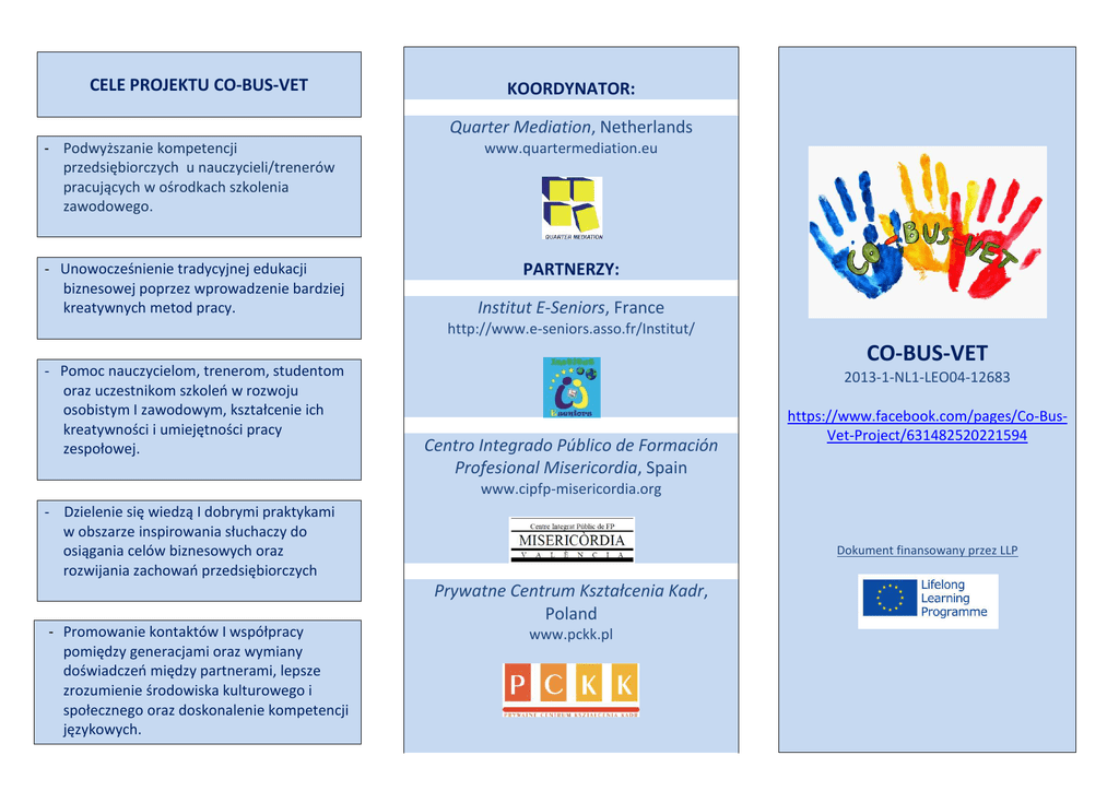 CELE PROJEKTU CO-BUS-VET KOORDYNATOR: Quarter Mediation, Netherlands - Podwyższanie kompetencji przedsiębiorczych u nauczycieli/trenerów pracujących w ośrodkach szkolenia zawodowego. www.quartermediation.eu - Unowocześnienie tradycyjnej edukacji biznesowej poprzez wprowadzenie bardziej kreatywnych metod pracy. PARTNERZY: Institut E-Seniors, France http://www.e-seniors.asso.fr/Institut/ - Pomoc nauczycielom, trenerom, studentom oraz uczestnikom szkoleń w rozwoju osobistym I zawodowym, kształcenie ich kreatywności i umiejętności pracy zespołowej. CO-BUS-VET 2013-1-NL1-LEO04-12683 Centro Integrado Público de Formación Profesional Misericordia, Spain https://www.facebook.com/pages/Co-BusVet-Project/631482520221594 www.cipfp-misericordia.org - Dzielenie się wiedzą I dobrymi praktykami w obszarze inspirowania słuchaczy do osiągania celów biznesowych oraz rozwijania zachowań przedsiębiorczych - Promowanie kontaktów I współpracy pomiędzy generacjami oraz wymiany doświadczeń między partnerami, lepsze zrozumienie środowiska kulturowego i społecznego oraz doskonalenie kompetencji językowych. Dokument finansowany przez LLP Prywatne Centrum Kształcenia Kadr, Poland www.pckk.pl Program uczenie się przez całe życie LLP CO-BUS-VET Program LLP jest to najwiekszy europejski program edukacyjny, promujący wymianę uczniów i nauczycieli we wszystkich grupach wiekowych oraz współpracę europejskich instytucji edukacyjnych. Projekt „Porównanie metod rozwijania przedsiębiorczości w kształceniu zawodowym w krajach Unii Europejskiej oraz zastosowanie dobrych praktyk w szkołach zawodowych i instytucjach kształcenia zawodowego.” Jest realizowany w ramach programu Leonardo da Vinci od sierpnia 2013 roku do lipca 2015 r. Projekt realizowany jest w partnerstwie czterech europejskich instytucji edukacyjnych: Quarter Mediation z Holandii, Institut E-Seniore z Francji, Prywatne Centrum Kształcenia z Polski i Centro Integrado Publico de Formacion Profesional Misericordia z Hiszpanii. Realizowany jest z Funduszy Europejskich w latach 2007-2013. Program wspiera realizację celów Deklaracji Kopenhaskiej w zakresie kształcenia zawodowego i procesu bolońskiego w szkolnictwie wyższym. Program Leonardo da Vinci Program Leonardo da Vinci koncentruje się na edukacji i szkoleniu zawodowym. Jego działania kierowane są do: uczniów szkół zawodowych, stażystów, nauczycieli zawodu, trenerów, przedsiębiorców, partnerów społecznych oraz wszystkich instytucji edukacyjnych powiązanych z rynkiem pracy CO-BUS-VET PODSUMOWANIE PROJEKTU Projekt ma na celu podniesienie kompetencji nauczycieli przedsiębiorczości oraz przygotowanie materiałów pozwalających na wprowadzenia bardziej kreatywnych metod pracy na lekcjach przedsiębiorczości. W tym celu planowane są następujące działania: - przygotowanie prezentacji pokazujących przykłady współpracy szkół zawodowych i instytucji szkoleniowych z rynkiem pracy w krajach partnerskich - prezentacja przykładów dobrych praktyk doskonalenia przedsiębiorczości stosowanych w instytucjach partnerskich - warsztaty wykorzystania gier w edukacji biznesowej - debata na temat „Osobiste i zawodowe predyspozycje człowieka odnoszącego sukces w biznesie”.