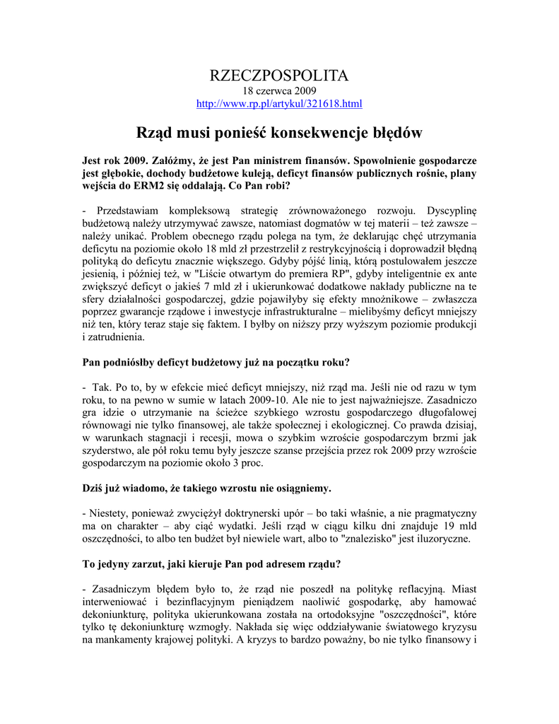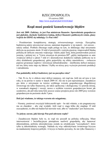 RZECZPOSPOLITA 18 czerwca 2009 http://www.rp.pl/artykul/321618.html Rząd musi ponieść konsekwencje błędów Jest rok 2009. Załóżmy, że jest Pan ministrem finansów. Spowolnienie gospodarcze jest głębokie, dochody budżetowe kuleją, deficyt finansów publicznych rośnie, plany wejścia do ERM2 się oddalają. Co Pan robi? - Przedstawiam kompleksową strategię zrównoważonego rozwoju. Dyscyplinę budżetową należy utrzymywać zawsze, natomiast dogmatów w tej materii – też zawsze – należy unikać. Problem obecnego rządu polega na tym, że deklarując chęć utrzymania deficytu na poziomie około 18 mld zł przestrzelił z restrykcyjnością i doprowadził błędną polityką do deficytu znacznie większego. Gdyby pójść linią, którą postulowałem jeszcze jesienią, i później też, w "Liście otwartym do premiera RP", gdyby inteligentnie ex ante zwiększyć deficyt o jakieś 7 mld zł i ukierunkować dodatkowe nakłady publiczne na te sfery działalności gospodarczej, gdzie pojawiłyby się efekty mnożnikowe – zwłaszcza poprzez gwarancje rządowe i inwestycje infrastrukturalne – mielibyśmy deficyt mniejszy niż ten, który teraz staje się faktem. I byłby on niższy przy wyższym poziomie produkcji i zatrudnienia. Pan podniósłby deficyt budżetowy już na początku roku? - Tak. Po to, by w efekcie mieć deficyt mniejszy, niż rząd ma. Jeśli nie od razu w tym roku, to na pewno w sumie w latach 2009-10. Ale nie to jest najważniejsze. Zasadniczo gra idzie o utrzymanie na ścieżce szybkiego wzrostu gospodarczego długofalowej równowagi nie tylko finansowej, ale także społecznej i ekologicznej. Co prawda dzisiaj, w warunkach stagnacji i recesji, mowa o szybkim wzroście gospodarczym brzmi jak szyderstwo, ale pół roku temu były jeszcze szanse przejścia przez rok 2009 przy wzroście gospodarczym na poziomie około 3 proc. Dziś już wiadomo, że takiego wzrostu nie osiągniemy. - Niestety, ponieważ zwyciężył doktrynerski upór – bo taki właśnie, a nie pragmatyczny ma on charakter – aby ciąć wydatki. Jeśli rząd w ciągu kilku dni znajduje 19 mld oszczędności, to albo ten budżet był niewiele wart, albo to "znalezisko" jest iluzoryczne. To jedyny zarzut, jaki kieruje Pan pod adresem rządu? - Zasadniczym błędem było to, że rząd nie poszedł na politykę reflacyjną. Miast interweniować i bezinflacyjnym pieniądzem naoliwić gospodarkę, aby hamować dekoniunkturę, polityka ukierunkowana została na ortodoksyjne "oszczędności", które tylko tę dekoniunkturę wzmogły. Nakłada się więc oddziaływanie światowego kryzysu na mankamenty krajowej polityki. A kryzys to bardzo poważny, bo nie tylko finansowy i coraz silniej uwidoczniający się w sferze produkcji, ale teraz przesuwający się do sfery społecznej i politycznej, a z czasem również do ideologicznej, bo to też kryzys wartości, które usiłuje narzucić neoliberalizm. A wracając do gospodarki? To także kryzys nadprodukcji. Problem nie polega na braku surowców, rąk i głów do pracy, technologii, maszyn. Brakuje efektywnego popytu. I z tego wynika oczywisty wniosek dla polityki gospodarczej: trzeba kreować dodatkowy strumień popytu. Niewykorzystanie mocy wytwórczych jest szkodliwe i dewastujące nie tylko doraźnie, ale także długofalowo. Skoro przedsiębiorcy nie mogą ich wykorzystać, to dlaczego mieliby je poszerzać na przyszłość poprzez nowe inwestycje? To bardzo poważne zagrożenie, bo obecny kryzys może odbić się echem dekapitalizacji. I dlatego nadal aktualny jest postulat o naoliwieniu gospodarki, podobnie jak robi to cały rozwinięty świat. Z tym naszym nadwiślańskim neoliberalizmem i właściwym mu doktrynerstwem jesteśmy bardziej rynkowi niż sam rynek. Rząd uważa, że nadmierne zadłużanie doprowadzi do podniesienia rentowności naszych obligacji i wzrostu kosztów obsługi długu. - To niepoważny argument. Nie tylko dlatego, że tu nie chodzi o "nadmierne zadłużanie", tylko o racjonalność makroekonomiczną. I, jak już powiedziałem, to teraz – teraz właśnie! – rząd będzie się dodatkowo zadłużał i już tego argumentu nie usłyszymy. Ale chyba jeszcze nie jest za późno, aby podjąć radykalne kroki i spróbować ożywić gospodarkę? - Trzeba ponieść konsekwencje błędów i zgodzić się na większy deficyt i bezrobocie, niższy PKB i skurczoną bazę podatkową. Można nieco zwiększyć dochody, najłatwiej manipulując przy akcyzach i w tym kierunku z pewnością rząd pójdzie. Jeśli przy tej okazji uda się jeszcze bardziej zracjonalizować pewne grupy wydatków, czy poczynić sensowne oszczędności nie blokujące przedsiębiorczości i bez szkód dla kapitału społecznego, należy to uczynić. Nade wszystko trzeba przygotować sensowny budżet na rok 2010, od razu z projekcją na następne dwa lata. Konieczny jest bowiem tak doraźny interwencjonizm, jak i wydłużenie perspektywy. Podmioty gospodarcze, także partnerzy zagraniczni, powinny znać makroproporcje, co do których utrzymania jest polityczna determinacja. Trzeba też odpowiedzialnie określić rok wejścia Polski do obszaru euro po sfuszerowaniu sprawy z rokiem 2012. Jaka data przyjęcia euro jest realna? - Szkoda, że już do tego nie doszło, choć mogło. Wejście do strefy euro jest sprawą strategiczną. Teraz korona nam z polskiej głowy nie spadnie, jeśli będzie to rok 2015 lub, lepiej, 2013. Najważniejsze wszak jest, przy jakim kursie to się stanie. Konsekwentnie uważam – a głosiłem to także przy kursie 3,20 i 4,90 – że około 4 zł za euro jest kursem właściwym, który stwarza szanse na utrzymywanie długofalowej równowagi 2 zewnętrznej. Brak wiarygodnej informacji w tak kluczowej kwestii destabilizuje oczekiwania, a decyzje ekonomiczne, zwłaszcza inwestycyjne, zawsze na nich są oparte. Brak wiedzy o kształtowaniu się w przyszłości podstawowej ceny w gospodarce, jaką jest kurs narodowej waluty, odbij