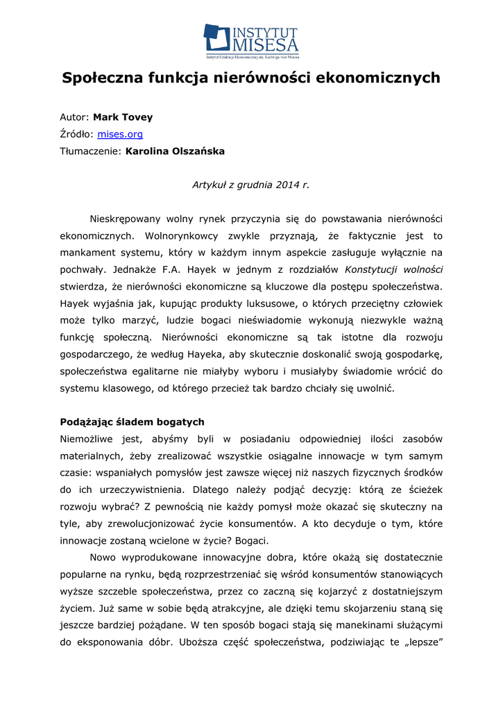 Społeczna funkcja nierówności ekonomicznych Autor: Mark Tovey Źródło: mises.org Tłumaczenie: Karolina Olszańska Artykuł z grudnia 2014 r. Nieskrępowany wolny rynek przyczynia się do powstawania nierówności ekonomicznych. Wolnorynkowcy zwykle przyznają, że faktycznie jest to mankament systemu, który w każdym innym aspekcie zasługuje wyłącznie na pochwały. Jednakże F.A. Hayek w jednym z rozdziałów Konstytucji wolności stwierdza, że nierówności ekonomiczne są kluczowe dla postępu społeczeństwa. Hayek wyjaśnia jak, kupując produkty luksusowe, o których przeciętny człowiek może tylko marzyć, ludzie bogaci nieświadomie wykonują niezwykle ważną funkcję społeczną. Nierówności ekonomiczne są tak istotne dla rozwoju gospodarczego, że według Hayeka, aby skutecznie doskonalić swoją gospodarkę, społeczeństwa egalitarne nie miałyby wyboru i musiałyby świadomie wrócić do systemu klasowego, od którego przecież tak bardzo chciały się uwolnić. Podążając śladem bogatych Niemożliwe jest, abyśmy byli w posiadaniu odpowiedniej ilości zasobów materialnych, żeby zrealizować wszystkie osiągalne innowacje w tym samym czasie: wspaniałych pomysłów jest zawsze więcej niż naszych fizycznych środków do ich urzeczywistnienia. Dlatego należy podjąć decyzję: którą ze ścieżek rozwoju wybrać? Z pewnością nie każdy pomysł może okazać się skuteczny na tyle, aby zrewolucjonizować życie konsumentów. A kto decyduje o tym, które innowacje zostaną wcielone w życie? Bogaci. Nowo wyprodukowane innowacyjne dobra, które okażą się dostatecznie popularne na rynku, będą rozprzestrzeniać się wśród konsumentów stanowiących wyższe szczeble społeczeństwa, przez co zaczną się kojarzyć z dostatniejszym życiem. Już same w sobie będą atrakcyjne, ale dzięki temu skojarzeniu staną się jeszcze bardziej pożądane. W ten sposób bogaci stają się manekinami służącymi do eksponowania dóbr. Uboższa część społeczeństwa, podziwiając te „lepsze” produkty, dostrzega w nich konkretne przedmioty, do których posiadania może dążyć — już wyobraża sobie je w swoich domach. Decyzje konsumpcyjne bogatszej części społeczeństwa nadają formę przyszłości. Nie jest ona już koncepcją czysto abstrakcyjną, a przybiera postać rzeczywistego przedmiotu, którym wedle oczekiwań uboższych konsumentów, kiedyś będą się cieszyć oni sami lub ich dzieci. Oczywiste jest, że intencją bogatych jest wyłącznie zaspokojenie ich własnych, wygórowanych, potrzeb — przeglądając katalogi z produktami wykorzystującymi najnowsze technologie, wcale nie myślą o tym, by nadawać kierunek rozwojowi społecznemu. Mimo to, ubodzy śledzą ich poczynania i pragną podążać szlakiem, który został przez nich wyznaczony. Rola bogatych jest więc jasna: stanowią oni rynek, który nowe i drogie technologie mogą starać się zaspokajać. Ich wydatki są siłą napędową, której potrzebują pionierscy producenci, a biedniejsi dokładnie śledzą dokonywane przez nich wybory, przez co bardziej dostatni styl życia rozprzestrzenia się, zachęcając przedsiębiorców do szukania mniej kosztownych sposobów produkcji danych dóbr oraz ich rozwoju. To z kolei skutkuje tym, że produkt staje się dostępny dla wszystkich. Ostatecznie to decyzje konsumpcyjne bogatych wyznaczają szlak dla tych uboższych. To bogaci kształtują horyzont, ku któremu zmierza społeczeństwo. Dlaczego jest to zjawisko pozytywne? Niniejszy artykuł rozpoczęło stwierdzenie, że ludzie bogaci, rozrzutnie wydając swoje pieniądze, nieświadomie wykonują ważną funkcję w społeczeństwie. Trzeba przyznać, że nie do końca wiadomo, jak można bronić tę tezę. Dlaczego mielibyśmy bardziej cenić stan rzeczy opisany powyżej, w którym to decyzje konsumpcyjne bogatych kierują rozwojem społeczeństwa? Aby docenić funkcję, jaką pełnią w społeczeństwie nierówności społeczne (a więc istnienie bogatych), należy najpierw wyobrazić sobie alternatywny scenariusz, w którym panuje całkowity egalitaryzm. Ministerstwo ds. Badań i Rozwoju To oczywiste, że społeczeństwo egalitarne, którego istnienie według definicji opiera się na braku różnic społecznych, nie zapewniłoby rynku dla rozwijających się, kosztownych, technologii. Dlatego w takim społeczeństwie konsumenci nie napędzaliby rozwoju technologicznego. Bez rynku wyższej klasy, na którym można by je sprzedawać, innowatorzy nie mieliby interesu w ich rozwoju — nie zarobiliby złamanego grosza dopóty, dopóki społeczeństwo nie osiągnęłoby takiego stopnia rozwoju gospodarczego, na którym dostęp do nowoczesnego produktu mieliby zapewniony wszyscy. Większość innowatorów mogłaby nie dożyć tego momentu. Może więc rząd byłby w stanie pomóc rozwiązać ten problem? Załóżmy, że aby tego dokonać, stworzono Ministerstwo ds. Badań i Rozwoju, którego zadaniem jest zapewnienie rządowego sponsorowania innowacji. To właśnie to ministerstwo, pod nieobecność klasy zamożnych, przyznaje nagrody innowatorom, dzięki czemu nie muszą już długo czekać na kompensację ich geniuszu. W ten sposób rola bogatych zostaje całkowicie pominięta — dobra nigdy nie są dostępne wyłącznie dla uprzywilejowanej części społeczeństwa. Rząd zatrudnia grupę innowatorów, których produkty zostaną wprowadzone na rynek dopiero wtedy, gdy wszyscy jego uczestnicy będą mogli sobie na nie pozwolić. Problem polega na ustaleniu, które innowacje zostaną sfinansowane i zrealizowane jako pierwsze. Kto ma podejmować te decyzje? W społeczeństwach, w których występują nierówności społeczne, jest to rola zamożnych. Ich decyzje konsumpcyjne podpowiadają producentom, które dobra luksusowe są najbardziej pożądane. Z perspektywy czasu i z obserwacji tego zjawiska, można stwierdzić, że rzeczywiście to oni są najlepiej wykwalifikowani do podejm