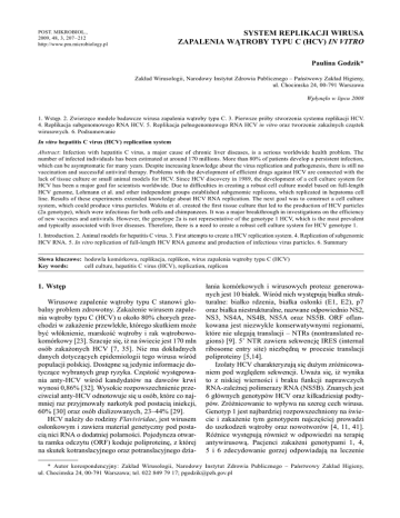 SYSTEM REPLIKACJI WIRUSA ZAPALENIA W¥TROBY TYPU C (HCV) IN VITRO POST. MIKROBIOL., 2009, 48, 3, 207212 http://www.pm.microbiology.pl Paulina Godzik* Zak³ad Wirusologii, Narodowy Instytut Zdrowia Publicznego Pañstwowy Zak³ad Higieny, ul. Chocimska 24, 00-791 Warszawa Wp³ynê³o w lipcu 2008 1. Wstêp. 2. Zwierzêce modele badawcze wirusa zapalenia w¹troby typu C. 3. Pierwsze próby stworzenia systemu replikacji HCV. 4. Replikacja subgenomowego RNA HCV. 5. Replikacja pe³nogenomowego RNA HCV in vitro oraz tworzenie zakanych cz¹stek wirusowych. 6. Podsumowanie In vitro hepatitis C virus (HCV) replication system Abstract: Infection with hepatitis C virus, a major cause of chronic liver diseases, is a serious worldwide health problem. The number of infected individuals has been estimated at around 170 millions. More than 80% of patients develop a persistent infection, which can be asymptomatic for many years. Despite increasing knowledge about the virus replication and pathogenesis, there is still no vaccination and successful antiviral therapy. Problems with the development of efficient drugs against HCV are connected with the lack of tissue culture or small animal models for HCV. Since HCV discovery in 1989, the development of a cell culture system for HCV has been a major goal for scientists worldwide. Due to difficulties in creating a robust cell culture model based on full-length HCV genome, Lohmann et al. and other independent groups established subgenomic replicons, which replicated in hepatoma cell line. Results of these experiments extended knowledge about HCV RNA replication. The next goal was to construct a cell culture system, which could produce virus particles. Wakita et al. created the first tissue culture that led to the production of HCV particles (2a genotype), which were infectious for both cells and chimpanzees. It was a major breakthrough in investigations on the efficiency of new vaccines and antivirals. However, the genotype 2a is not representative of the genotype 1 HCV, which is the most prevalent and typically associated with liver diseases. Therefore, there is a need to create a robust cell culture system for HCV genotype 1. 1. Introduction. 2. Animal models for hepatitis C virus. 3. First attempts to create a HCV replication system. 4. Replication of subgenomic HCV RNA. 5. In vitro replication of full-length HCV RNA genome and production of infectious virus particles. 6. Summary S³owa kluczowe: hodowla komórkowa, replikacja, replikon, wirus zapalenia w¹troby typu C (HCV) Key words: cell culture, hepatitis C virus (HCV), replication, replicon 1. Wstêp Wirusowe zapalenie w¹troby typu C stanowi globalny problem zdrowotny. Zaka¿enie wirusem zapalenia w¹troby typu C (HCV) u oko³o 80% chorych przechodzi w zaka¿enie przewlek³e, którego skutkiem mo¿e byæ w³óknienie, marskoæ w¹troby i rak w¹trobowokomórkowy [23]. Szacuje siê, i¿ na wiecie jest 170 mln osób zaka¿onych HCV [7, 35]. Nie ma dok³adnych danych dotycz¹cych epidemiologii tego wirusa wród populacji polskiej. Dostêpne s¹ jedynie informacje dotycz¹ce wybranych grup ryzyka. Czêstoæ wystêpowania anty-HCV wród kandydatów na dawców krwi wynosi 0,86% [32]. Wysokie rozpowszechnienie przeciwcia³ anty-HCV odnotowuje siê u osób, które co najmniej raz przyjmowa³y narkotyk pod postaci¹ iniekcji, 60% [30] oraz osób dializowanych, 2344% [29]. HCV nale¿y do rodziny Flaviviridae, jest wirusem os³onkowym i zawiera materia³ genetyczny pod postaci¹ nici RNA o dodatniej polarnoci. Pojedyncza otwarta ramka odczytu (ORF) koduje poliproteinê, z której na skutek kotranslacyjnego oraz potranslacyjnego dzia- ³ania komórkowych i wirusowych proteaz generowanych jest 10 bia³ek. Wród nich wystêpuj¹ bia³ka strukturalne: bia³ko rdzenia, bia³ka os³onki (E1, E2), p7 oraz bia³ka niestrukturalne, nazwane odpowiednio NS2, NS3, NS4A, NS4B, NS5A oraz NS5B. ORF oflankowana jest niezwykle konserwatywnymi regionami, które nie ulegaj¹ translacji NTRs (nontranslated regions) [9]. 5 NTR zawiera sekwencjê IRES (internal ribosome entry site) niezbêdn¹ w procesie translacji poliproteiny [5,14]. Izolaty HCV charakteryzuj¹ siê du¿ym zró¿nicowaniem pod wzglêdem sekwencji. Uwa¿a siê, i¿ wynika to z niskiej wiernoci i braku funkcji naprawczych RNA-zale¿nej polimerazy RNA (NS5B). Znanych jest 6 g³ównych genotypów HCV oraz kilkadziesi¹t podtypów. Zró¿nicowanie to wp³ywa na szereg cech wirusa. Genotyp 1 jest najbardziej rozpowszechniony na wiecie i zaka¿enie tym genotypem najczêciej prowadzi do uszkodzeñ w¹troby oraz nowotworów [4, 11, 41]. Ró¿nice wystêpuj¹ równie¿ w odpowiedzi na terapiê antywirusow¹. Pacjenci zaka¿eni genotypami 1, 4, 5 i 6 zdecydowanie gorzej odpowiadaj¹ na leczenie * Autor korespondencyjny: Zak³ad Wirusologii, Narodowy Instytut Zdrowia Publicznego Pañstwowy Zak³ad Higieny, ul. Chocimska 24, 00-791 Warszawa; tel. 022 849 79 17; [email protected] 208 PAULINA GODZIK interferonem ni¿ chorzy z genotypami 2 i 3 [41, 42]. Bior¹c pod uwagê te fakty system replikacji HCV w liniach komórkowych (system replikacji in vitro) oparty na materiale genetycznym genotypu 1, powinien mieæ najwiêksze znaczenie w prowadzeniu badañ nad terapi¹ antywirusow¹. 2. Zwierzêce modele badawcze HCV Mimo wielu badañ nie uda³o siê stworzyæ skutecznej szczepionki oraz standardów leczenia, które dawa³yby satysfakcjonuj¹ce rezultaty. Eksperymenty s¹ utrudnione ze wzglêdu na brak odpowiedniego modelu zwierzêcego do badañ. Jedynymi zwierzêtami, u których dochodzi do zaka¿enia HCV s¹ szympansy. Przeprowadzanie badañ na ma³pach wi¹¿e siê z jednej strony z bardzo du¿ymi kosztami, a z drugiej strony obarczone jest problemami etycznymi. Dlatego prowadzono eksperymenty w celu uzyskania myszy, które ulega³yby zaka¿eniu przez HCV. M e r c e r wraz ze swoim zespo³em, korzystaj¹c z transgenicznych gryzoni (SCIDmouse; severe combined immunodeficient mice), s
