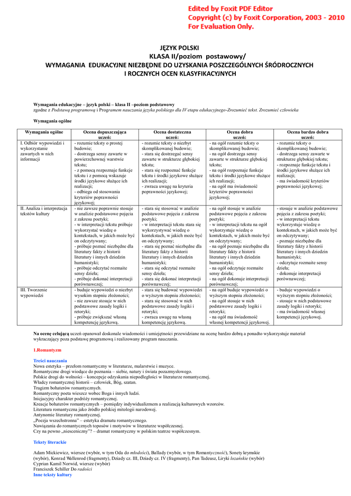 JĘZYK POLSKI KLASA II/poziom postawowy/ WYMAGANIA EDUKACYJNE NIEZBĘDNE DO UZYSKANIA POSZCZEGÓLNYCH ŚRÓDROCZNYCH I ROCZNYCH OCEN KLASYFIKACYJNYCH Wymagania edukacyjne – j zyk polski – klasa II –poziom podstawowy zgodne z Podstaw programow i Programem nauczania j zyka polskiego dla IV etapu edukacyjnego-Zrozumieć tekst. Zrozumieć człowieka Wymagania ogólne Wymagania ogólne I. Odbiór wypowiedzi i wykorzystanie zawartych w nich informacji II. Analiza i interpretacja tekstów kultury III. Tworzenie wypowiedzi Ocena dopuszczaj ca ucze : - rozumie teksty o prostej budowie; - dostrzega sensy zawarte w powierzchownej warstwie tekstu; - z pomoc rozpoznaje funkcje tekstu i z pomoc wskazuje rodki j zykowe słu ce ich realizacji; - odbiega od stosowania kryteriów poprawno ci j zykowejś - nie zawsze poprawnie stosuje w analizie podstawowe poj cia z zakresu poetyki; - w interpretacji tekstu próbuje wykorzystać wiedz o kontekstach, w jakich mo e być on odczytywany; - próbuje poznać niezb dne dla literatury fakty z historii literatury i innych dziedzin humanistyki; - próbuje odczytać rozmaite sensy dziełaś - próbuje dokonać interpretacji porównawczejś - buduje wypowiedzi o niezbyt wysokim stopniu zło ono ciś - nie zawsze stosuje w nich podstawowe zasady logiki i retoryki; - próbuje zwi kszać własn kompetencj j zykow . Ocena dostateczna ucze : - rozumie teksty o niezbyt skomplikowanej budowie; - stara si dostrzegać sensy zawarte w strukturze gł bokiej tekstu; - stara si rozpoznać funkcje tekstu i rodki j zykowe słu ce ich realizacji; - zwraca uwag na kryteria poprawno ci j zykowejś Ocena dobra ucze : - na ogół rozumie teksty o skomplikowanej budowie; - na ogół dostrzega sensy zawarte w strukturze gł bokiej tekstu; - na ogół rozpoznaje funkcje tekstu i rodki j zykowe słu ce ich realizacji; - na ogół ma wiadomo ć kryteriów poprawno ci j zykowejś Ocena bardzo dobra ucze : - rozumie teksty o skomplikowanej budowie; - dostrzega sensy zawarte w strukturze gł bokiej tekstu; - rozpoznaje funkcje tekstu i rodki j zykowe słu ce ich realizacji; - ma wiadomo ć kryteriów poprawno ci j zykowejś - stara si stosować w analizie podstawowe poj cia z zakresu poetyki; - w interpretacji tekstu stara si wykorzystywać wiedz o kontekstach, w jakich mo e być on odczytywany; - stara si poznać niezb dne dla literatury fakty z historii literatury i innych dziedzin humanistyki; - stara si odczytać rozmaite sensy dziełaś - stara si dokonać interpretacji porównawczejś - stara si budować wypowiedzi o wy szym stopniu zło ono ciś - stara si stosować w nich podstawowe zasady logiki i retoryki; - zwraca uwag na własn kompetencj j zykow . - na ogół stosuje w analizie podstawowe poj cia z zakresu poetyki; - w interpretacji tekstu na ogół wykorzystuje wiedz o kontekstach, w jakich mo e być on odczytywany; - na ogół poznaje niezb dne dla literatury fakty z historii literatury i innych dziedzin humanistyki; - na ogół odczytuje rozmaite sensy dziełaś - na ogół dokonuje interpretacji porównawczejś - na ogół buduje wypowiedzi o wy szym stopniu zło ono ciś - na ogół stosuje w nich podstawowe zasady logiki i retoryki; - na ogół ma wiadomo ć własnej kompetencji j zykowej. - stosuje w analizie podstawowe poj cia z zakresu poetyki; - w interpretacji tekstu wykorzystuje wiedz o kontekstach, w jakich mo e być on odczytywany; - poznaje niezb dne dla literatury fakty z historii literatury i innych dziedzin humanistyki; - odczytuje rozmaite sensy dziełaś - dokonuje interpretacji porównawczejś - buduje wypowiedzi o wy szym stopniu zło ono ciś - stosuje w nich podstawowe zasady logiki i retoryki; - ma wiadomo ć własnej kompetencji j zykowej. Na ocen celuj c ucze opanował doskonale wiadomo ci i umiej tno ci przewidziane na ocen bardzo dobr a ponadto wykorzystuje materiał wykraczaj cy poza podstaw programow i realizowany program nauczania. 1.Romantyzm Tre ci nauczania Nowa estetyka – przełom romantyczny w literaturze, malarstwie i muzyce. Romantyczne drogi wiod ce do poznania – siebie, natury i wiata pozazmysłowego. Polskie drogi do wolno ci – koncepcje odzyskania niepodległo ci w literaturze romantycznej. Władcy romantycznej historii – człowiek, Bóg, szatan. Tragizm bohaterów romantycznych. Romantyczny poeta wieszcz wobec Boga i innych ludzi. Inicjacyjny charakter podró y romantycznej. Kreacje bohaterów romantycznych – pomi dzy indywidualizmem a realizacj kulturowych wzorców. Literatura romantyczna jako ródło polskiej mitologii narodowej. Antynomie literatury romantycznej. „Poezja wszechstronna” – estetyka dramatu romantycznego. Nawi zania do romantycznych toposów i motywów w literaturze współczesnej. Czy na pewno „niesceniczny”? – dramat romantyczny w polskim teatrze współczesnym. Teksty literackie Adam Mickiewicz, wiersze (wybór, w tym Oda do młodo ci), Ballady (wybór, w tym Romantyczno ć), Sonety krymskie (wybór), Konrad Wallenrod (fragmenty), Dziady cz. III, Dziady cz. IV (fragmenty), Pan Tadeusz, Liryki loza skie (wybór) Cyprian Kamil Norwid, wiersze (wybór) Franciszek Schiller Do rado ci Inne teksty kultury Caspar David Friedrich Skały kredowe na Rugii Georg Wilhelm Friedrich Hegel Wykłady z filozofii dziejów (fragmenty) Tadeusz Konwicki La wa Georges Bizet Carmen Maria Janion Niesamowita słowia szczyzna (fragmenty) Maria Janion Makia welizm Dialog z przeszło ci Julian Tuwim mierć Jarosław Iwaszkiewicz Do prawnuczki Anna Kamie ska Pro ba Andrzej Bursa Poeta Poj cia kluczowe romantyzm, irracjonalizm, ludowo ć, historyzm, orientalizm, pejza duszy, pielgrzymka, egotyzm, wallenrodyzm, bajronizm, makiawelizm, prometeizm, mesjanizm, martyrologia,, rewolucja, historiozofia, indywidualizm, bohater werteryczny, wieszcz, mit arkadyjski, powie ć epistolarna oda, ballada, legenda, list poetycki, rapsod, dramat romantyczny, kompozycja otwarta, synkretyzm, improwizacja, epopeja romantyczna, idealizacja, e