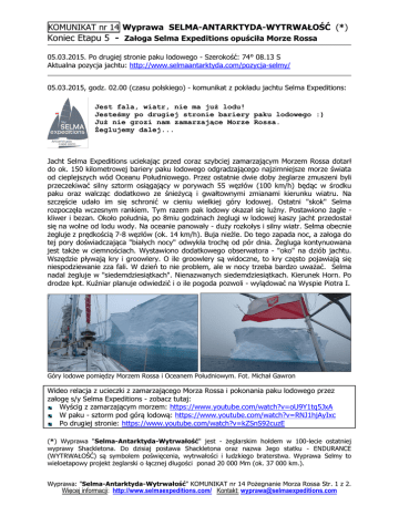KOMUNIKAT nr 14 Wyprawa SELMA-ANTARKTYDA-WYTRWAŁOŚĆ (*) Koniec Etapu 5 - Załoga Selma Expeditions opuściła Morze Rossa 05.03.2015. Po drugiej stronie paku lodowego - Szerokość: 74° 08.13 S Aktualna pozycja jachtu: http://www.selmaantarktyda.com/pozycja-selmy/ 05.03.2015, godz. 02.00 (czasu polskiego) - komunikat z pokładu jachtu Selma Expeditions: Jest fala, wiatr, nie ma już lodu! Jesteśmy po drugiej stronie bariery paku lodowego :) Już nie grozi nam zamarzające Morze Rossa. Żeglujemy dalej... Jacht Selma Expeditions uciekając przed coraz szybciej zamarzającym Morzem Rossa dotarł do ok. 150 kilometrowej bariery paku lodowego odgradzającego najzimniejsze morze świata od cieplejszych wód Oceanu Południowego. Przez ostatnie dwie doby żeglarze zmuszeni byli przeczekiwać silny sztorm osiągający w porywach 55 węzłów (100 km/h) będąc w środku paku oraz walcząc dodatkowo ze śnieżycą i gwałtownymi zmianami kierunku wiatru. Na szczęście udało im się schronić w cieniu wielkiej góry lodowej. Ostatni "skok" Selma rozpoczęła wczesnym rankiem. Tym razem pak lodowy okazał się luźny. Postawiono żagle kliwer i bezan. Około południa, po 8miu godzinach żeglugi w lodowej kaszy jacht przedostał się na wolne od lodu wody. Na oceanie panowały - duży rozkołys i silny wiatr. Selma obecnie żegluje z prędkością 7-8 węzłów (ok. 14 km/h). Buja nieźle. Do tego zapada noc, a załoga do tej pory doświadczająca "białych nocy" odwykła trochę od pór dnia. Żegluga kontynuowana jest także w ciemnościach. Wystawiono dodatkowego obserwatora - "oko" na dziób jachtu. Wszędzie pływają kry i groowlery. O ile groowlery są widoczne, to kry często pojawiają się niespodziewanie zza fali. W dzień to nie problem, ale w nocy trzeba bardzo uważać. Selma nadal żegluje w "siedemdziesiątkach". Nienazwanych siedemdziesiątkach. Kierunek Horn. Po drodze kpt. Kuźniar planuje odwiedzić i o ile pogoda pozwoli - wylądować na Wyspie Piotra I. Góry lodowe pomiędzy Morzem Rossa i Oceanem Południowym. Fot. Michał Gawron Wideo relacja z ucieczki z zamarzającego Morza Rossa i pokonania paku lodowego przez załogę s/y Selma Expeditions - zobacz tutaj: Wyścig z zamarzającym morzem: https://www.youtube.com/watch?v=oU9Y1tq5JxA W paku - sztorm pod górą lodową: https://www.youtube.com/watch?v=RNJ1hjAyIxc Po drugiej stronie: https://www.youtube.com/watch?v=kZSnS92cuzE (*) Wyprawa "Selma-Antarktyda-Wytrwałość" jest - żeglarskim hołdem w 100-lecie ostatniej wyprawy Shackletona. Do dzisiaj postawa Shackletona oraz nazwa Jego statku - ENDURANCE (WYTRWAŁOŚĆ) są symbolem poświęcenia, wytrwałości i ludzkiego braterstwa. Wyprawa Selmy to wieloetapowy projekt żeglarski o łącznej długości ponad 20 000 Mm (ok. 37 000 km.). Wyprawa: "Selma-Antarktyda-Wytrwałość" KOMUNIKAT nr 14 Pożegnanie Morza Rossa Str. 1 z 2. Więcej informacji: http://www.selmaexpeditions.com/ Kontakt: [email protected] KOMUNIKAT nr 14 Wyprawa SELMA-ANTARKTYDA-WYTRWAŁOŚĆ (*) Koniec Etapu 5 - Załoga Selma Expeditions opuściła Morze Rossa Rejs odbywa się śladem Jego antarktycznych ekspedycji sprzed 100 lat. W ramach treningów żeglarskich zrealizowano także pierwsze w historii polskiego żeglarstwa - zimowe opłynięcie Hornu. Polski jacht, po odwiedzeniu w 2013 roku - Georgii Południowej i Wyspy Słoniowej, rozpoczął obecną wyprawę od opłynięcia w kwietniu 2014 Przylądka Horn (ETAP 1). Potem po pokonaniu latem 2014 roku Pacyfiku, szlakiem Jamesa Cooka, z Chile do Australii (ETAP 2), w grudniu 2014 z powodzeniem wziął udział w regatach Rolex Sydney Hobart Yacht Race (ETAP 3). Następnie w styczniu i lutym 2015 (ETAPY 4 i 5) załoga Selmy dotarła na najzimniejsze na Ziemi antarktyczne Morze Rossa dopływając na żaglach do Zatoki Wielorybów, do poz.: 78º43'926 S - zdobywając w ten sposób żeglarski rekord świata - "Najdalej na Południe", a następnie osiągnęła szczyt najwyższego, aktywnego wulkanu na Antarktydzie: EREBUS (3794 m npm) położonego na Wyspie Rossa. Po wydostaniu się z zamarzającego juz Morza Rossa - w nocy 4/5 marca 2015 Selma ponownie wpłynęła na wody Wielkiego Oceanu Południowego i płynąc wzdłuż Antarktydy (ETAP 6) kieruje się do Wyspy Piotra I., a potem do Przylądka Horn. UWAGA: © Publikacja załączonych informacji i materiałów foto i wideo dozwolona nieodpłatnie na wszystkich polach eksploatacji, pod warunkiem podpisania: "Źródło: Selma Expeditions.com". Zgoda nie obejmuje wykorzystania na cele reklamowe. Opracowanie J.J. Cieliszak Koordynator, Media - Wyprawa: SELMA - ANTARKTYDA - WYTRWAŁOŚĆ MediaPartners.pl dla SelmaAntarktyda.com /+48 501-150-007/ Wyprawa: "Selma-Antarktyda-Wytrwałość" KOMUNIKAT nr 14 Pożegnanie Morza Rossa Str. 2 z 2. Więcej informacji: http://www.selmaexpeditions.com/ Kontakt: [email protected]