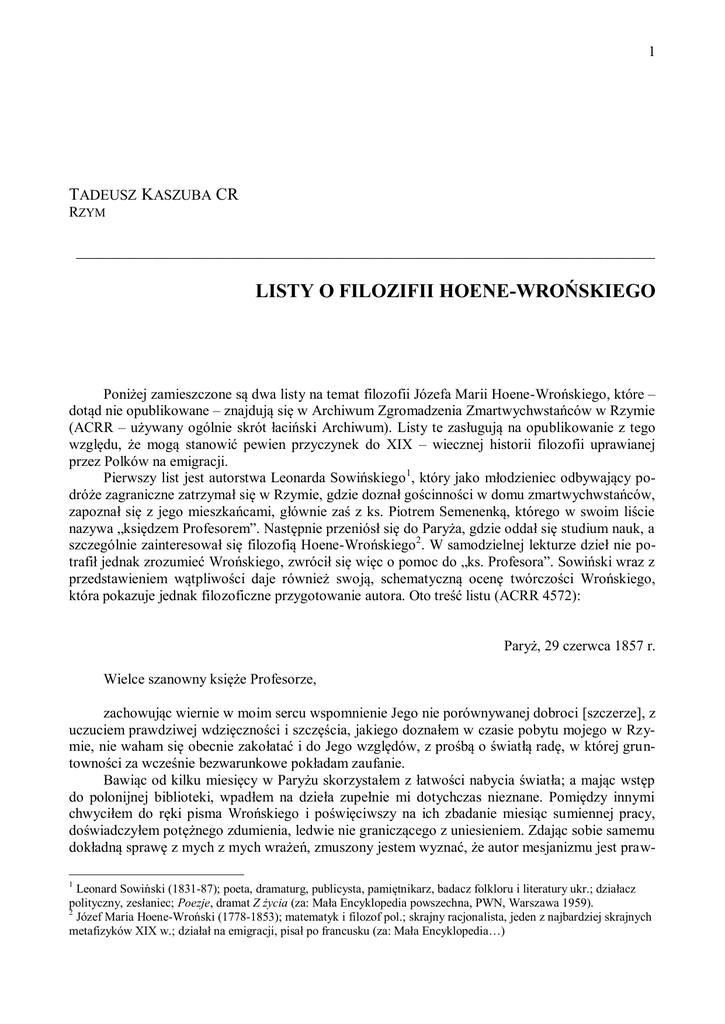 1 TADEUSZ KASZUBA CR RZYM ____________________________________________________________________ LISTY O FILOZIFII HOENE-WROŃSKIEGO Poniżej zamieszczone są dwa listy na temat filozofii Józefa Marii Hoene-Wrońskiego, które – dotąd nie opublikowane – znajdują się w Archiwum Zgromadzenia Zmartwychwstańców w Rzymie (ACRR – używany ogólnie skrót łaciński Archiwum). Listy te zasługują na opublikowanie z tego względu, że mogą stanowić pewien przyczynek do XIX – wiecznej historii filozofii uprawianej przez Polków na emigracji. Pierwszy list jest autorstwa Leonarda Sowińskiego1, który jako młodzieniec odbywający podróże zagraniczne zatrzymał się w Rzymie, gdzie doznał gościnności w domu zmartwychwstańców, zapoznał się z jego mieszkańcami, głównie zaś z ks. Piotrem Semenenką, którego w swoim liście nazywa „księdzem Profesorem”. Następnie przeniósł się do Paryża, gdzie oddał się studium nauk, a szczególnie zainteresował się filozofią Hoene-Wrońskiego2. W samodzielnej lekturze dzieł nie potrafił jednak zrozumieć Wrońskiego, zwrócił się więc o pomoc do „ks. Profesora”. Sowiński wraz z przedstawieniem wątpliwości daje również swoją, schematyczną ocenę twórczości Wrońskiego, która pokazuje jednak filozoficzne przygotowanie autora. Oto treść listu (ACRR 4572): Paryż, 29 czerwca 1857 r. Wielce szanowny księże Profesorze, zachowując wiernie w moim sercu wspomnienie Jego nie porównywanej dobroci [szczerze], z uczuciem prawdziwej wdzięczności i szczęścia, jakiego doznałem w czasie pobytu mojego w Rzymie, nie waham się obecnie zakołatać i do Jego względów, z prośbą o światłą radę, w której gruntowności za wcześnie bezwarunkowe pokładam zaufanie. Bawiąc od kilku miesięcy w Paryżu skorzystałem z łatwości nabycia światła; a mając wstęp do polonijnej biblioteki, wpadłem na dzieła zupełnie mi dotychczas nieznane. Pomiędzy innymi chwyciłem do ręki pisma Wrońskiego i poświęciwszy na ich zbadanie miesiąc sumiennej pracy, doświadczyłem potężnego zdumienia, ledwie nie graniczącego z uniesieniem. Zdając sobie samemu dokładną sprawę z mych z mych wrażeń, zmuszony jestem wyznać, że autor mesjanizmu jest praw1 Leonard Sowiński (1831-87); poeta, dramaturg, publicysta, pamiętnikarz, badacz folkloru i literatury ukr.; działacz polityczny, zesłaniec; Poezje, dramat Z życia (za: Mała Encyklopedia powszechna, PWN, Warszawa 1959). 2 Józef Maria Hoene-Wroński (1778-1853); matematyk i filozof pol.; skrajny racjonalista, jeden z najbardziej skrajnych metafizyków XIX w.; działał na emigracji, pisał po francusku (za: Mała Encyklopedia…) 2 dziwym olbrzymem na polu spekulacji, a nadto, że jest filozofem szczerym. Nie przeczę, że mógł zbłądzić, lecz źródło błędu nie musi wytryskać w sumieniu. Zapewniwszy się w tej ujemnomoralnej wartości doktryny, zwracam uwagę na jej pryncypia i zdaje mi się, że co do rozległości przewyższają one wszystkie dotychczas znane systemata filozoficzne. Uznając drogi zasad względnych powiewające sztandarami wiekuistej sprzeczności i znaków, autor mesjanizmu stawia się od razu na stanowisku, bezwzględnym zamykając w ten sposób uroczysty pochód ludzkiego zamysłu od kosmogonicznego dualizmu Brachmanów i Gymno-sofistów [gymnosofiści – mędrcy gardzący dobrami doczesnymi, wiodący życie ascetyczne] do dydaktycznej determinacji ideału bóstwa filozofii Schellinga. W pojęciu Absolutu Wroński godzi nareszcie odwieczne antynomie Bytu i wiedzy, czyli Jestestwa i Umu, zostawiają poza sobą wszystkich współczesnych myślicieli. Wszak to już stanowi olbrzymie dzieło – lecz nie dość i tego, autor przeobrażenia wiedzy zamierza pogodzić religię z filozofią, filozoficznie uprawnia objawienie, jednoczy prawdę i dobro, i potężną swoją naukę wieńczy swoim moralnym dogmatem człowieka – nieśmiertelnością. Zwracając się ze swoją wszechstronną zasadą na pole prawd społecznych, autor umie pogodzić prawo Boże z prawem ludzkim, nie wyłączając z powagi ani jednego, ani drugiego i przez to ukazuje światu spokojną, nie zmąconą szarpaniem się dwóch sprzecznych stronnictw przyszłości. Nareszcie, wkraczając w sferę scjentyficzną, poszerza o niezmierzoną przestrzeń nauki matematyczne i przyrodnicze, wyzwala je z pęt analitycznej metody i sięga bezwarunkowych pryncypiów wiedzy, dowodząc niezbicie niedołęstwa, tendencji naukowej obecnej. Cały szereg genialnych wynalazków na tym ostatnim polu postawi w przeszłości imię autora mesjanizmu obok imienia Kopernika, z czego niemała sława spłynąć musi na cały naród. Na nieszczęście autor nie tyle jest znany, ile by mu to zasługiwało. Pomiędzy tymi wszystkimi gałęziami nauki Wrońskiego zachodzi ścisła solidarność wspólnej i jedynej zasady, przypuszczam, że wdając się w zastosowania podrzędniejsze, niejeden błąd zakradł się w doktrynę, lecz czy by się nie dały oczyścić te zasady, które mi się wydają ogromnego znaczenia wynalazkiem. Właśnie w tym względzie pragnąłbym posłyszeć zdanie tyle cenionego pana Profesora. Wiem, że Kościół potępi bezwarunkowo parakletyzm Wrońskiego, lecz chciałbym wiedzieć, czy może ocaleć jego ogólną dążność, jego wyłącznie spekulacyjne doświadczenia i ta wielka i płodna genetyczna metoda. Liczę na to, że list mój trafi na przekonanie ustalone księdza Profesora i że jego łaskawa uprzejmość nie pozostawi mnie długo w wątpliwości. Korzystam z obecnej zręczności, ażeby raz jeszcze zapewnić księdza Profesora o głębokim poważaniu z którym pozostaję na zawsze Jego najniższym sługą Leonard Sowiński. Księdzu Kajsiewiczowi załączam wyrazy najgłębszego uszanowania. 1 go Augusta wyjeżdżam z Paryża, jeżeliby trwał w zamiarze pisania do księdza Godlewskiego, to niech będzie łaskaw nadesłać mi list swój pod następującym ad