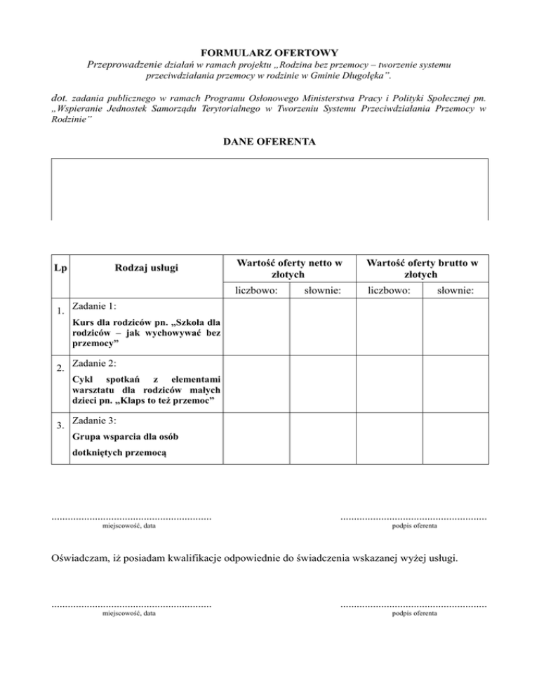 FORMULARZ OFERTOWY Przeprowadzenie działań w ramach projektu „Rodzina bez przemocy – tworzenie systemu przeciwdziałania przemocy w rodzinie w Gminie Długołęka”. dot. zadania publicznego w ramach Programu Osłonowego Ministerstwa Pracy i Polityki Społecznej pn. „Wspieranie Jednostek Samorządu Terytorialnego w Tworzeniu Systemu Przeciwdziałania Przemocy w Rodzinie” DANE OFERENTA Lp Rodzaj usługi Wartość oferty netto w złotych Wartość oferty brutto w złotych liczbowo: liczbowo: słownie: słownie: 1. Zadanie 1: Kurs dla rodziców pn. „Szkoła dla rodziców – jak wychowywać bez przemocy” 2. Zadanie 2: Cykl spotkań z elementami warsztatu dla rodziców małych dzieci pn. „Klaps to też przemoc” 3. Zadanie 3: Grupa wsparcia dla osób dotkniętych przemocą ........................................................... miejscowość, data ...................................................... podpis oferenta Oświadczam, iż posiadam kwalifikacje odpowiednie do świadczenia wskazanej wyżej usługi. ........................................................... miejscowość, data ...................................................... podpis oferenta