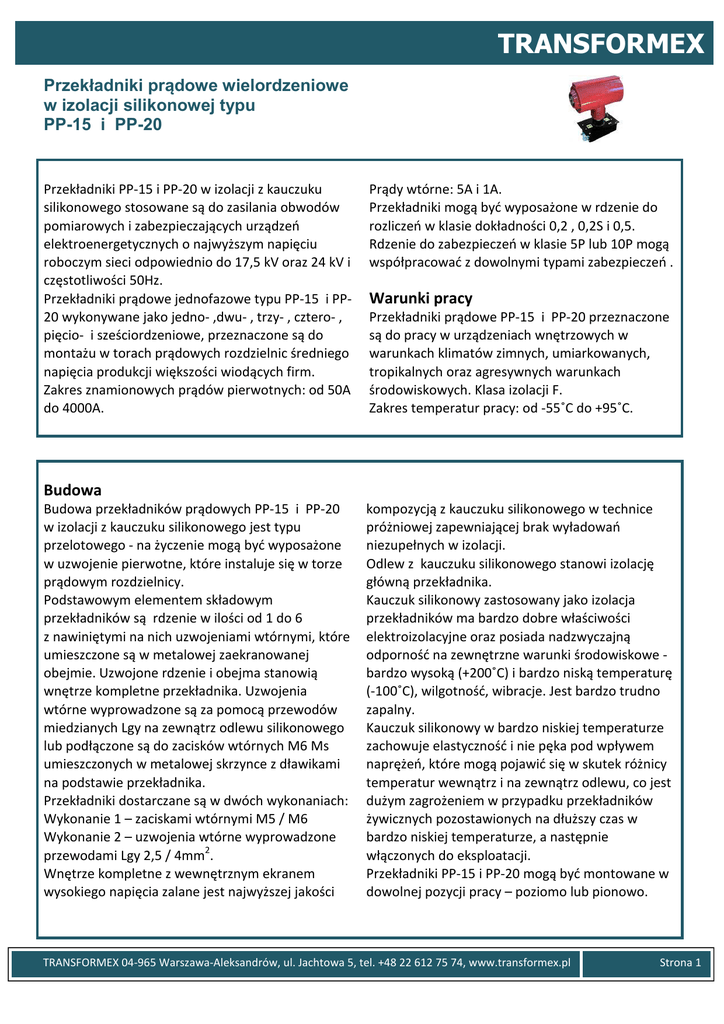TRANSFORMEX Przekładniki prądowe wielordzeniowe w izolacji silikonowej typu PP-15 i PP-20 Przekładniki PP-15 i PP-20 w izolacji z kauczuku silikonowego stosowane są do zasilania obwodów pomiarowych i zabezpieczających urządzeń elektroenergetycznych o najwyższym napięciu roboczym sieci odpowiednio do 17,5 kV oraz 24 kV i częstotliwości 50Hz. Przekładniki prądowe jednofazowe typu PP-15 i PP20 wykonywane jako jedno- ,dwu- , trzy- , cztero- , pięcio- i sześciordzeniowe, przeznaczone są do montażu w torach prądowych rozdzielnic średniego napięcia produkcji większości wiodących firm. Zakres znamionowych prądów pierwotnych: od 50A do 4000A. Prądy wtórne: 5A i 1A. Przekładniki mogą być wyposażone w rdzenie do rozliczeń w klasie dokładności 0,2 , 0,2S i 0,5. Rdzenie do zabezpieczeń w klasie 5P lub 10P mogą współpracować z dowolnymi typami zabezpieczeń . Warunki pracy Przekładniki prądowe PP-15 i PP-20 przeznaczone są do pracy w urządzeniach wnętrzowych w warunkach klimatów zimnych, umiarkowanych, tropikalnych oraz agresywnych warunkach środowiskowych. Klasa izolacji F. Zakres temperatur pracy: od -55˚C do +95˚C. Budowa Budowa przekładników prądowych PP-15 i PP-20 w izolacji z kauczuku silikonowego jest typu przelotowego - na życzenie mogą być wyposażone w uzwojenie pierwotne, które instaluje się w torze prądowym rozdzielnicy. Podstawowym elementem składowym przekładników są rdzenie w ilości od 1 do 6 z nawiniętymi na nich uzwojeniami wtórnymi, które umieszczone są w metalowej zaekranowanej obejmie. Uzwojone rdzenie i obejma stanowią wnętrze kompletne przekładnika. Uzwojenia wtórne wyprowadzone są za pomocą przewodów miedzianych Lgy na zewnątrz odlewu silikonowego lub podłączone są do zacisków wtórnych M6 Ms umieszczonych w metalowej skrzynce z dławikami na podstawie przekładnika. Przekładniki dostarczane są w dwóch wykonaniach: Wykonanie 1 – zaciskami wtórnymi M5 / M6 Wykonanie 2 – uzwojenia wtórne wyprowadzone przewodami Lgy 2,5 / 4mm2. Wnętrze kompletne z wewnętrznym ekranem wysokiego napięcia zalane jest najwyższej jakości kompozycją z kauczuku silikonowego w technice próżniowej zapewniającej brak wyładowań niezupełnych w izolacji. Odlew z kauczuku silikonowego stanowi izolację główną przekładnika. Kauczuk silikonowy zastosowany jako izolacja przekładników ma bardzo dobre właściwości elektroizolacyjne oraz posiada nadzwyczajną odporność na zewnętrzne warunki środowiskowe bardzo wysoką (+200˚C) i bardzo niską temperaturę (-100˚C), wilgotność, wibracje. Jest bardzo trudno zapalny. Kauczuk silikonowy w bardzo niskiej temperaturze zachowuje elastyczność i nie pęka pod wpływem naprężeń, które mogą pojawić się w skutek różnicy temperatur wewnątrz i na zewnątrz odlewu, co jest dużym zagrożeniem w przypadku przekładników żywicznych pozostawionych na dłuższy czas w bardzo niskiej temperaturze, a następnie włączonych do eksploatacji. Przekładniki PP-15 i PP-20 mogą być montowane w dowolnej pozycji pracy – poziomo lub pionowo. TRANSFORMEX 04-965 Warszawa-Aleksandrów, ul. Jachtowa 5, tel. +48 22 612 75 74, www.transformex.pl Strona 1 TRANSFORMEX Transport i magazynowanie Gwarancja Przekładniki PP-15 i PP-20 mogą być transportowane w dowolnej pozycji krytymi środkami transportu w opakowaniu fabrycznym przy odpowiednim unieruchomieniu, zabezpieczającym przed przemieszczaniem i uszkodzeniem. Magazynowanie powinno odbywać się w pomieszczeniach zapewniających ochronę przed zanieczyszczeniami. Najniższa temperatura transportu i przechowywania -55˚C. Producent udziela 36 miesięcznej gwarancji na zakupione przekładniki licząc od daty rozpoczęcia ich eksploatacji, jednak nie dłużej niż 42 miesiące od daty dostawy. Dane techniczne Przekładnik typu PP-15 Najwyższe dopuszczalne napięcie przekładnika Um: Znamionowe napięcie probiercze izolacji 50Hz Up: Znamionowe napięcie probiercze udarowe 1,2/50us Upp: Zakres prądów pierwotnych: 50A – 4000A Prądy wtórne: 5A lub 1A Liczba rdzeni: od 1 do 6 Średnice zewnętrzne odlewów: Ø 145mm, Ø 200mm, Ø 250mm, Ø 280mm Parametry rdzeni pomiarowych* : - moce: od 2,5VA do 90 VA - klasy dokładności: 0,1(S) lub 0,2(S) lub 0,5(S) - liczba przetężeniowa FS: 5 lub 10 Parametry rdzeni do zabezpieczeń* : - moce: od 2,5VA do 90 VA - klasy dokładności: 5P lub 10P - liczba przetężeniowa ALF: od 5 do 50 Zgodność z normą: PN-EN 61869-1:2009, PN-EN 61869-2:2013-06 17,5 kV 38 kV 95 kV PP-20 24 kV 50 kV 125 kV * W zależności od wymaganych parametrów rdzeni i ich liczby po złożeniu zapytania zostanie przedstawiona szczegółowa oferta techniczna Aprobaty i próby Aprobata GUM: PLT 06294 Aprobata GUM: RP T 95 112 Instytut Elektrotechniki w W-wie raport z próby udarowej nr: 36/NWN/95 Instytut Energetyki w W-wie raport z próby typu nr: IEN NUE/32/E/95/a Instytut Elektrotechniki w W-wie raport nr: IEL 002/LWN-SBM/96 Instytut Energetyki w W-wie raport nr: EWP/39/E/2004 Przykład zapytania/zamówienia: Przekładnik prądowy typu PP-15-4 800/5/5/5/5A Ith=30kA I 10VA klasa 0,5 FS5 II 10VA klasa 0,5 FS5 III 20VA klasa 5P ALF10 IV 20VA klasa 5P ALF10 Transformex Sp. z o.o. zastrzega sobie prawo do dokonywania zmian technicznych bądź modyfikacji zawartości niniejszego dokumentu bez uprzedniego powiadamiania. W przypadku zamówień obowiązywać będą uzgodnione warunki. Transformex Sp. z o.o. nie ponosi żadnej odpowiedzialności za potencjalne błędy lub możliwe braki informacji w tym dokumencie. Zastrzegamy wszelkie prawa do niniejszego dokumentu i jego tematyki oraz zawartych w nim zdjęć i ilustracji. TRANSFORMEX 04-965 Warszawa-Aleksandrów, ul. Jachtowa 5, tel. +48 22 612 75 74, www.transformex.pl Strona 2 TRANSFORMEX TRANSFORMEX 04-965 Warszawa-Aleksandrów, ul. Jachtowa 5, tel. +48 22 612 75 74, www.transformex.pl Strona 3