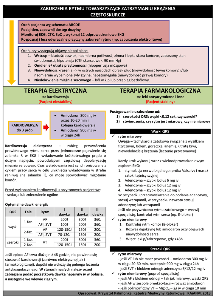 ZABURZENIA RYTMU TOWARZYSZĄCE ZATRZYMANIU KRĄŻENIA CZĘSTOSKURCZE Oceń pacjenta wg schematu ABCDE Podaj tlen, zapewnij dostęp dożylny Monitoruj EKG, CTK, SpO2, wykonaj 12 odprowadzeniowe EKG Rozpoznaj i lecz odwracalne przyczyny zaburzeń rytmu (np. zaburzenia elektrolitowe) Oceń, czy występują objawy niepokojące: 1. Wstrząs – bladość powłok, nadmierna potliwość, zimna i lepka skóra kończyn, zaburzony stan świadomości, hipotensja (CTK skurczowe < 90 mmHg) 2. Omdlenie/ utrata przytomności (hipoperfuzja mózgowa) 3. Niewydolność krążenia => w ostrych epizodach obrzęk płuc (niewydolność lewej komory) i/lub nadmiernie wypełnione żyły szyjne, hepatomegalia (niewydolność prawej komory) 4. Niedokrwienie mięśnia sercowego – ból w klp lub przebieg bezbólowy. TERAPIA ELEKTRYCZNA TERAPIA FARMAKOLOGICZNA => kardiowersja (Pacjent niestabilny) => leki antyarytmiczne i inne (Pacjent stabilny) Postępowanie uzaleznione od: 1) szerokości QRS; wąski <0,12 sek, czy szeroki? 2) stwierdzenia, czy rytm jest miarowy, czy niemiarowy KARDIOWERSJA do 3 prób Amiodaron 300 mg iv przez 10-20 min i kolejna kardiowersja Amiodaron 900 mg iv w ciągu 24h Kardiowersja elektryczna – zabieg przywrócenia prawidłowego rytmu serca przez jednoczesne pojawienie się załamka R w EKG i wyładowanie krótkotrwałego prądu o dużym napięciu, powodującym częściową depolaryzację mięśnia sercowego.Czas wyładowania jest synchronizowany z cyklem pracy serca w celu uniknięcia wyładowania w strefie ranliwej (na załamku T), co może spowodować migotanie komór. Przed wykonaniem kardiowersji u przytomnych pacjentów: - sedacja lub znieczulenie ogólne Optymalne dawki energii: QRS Fale 1-faz. wąski 2-faz. szeroki 1-faz. 2-faz. Rytm AF AFI, SVT AF AFI, SVT VT I dawka 200J 100J 120-150J 70-120J 200J 120-150J II dawka 300J 200J 150J 150J 300J 150J III dawka 360J 360J 200J 200J 360J 200J Wąski QRS rytm miarowy Uwaga – tachykardia zatokowa związana z wysiłkiem fizycznym, bólem, gorączką, anemią, utratą krwi, niewydolnością krążenia (leczenie przyczynowe) Każdy krok wykonuj wraz z wieloodprowadzeniowym zapisem EKG: 1. stymulacja nerwu błędnego: próba Valsalvy i masaż zatoki tętnicy szyjnej 2. Adenozyna – szybki bolus 6 mg iv 3. Adenozyna – szybki bolus 12 mg iv 4. Adenozyna – szybki bolus 12 mg iv W przypadku przeciwwskazania do podania adenozyny, stosuj werapamil, w przypadku nawrotu stosuj adenozynę lub werapamil Jeśli nie przywrócono rytmu zatokowego – wezwij specjalistę, kontroluj rytm serca (np. ß-bloker) rytm niemiarowy 1. Kontroluj rytm komór (ß-bloker) 2. Rozważ digoksynę lub amiodaron przy objawach niewydolności serca 3. Włącz leki p/zakrzepowe, gdy >48h Szeroki QRS rytm miarowy Jeśli epizod AF trwa dłużej niż 48 godzin, nie powinno się - jeśli VT lub nie masz pewności – Amiodaron 300 mg iv stosować kardiowersji (zarówno elektrycznej jak i w ciągu 20-60 min, nastepnie 900 mg w ciągu 24h farmakologicznej), dopóki nie wdroży się pełnego leczenia - jeśli SVT z blokiem odnogi: adenozyna 6/12/12 mg iv antykoagulacyjnego. W stanach nagłych należy przed rytm niemiarowy (poproś specjalistę) zabiegiem podać początkową dawkę heparyny iv w bolusie, - jeśli AF z blokiem odnogi – tak jak miarowy, wąski QRS a następnie we wlewie ciągłym. - jeśli AF w zespole preekscytacji – rozważ amiodaron - jeśli polimorficzny VT – MgSO4 – 2g iv w ciagu 10 min Opracował: Krzysztof Palimonka, Katedra Medycyny Ratunkowej, KAiAFM, 2013