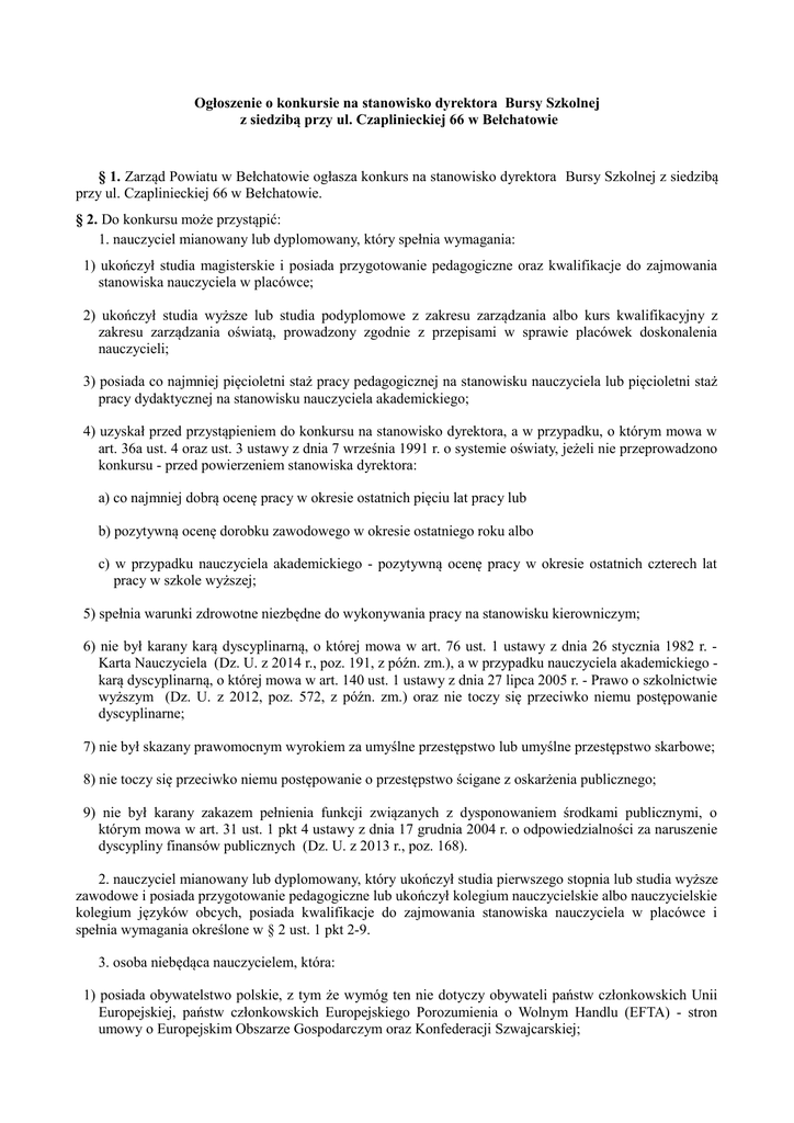 Ogłoszenie o konkursie na stanowisko dyrektora Bursy Szkolnej z siedzibą przy ul. Czaplinieckiej 66 w Bełchatowie § 1. Zarząd Powiatu w Bełchatowie ogłasza konkurs na stanowisko dyrektora Bursy Szkolnej z siedzibą przy ul. Czaplinieckiej 66 w Bełchatowie. § 2. Do konkursu może przystąpić: 1. nauczyciel mianowany lub dyplomowany, który spełnia wymagania: 1) ukończył studia magisterskie i posiada przygotowanie pedagogiczne oraz kwalifikacje do zajmowania stanowiska nauczyciela w placówce; 2) ukończył studia wyższe lub studia podyplomowe z zakresu zarządzania albo kurs kwalifikacyjny z zakresu zarządzania oświatą, prowadzony zgodnie z przepisami w sprawie placówek doskonalenia nauczycieli; 3) posiada co najmniej pięcioletni staż pracy pedagogicznej na stanowisku nauczyciela lub pięcioletni staż pracy dydaktycznej na stanowisku nauczyciela akademickiego; 4) uzyskał przed przystąpieniem do konkursu na stanowisko dyrektora, a w przypadku, o którym mowa w art. 36a ust. 4 oraz ust. 3 ustawy z dnia 7 września 1991 r. o systemie oświaty, jeżeli nie przeprowadzono konkursu - przed powierzeniem stanowiska dyrektora: a) co najmniej dobrą ocenę pracy w okresie ostatnich pięciu lat pracy lub b) pozytywną ocenę dorobku zawodowego w okresie ostatniego roku albo c) w przypadku nauczyciela akademickiego - pozytywną ocenę pracy w okresie ostatnich czterech lat pracy w szkole wyższej; 5) spełnia warunki zdrowotne niezbędne do wykonywania pracy na stanowisku kierowniczym; 6) nie był karany karą dyscyplinarną, o której mowa w art. 76 ust. 1 ustawy z dnia 26 stycznia 1982 r. Karta Nauczyciela (Dz. U. z 2014 r., poz. 191, z późn. zm.), a w przypadku nauczyciela akademickiego karą dyscyplinarną, o której mowa w art. 140 ust. 1 ustawy z dnia 27 lipca 2005 r. - Prawo o szkolnictwie wyższym (Dz. U. z 2012, poz. 572, z późn. zm.) oraz nie toczy się przeciwko niemu postępowanie dyscyplinarne; 7) nie był skazany prawomocnym wyrokiem za umyślne przestępstwo lub umyślne przestępstwo skarbowe; 8) nie toczy się przeciwko niemu postępowanie o przestępstwo ścigane z oskarżenia publicznego; 9) nie był karany zakazem pełnienia funkcji związanych z dysponowaniem środkami publicznymi, o którym mowa w art. 31 ust. 1 pkt 4 ustawy z dnia 17 grudnia 2004 r. o odpowiedzialności za naruszenie dyscypliny finansów publicznych (Dz. U. z 2013 r., poz. 168). 2. nauczyciel mianowany lub dyplomowany, który ukończył studia pierwszego stopnia lub studia wyższe zawodowe i posiada przygotowanie pedagogiczne lub ukończył kolegium nauczycielskie albo nauczycielskie kolegium języków obcych, posiada kwalifikacje do zajmowania stanowiska nauczyciela w placówce i spełnia wymagania określone w § 2 ust. 1 pkt 2-9. 3. osoba niebędąca nauczycielem, która: 1) posiada obywatelstwo polskie, z tym że wymóg ten nie dotyczy obywateli państw członkowskich Unii Europejskiej, państw członkowskich Europejskiego Porozumienia o Wolnym Handlu (EFTA) - stron umowy o Europejskim Obszarze Gospodarczym oraz Konfederacji Szwajcarskiej; 2) ukończyła studia magisterskie; 3) posiada co najmniej pięcioletni staż pracy, w tym co najmniej dwuletni staż pracy na stanowisku kierowniczym; 4) ma pełną zdolność do czynności prawnych i korzysta z praw publicznych; 5) nie toczy się przeciwko niej postępowanie o przestępstwo ścigane z oskarżenia publicznego lub postępowanie dyscyplinarne; 6) spełnia wymagania określone w § 2 ust. 1 pkt 2, 5, 7 i 9. § 3. Oferty osób przystępujących do konkursu powinny zawierać : 1) uzasadnienie przystąpienia do konkursu wraz z koncepcją funkcjonowania i rozwoju placówki; 2) poświadczoną przez kandydata za zgodność z oryginałem kopię dowodu osobistego lub innego dokumentu potwierdzającego tożsamość oraz poświadczającego obywatelstwo kandydata; 3) życiorys z opisem przebiegu pracy zawodowej, zawierający w szczególności informację o: a) stażu pracy pedagogicznej – w przypadku nauczyciela, b) stażu pracy dydaktycznej – w przypadku nauczyciela akademickiego, c) stażu pracy, w tym stażu pracy na stanowisku kierowniczym – w przypadku osoby niebędącej nauczycielem, 4) oryginały lub poświadczone przez kandydata za zgodność z oryginałem kopie dokumentów potwierdzającyvh posiadanie wymaganego stażu pracy, o którym mowa w pkt 3; 5) oryginały lub poświadczone przez kandydata za zgodność z oryginałem kopie dokumentów potwierdzających posiadanie wymaganego wykształcenia, w tym dyplomu ukończenia studiów wyższych lub świadectwa ukończenia studiów podyplomowych z zakresu zarządzania albo świadectwa ukończenia kursu kwalifikacyjnego z zakresu zarządzania oświatą; 6) zaświadczenie lekarskie o braku przeciwwskazań zdrowotnych do wykonywania pracy na stanowisku kierowniczym wydane przez lekarza medycyny pracy; 7) oświadczenie, że przeciwko kandydatowi nie toczy się postępowanie o przestępstwo ścigane z oskarżenia publicznego lub postępowanie dyscyplinarne; 8) oświadczenie, że kandydat nie był skazany prawomocnym wyrokiem za umyślne przestępstwo lub umyślne przestępstwo skarbowe; 9) oświadczenie, że kandydat nie był karany zakazem pełnienia funkcji związanych z dysponowaniem środkami publicznymi, o którym mowa w art. 31 ust. 1 pkt 4 ustawy z dnia 17 grudnia 2004 r. o odpowiedzialności za naruszenie dyscypliny finansów publicznych (Dz. U. z 2013 r., poz. 168). 10) oświadczenie o dopełnieniu obowiązku, o którym mowa w art. 7 ust. 1 i ust. 3a ustawy z dnia 18 października 2006 r. o ujawnieniu informacji o dokumentach organów bezpieczeństwa państwa z lat 1944 – 1990 oraz treści tych dokumentów (Dz. U. z 2013 r., poz. 1388); 11) oryginał lub poświadczoną przez kandydata za zgodność z oryginałem kopię aktu nadania stopnia nauczyciela mianowanego lub dyplomowanego – w przypadku nauczyciela; 12) oryginał lub poświadczoną przez kandydata za zgodność z or