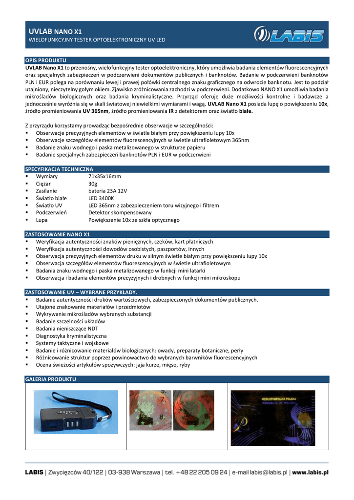 UVLAB NANO X1 WIELOFUNKCYJNY TESTER OPTOELEKTRONICZNY UV LED OPIS PRODUKTU UVLAB Nano X1 to przenośny, wielofunkcyjny tester optoelektroniczny, który umożliwia badania elementów fluorescencyjnych oraz specjalnych zabezpieczeń w podczerwieni dokumentów publicznych i banknotów. Badanie w podczerwieni banknotów PLN i EUR polega na porównaniu lewej i prawej połówki centralnego znaku graficznego na odwrocie banknotu. Jest to podział utajniony, nieczytelny gołym okiem. Zjawisko zróżnicowania zachodzi w podczerwieni. Dodatkowo NANO X1 umożliwia badania mikrośladów biologicznych oraz badania kryminalistyczne. Przyrząd oferuje duże możliwości kontrolne i badawcze a jednocześnie wyróżnia się w skali światowej niewielkimi wymiarami i wagą. UVLAB Nano X1 posiada lupę o powiększeniu 10x, źródło promieniowania UV 365nm, źródło promieniowania IR z detektorem oraz światło białe. Z przyrządu korzystamy prowadząc bezpośrednie obserwacje w szczególności: Obserwacje precyzyjnych elementów w światle białym przy powiększeniu lupy 10x Obserwacje szczegółów elementów fluorescencyjnych w świetle ultrafioletowym 365nm Badanie znaku wodnego i paska metalizowanego w strukturze papieru Badanie specjalnych zabezpieczeń banknotów PLN i EUR w podczerwieni SPECYFIKACJA TECHNICZNA Wymiary 71x35x16mm Ciężar 30g Zasilanie bateria 23A 12V Światło białe LED 3400K Światło UV LED 365nm z zabezpieczeniem toru wizyjnego i filtrem Podczerwień Detektor skompensowany Lupa Powiększenie 10x ze szkła optycznego ZASTOSOWANIE NANO X1 Weryfikacja autentyczności znaków pieniężnych, czeków, kart płatniczych Weryfikacja autentyczności dowodów osobistych, paszportów, innych Obserwacja precyzyjnych elementów druku w silnym świetle białym przy powiększeniu lupy 10x Obserwacja szczegółów elementów fluorescencyjnych w świetle ultrafioletowym Badania znaku wodnego i paska metalizowanego w funkcji mini latarki Obserwacja i badania elementów precyzyjnych i drobnych w funkcji mini mikroskopu ZASTOSOWANIE UV – WYBRANE PRZYKŁADY. Badanie autentyczności druków wartościowych, zabezpieczonych dokumentów publicznych. Utajone znakowanie materiałów i przedmiotów Wykrywanie mikrośladów wybranych substancji Badanie szczelności układów Badania nieniszczące NDT Diagnostyka kryminalistyczna Systemy taktyczne i wojskowe Badanie i różnicowanie materiałów biologicznych: owady, preparaty botaniczne, perły Różnicowanie struktur poprzez powinowactwo do wybranych barwników fluorescencyjnych Ocena świeżości artykułów spożywczych: jaja kurze, mięso, ryby GALERIA PRODUKTU UVLAB NANO X1 WIELOFUNKCYJNY TESTER OPTOELEKTRONICZNY UV LED INSTRUKCJA OBSŁUGI Przyrząd UVLAB NANO X1 przeznaczony jest do kontroli znaków pieniężnych i innych dokumentów. Z przyrządu korzystamy prowadząc bezpośrednie obserwacje jak pokazuje rysunek. Obserwacje precyzyjnych elementów druku w silnym oświetleniu światłem białym przy powiększeniu lupy 10x. (1) Obserwacje szczegółów elementów fluorescencyjnych w świetle ultrafioletowym 365nm. (2) Badanie specjalnych zabezpieczeń w podczerwieni. (3) Badanie znaku wodnego i paska metalizowanego w strukturze papieru za pomocą Nano w roli mini latarki. (1) Istotą posługiwania się przyrządem UVLAB NANO X1 jest obserwacja fragmentu badanego dokumentu w trzech różnych oświetleniach (światło białe, światło ultrafioletowe, podczerwień). Należy przy tym ocenić: dokładność wydruku, kontury krycia, spasowanie farb i fluorescencję, ze zwróceniem szczególnej uwagi na zmienność zachowania się farb fluorescencyjnych w zależności od rodzaju ultrafioletu pobudzającego. Stanowi to namiastkę charakterystyki absorpcyjno-emisyjnej farby, co ma duże znaczenie w ocenie autentyczności badanego fluorochromu. Badanie w podczerwieni polskich banknotów polega na porównaniu lewej i prawej połówki centralnego znaku graficznego na odwrocie banknotu. Jest to podział utajniony, nieczytelny gołym okiem. Zjawisko zróżnicowania zachodzi w podczerwieni. Należy przycisnąć przycisk 3 i przyłożyć przyrząd do banknotu okienkiem obserwacyjnym na przemian do lewej i prawej połówki znaku, obserwując zmianę świecenia czerwonej diody 5 przy wizjerze. Istnieje prawidłowość, że tylko jedna połówka znaku jest aktywna, co sygnalizuje świecenie diody czerwonej. Na przeciwnej połówce dioda przygasa (nawet całkowicie). W polskich banknotach aktywność lewej bądź prawej połówki zależy od nominału i tak: 10 zł aktywna lewa 20 zł aktywna prawa 50 zł aktywna lewa 100 zł aktywna prawa 200 zł aktywna lewa Badanie banknotów Euro przeprowadza się analogicznie pamiętając, że ten znak z utajoną linią podziału znajduje się na głównej stronie banknotu i przedstawia rysunek architektury bramy. Sprowadza się to do tego, że lewa i prawa część bramy reagują w badaniu odmiennie. Przyrząd posiada wbudowane źródło stałoprądowe, które zapewnia stałość jasności świecenia w trakcie zużywania się baterii. Krańcowe wyczerpanie się baterii objawia się spadkiem jasności świecenia lub jego brakiem. Kolorowe prostokąciki na żelku z napisem Nano są w celu pamięciowego skojarzenia funkcji przycisków. W celu lepszego opanowania posługiwania się przyrządem wskazane jest przeprowadzenie obserwacji (ćwiczeń) na autentycznych banknotach, ze zwróceniem szczególnej uwagi na precyzyjne elementy druku i fluorescencji. Montaż baterii: Odkręcić wkręt 4, zdjąć przykrywkę i włożyć baterię zgodnie z etykietą. WARUNKI GWARANCJI Przyrząd posiada 12-miesięczną gwarancje. Gwarancja nie obejmuje baterii, uszkodzeń mechanicznych oraz zostaje unieważniona w przypadku ingerencji w sprzęt. BEZPIECZEŃSTWO Urządzenie klasy 1M. Promieniowanie UV-A uszkadza włókna kolagenowe w skórze, co przyspiesza procesy starzenia. Długotrwała ekspozycja na duże dawki promieniowania UV-A może powodowa
