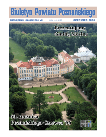 MIESIĘCZNIK NR 6 (72) ROK VII ISSN 1640-3177 CZERWIEC 2006 Prezentujemy Gminę Mosina 50. rocznica Poznańskiego Czerwca ’56 50. rocznica Poznańskiego Czerwca’56 transporterami opancerzonymi. Ofiary czerwca 1956 roku to 74 osoby i 12 rozstrzelanych żołnierzy. W obchody tego jubileuszu włączył się powiat poznański. Relację z przygotowania obrazu Franciszka Starowieyskiego będącego alegorią poznańskich wypadków, przedstawiamy na stronach 38 - 40 BPP. Tomasz Morawski Gabinet Starosty Uroczystość wmurowania aktu erekcyjnego pod budowę kompleksu oświatowego w Baranowie odbyła się 1 czerwca br., a już we wrześniu najprawdopodobniej ruszy przedszkole oraz stołówka. Projekt kompleksu oświatowego w Baranowie opracowano na podstawie koncepcji architektonicznej wybranej już w 2003 roku w drodze konkursu. Budynek przedszkola podzielono na cztery pokoje, z których każdy posiada własną łazienkę, zaplecze oraz osobny taras z wyjściem do ogrodu, gdzie zaprojektowano mały amfiteatr. Latem będzie tam można organizować przedstawienia. Przedszkole posiadać będzie też szklaną oranżerię, która może pełnić funkcję ogrodu zimowego. W przyszłym roku planowane jest oddanie do użytku gimnazjum, jako ostatnia powstanie hala sportowa, której budowę zaplanowano na 2008 rok. Całkowity koszt inwestycji szacowany jest na ponad 20 mln złotych. W uroczystości wmurowania aktu erekcyjnego uczestniczyli przedstawiciele władz gminy i powiatu, kuratorium, dyrektorzy i nauczyciele placówek oświatowych gminy Tarnowo Podgórne oraz mieszkańcy Baranowa. Poświęcenia aktu erekcyjnego dokonał proboszcz parafii, Andrzej Strugarek, zaproszenie na uroczystość przyjął też ksiądz dziekan Jan Szkopek. Pamiątkową tablicę zawiesili wspólnie Piotr Burdajewicz, Foto Starostwo Powiatowe w Poznaniu Wydarzenia czerwca 1956 roku w Poznaniu były pierwszym w PRL-u tak dużym wybuchem niezadowolenia pracujących Polaków. Strajk generalny rozpoczęli 28 czerwca 1956 roku robotnicy Zakładów im. J. W. Stalina w Poznaniu (czyli HCP Poznań) rozgoryczeni warunkami finansowymi – osobom więcej zarabiającym: przodownikom pracy i pracownikom akordowym pobierano niesłusznie przez trzy lata podatek, który pozbawił parę tysięcy pracowników ponad 11 mln. zł. Dyrekcja zakładów nie była w stanie spełnić postulatów wysuwanych przez załogę, dlatego zwrócono się w tej sprawie do rządu. Rozmowy nie dały jednak efektu. Do protestujących przyłączyły się także inne zakłady pracy. Niezadowolenie przerodziło się w manifestację uliczną, a potem w walki zbrojne. Na ulice wyszło ponad sto tysięcy osób. Żądano „chleba i wolności”. Wystąpienie decyzją Biura Politycznego KC PZPR zostało stłumione siłą. W pacyfikacji miasta uczestniczyło ponad dziesięć tysięcy żołnierzy dysponujących m.in. czterysta dwudziestoma czołgami, działami pancernymi i Wmurowanie pamiątkowej tablicy. Foto UG Tarnowo Podgórne Budowa kompleksu oświatowego w Baranowie dyrektor gimnazjum przeźmierowskiego oraz Mariola Auguścik, dyrektor przedszkola w Baranowie, wybrana kilka dni wcześniej w drodze konkursu. Młodzież przeźmierowskiego gimnazjum specjalnie na tę okazję przygotowała program artystyczny. UG Tarnowo Podgórne Okładka: Pałac w Rogalinie - Foto: UM Mosina BIULETYN POWIATU POZNAŃSKIEGO - Redaguje zespół w składzie: Maria Lipska (redaktor naczelny), Piotr Burdajewicz, Adam Gabler, Ryszard Pomin, Marek Serwatkiewicz, Tomasz Morawski (redaktor techniczny) Adres Redakcji: Starostwo Powiatowe w Poznaniu, ul. Jackowskiego 18, 60-509 Poznań, tel.8410 740, fax 847 34 21, e-mail: [email protected] Skład i druk: Betmor Poligrafia s.c., ul. Chlebowa 16, 61-003 Poznań, tel. 061 654 06 80, fax 061 654 06 82, e-mail: [email protected] Redakcja zastrzega sobie prawo do wprowadzenia zmian w nadesłanych tekstach. 2 Biuletyn Powiatu Poznańskiego czerwiec 2006 Oddając krew – ratujesz życie Grono najbardziej zasłużonych dawców krwi z powiatowych Klubów HDK PCK wzięło udział w spotkaniu z Janem Grabkowskim, Starostą Poznańskim. Na dwa dni przed obchodzonym czternastego czerwca Międzynarodowym Dniem Honorowego Krwiodawcy, na zaproszenie Jana Grabkowskiego, do Starostwa przybyli przedstawiciele Klubów HDK PCK z Murowanej Gośliny, Komornik, Lubonia, Swarzędza i Kórnika, a także reprezentanci Zarządu Rejonowego oraz Okręgowego PCK, Rejonowej Rady HDK PCK oraz Regionalnego Centrum Krwiodawstwa i Krwiolecznictwa. Starosta nagrodził szlachetne, pełne poświęcenia i bezinteresowności postawy dawców poprzez wręczenie listów gratulacyjnych oraz symbolicznych, czerwonych róż. „Z ogromnym uznaniem obserwuję podejmowane przez Państwa działania, świadomy jestem bowiem jak potrzebna jest w obecnych czasach krew. Nie tylko podczas operacji, choć chirurdzy z naszego powiatowego szpitala w Puszczykowie zawsze podkreślają jak wiele zależy od niej. Dlatego dziękuję i życzę wytrwałości w realizacji tych szczytnych, czerwonokrzyskich idei” – mówił do zgromadzonych Starosta. Ewa Przybył Gabinet Starosty Nowa forma przekazywania stypendiów unijnych W dniu 30 maja 2006 r. Rada Powiatu Poznańskiego Uchwałą Nr XLI/372/II/2006 wprowadziła nową formę przekazywania stypendiów dla uczniów szkół ponadgimnazjalnych z terenu Powiatu Poznańskiego w roku szkolnym 2005/2006 – formę finansową. Rezygnacja z obowiązku poświadczania przez uczniów wydatków poniesionych na cele edukacyjne fakturami lub innymi dokumentami (rachunkami, paragonami, biletami) na rzecz zaświadczenia o uczestnictwie uczniów w zajęciach szkolnych to nowe rozwiązanie mające na celu uproszczenie systemu przyznawania pomocy uczniom w ramach Działania 2.2 ZPORR - Wyrównywanie szans edukacyjnych poprzez programy stypendialne. Przekazywanie kolejnych transz stypendium bezpośrednio uczniowi, dokonywane będzie na podstawie zaświadczenia o jego uczestnict