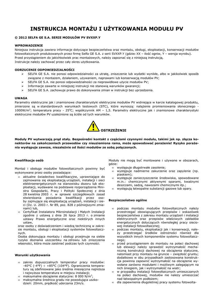 INSTRUKCJA MONTAŻU I UŻYTKOWANIA MODUŁU PV © 2012 SELFA GE S.A. SERIE MODUŁÓW PV SVXXP.Y WPROWADZENIE Niniejsza instrukcja zawiera informacje dotyczące bezpieczeństwa oraz montażu, obsługi, eksploatacji, konserwacji modułów fotowoltaicznych produkowanych przez firmę Selfa GE S.A. z serii SVXXP.Y (gdzie: XX – ilość ogniw, Y – wersja wyrobu). Przed przystąpieniem do jakichkolwiek prac montażowych, należy zapoznać się z niniejszą instrukcją. Instrukcje należy zachować przez cały okres użytkowania. ODRZUCENIE ODPOWIEDZIALNOŚCI SELFA GE S.A. nie ponosi odpowiedzialności za utratę, zniszczenie lub wydatki wynikłe, albo w jakikolwiek sposób związane z montażem, działaniem, używaniem, naprawami lub konserwacją modułów PV; SELFA GE S.A. nie ponosi odpowiedzialności za nieprawidłowe użycie modułów PV; Informacje zawarte w niniejszej instrukcji nie stanowią warunków gwarancji; SELFA GE S.A. zachowuje prawo do dokonywania zmian w instrukcji bez uprzedzenia. UWAGA Parametry elektryczne jak i znamionowe charakterystyki elektryczne modułów PV widniejące w karcie katalogowej produktu, zmierzone są w standardowych warunkach testowych (STC), które wynoszą: natężenie promieniowania słonecznego 1000W/m2; temperatura pracy - 250C; współczynnik AM – 1,5. Parametry elektryczne jak i znamionowe charakterystyki elektryczne modułów PV uzależnione są ściśle od tych warunków. OSTRZEŻENIE Moduły PV wytwarzają prąd stały. Bezpośredni kontakt z częściami czynnymi modułu, takimi jak np. złącza konektorów na zakończeniach przewodów czy nieuziemiona rama, może spowodować porażenie! Ryzyko porażenia występuje zawsze, niezależnie od ilości modułów ze sobą połączonych. Kwalifikacje osób Montaż i obsługa modułów fotowoltaicznych powinny być wykonywane przez osoby posiadające: • aktualne świadectwo kwalifikacyjne, uprawniające do zajmowania się eksploatacją urządzeń, instalacji i sieci elektroenergetycznych na stanowisku dozoru lub eksploatacji, wydawane na podstawie rozporządzenia Ministra Gospodarki, Pracy i Polityki Społecznej z dnia 28 kwietnia 2003 r. w sprawie szczegółowych zasad stwierdzania posiadania kwalifikacji przez osoby zajmujące się eksploatacją urządzeń, instalacji i sieci (Dz. U. 2003 r. Nr 89, poz. 828 z późniejszymi zmianami) lub, • Certyfikat Instalatora Mikroinstalacji i Małych Instalacji zgodnie z ustawą z dnia 26 lipca 2013 r. o zmianie ustawy Prawo energetyczne oraz niektórych innych ustaw, oraz osoby z doświadczeniem i wiedzą techniczną w zakresie montażu, obsługi i eksploatacji systemów fotowoltaicznych. Osoba dokonująca montażu i obsługi przejmuje na siebie ryzyko doznania uszczerbku na zdrowiu lub zniszczenia własności, która może zaistnieć podczas tych czynności. Moduły nie mogą być montowane i używane w obszarach, gdzie: • występuje długotrwałe zasolenie; • występuje nadmierne zakurzenie oraz zapylenie (np. piaskiem); • występuje zanieczyszczenie środowiska, spowodowane m.in.: chemicznymi aktywnymi oparami, kwaśnymi deszczami, sadzą, nawozami chemicznymi itp.; • występują łatwopalne substancji gazowe lub opary. Bezpieczeństwo ogólne • • • Warunki użytkowania • • • zakres dopuszczalnych temperatur pracy modułów: -40°C (-4°F) ÷ +85°C (104°F). Ograniczenia temperatury są zdefiniowane jako średnia miesięczna najniższa i najwyższa temperatura w miejscu instalacji; maksymalne obciążenie statyczne: 8 000 N/m2; maksymalna średnica gradu nie powodująca uszkodzień: 20mm, prędkość uderzania 23m/s. • • podczas montażu modułów fotowoltaicznych należy przestrzegać obowiązujących przepisów i wskazówek bezpieczeństwa z zakresu montażu urządzeń i instalacji elektrycznych oraz przepisów właściwych zakładów energetycznych dotyczących równoległej pracy sieciowej instalacji fotowoltaicznej; podczas montażu, eksploatacji jak i konserwacji, należy przestrzegać środków ostrożności również dla wszystkich innych komponentów systemu fotowoltaicznego; przed przystąpieniem do montażu na połaci dachowej lub elewacji należy sprawdzić wytrzymałość mechaniczną konstrukcji dachowej na obciążenia statyczne, natomiast przy montażu na gruncie – zwięzłość gruntu; dodatkowo w obu przypadkach zastosowana konstrukcja powinna zapewnić wytrzymałość na obciążenie wywołane zarówno modułami i możliwym zalegającym na nich śniegiem, jak i wytrzymałość na wiatr; w przypadku instalacji fotowoltaicznych umieszczanych na połaci dachowej, modułów nie należy umieszczać nad łatwopalnym podłożem; dla zapewnienia długoletniej pracy systemu fotowolta- • • • • • • • • • icznego, moduły powinny zostać zamocowane na systemach montażowych wykonanym zgodnie z obowiązującymi normami i przepisami; przed przystąpieniem do montażu należy sprawdzić, czy moduł fotowoltaiczny nie posiada uszkodzeń mechanicznych (np. pęknięta szyba, uszkodzenie tylnej folii izolacyjnej, pęknięta rama, oderwana puszka lub przewody przyłączeniowe); moduły fotowoltaiczne podczas pracy powinny być w jak najmniejszym stopniu narażone na zacienienie; rozłączanie przewodów prądu stałego może powodować powstawanie łuku elektrycznego; przed rozpoczęciem każdej pracy przy instalacji fotowoltaicznej, w szczególności przed odłączeniem złączek w obwodzie prądu stałego, należy odłączyć inwerter od sieci napięcia przemiennego; podczas podłączania modułów do inwertera, nigdy nie należy przekraczać maksymalnego dopuszczalnego całkowitego napięcia systemowego inwertera; nie należy obciążać powierzchni modułów ani chodzić po ich powierzchni; w ramach modułu nie wolno wiercić otworów, przybijać w nie gwoździ, ani ich kleić czy spawać; modułów nie należy przytrzymywać ani transportować na kablach przyłączeniowych ani na puszce przyłączeniowej