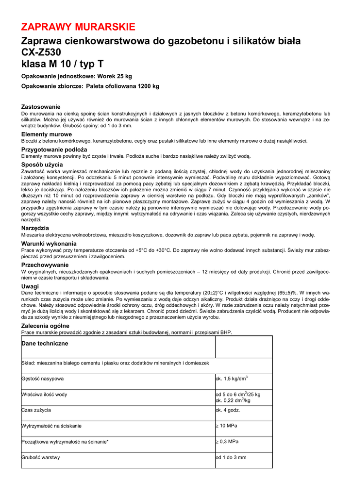 ZAPRAWY MURARSKIE Zaprawa cienkowarstwowa do gazobetonu i silikatów biała CX-Z530 klasa M 10 / typ T Opakowanie jednostkowe: Worek 25 kg Opakowanie zbiorcze: Paleta ofoliowana 1200 kg Zastosowanie Do murowania na cienką spoinę ścian konstrukcyjnych i działowych z jasnych bloczków z betonu komórkowego, keramzytobetonu lub silikatów. Można jej używać również do murowania ścian z innych chłonnych elementów murowych. Do stosowania wewnątrz i na zewnątrz budynków. Grubość spoiny: od 1 do 3 mm. Elementy murowe Bloczki z betonu komórkowego, keramzytobetonu, cegły oraz pustaki silikatowe lub inne elementy murowe o dużej nasiąkliwości. Przygotowanie podłoża Elementy murowe powinny być czyste i trwałe. Podłoża suche i bardzo nasiąkliwe należy zwilżyć wodą. Sposób użycia Zawartość worka wymieszać mechanicznie lub ręcznie z podaną ilością czystej, chłodnej wody do uzyskania jednorodnej mieszaniny i założonej konsystencji. Po odczekaniu 5 minut ponownie intensywnie wymieszać. Podwalinę muru dokładnie wypoziomować. Gotową zaprawę nakładać kielnią i rozprowadzać za pomocą pacy zębatej lub specjalnym dozownikiem z zębatą krawędzią. Przykładać bloczki, lekko je dociskając. Po nałożeniu bloczków ich położenie można zmienić w ciągu 7 minut. Czynność przyklejania wykonać w czasie nie dłuższym niż 10 minut od rozprowadzenia zaprawy w cienkiej warstwie na podłożu. Gdy bloczki nie mają wyprofilowanych „zamków”, zaprawę należy nanosić również na ich pionowe płaszczyzny montażowe. Zaprawę zużyć w ciągu 4 godzin od wymieszania z wodą. W przypadku zgęstnienia zaprawy w tym czasie należy ją ponownie intensywnie wymieszać nie dolewając wody. Przedozowanie wody pogorszy wszystkie cechy zaprawy, między innymi: wytrzymałość na odrywanie i czas wiązania. Zaleca się używanie czystych, nierdzewnych narzędzi. Narzędzia Mieszarka elektryczna wolnoobrotowa, mieszadło koszyczkowe, dozownik do zapraw lub paca zębata, pojemnik na zaprawę i wodę. Warunki wykonania Prace wykonywać przy temperaturze otoczenia od +5°C do +30°C. Do zaprawy nie wolno dodawać innych substancji. Świeży mur zabezpieczać przed przesuszeniem i zawilgoceniem. Przechowywanie W oryginalnych, nieuszkodzonych opakowaniach i suchych pomieszczeniach – 12 miesięcy od daty produkcji. Chronić przed zawilgoceniem w czasie transportu i składowania. Uwagi Dane techniczne i informacje o sposobie stosowania podane są dla temperatury (20±2)°C i wilgotności względnej (65±5)%. W innych warunkach czas zużycia może ulec zmianie. Po wymieszaniu z wodą daje odczyn alkaliczny. Produkt działa drażniąco na oczy i drogi oddechowe. Należy stosować odpowiednie środki ochrony oczu, dróg oddechowych i skóry. W razie zabrudzenia oczu należy natychmiast przemyć je dużą ilością wody i skontaktować się z lekarzem. Chronić przed dziećmi. Świeże zabrudzenia czyścić wodą. Producent nie odpowiada za szkody wynikłe z nieumiejętnego lub niezgodnego z przeznaczeniem użycia wyrobu. Zalecenia ogólne Prace murarskie prowadzić zgodnie z zasadami sztuki budowlanej, normami i przepisami BHP. Dane techniczne Skład: mieszanina białego cementu i piasku oraz dodatków mineralnych i domieszek Gęstość nasypowa ok. 1,5 kg/dm3 Właściwa ilość wody od 5 do 6 dm3/25 kg ok. 0,22 dm3/kg Czas zużycia ok. 4 godz. Wytrzymałość na ściskanie ≥ 10 MPa Początkowa wytrzymałość na ścinanie* ≥ 0,3 MPa Grubość warstwy od 1 do 3 mm Wydajność ok.19 dm3 z 25 kg ok. 0,76 dm3 z 1 kg Zużycie przy spoinie 2 mm dla muru o grubości 12 cm z bloczków o wymiarach 12×20×24 cm ok. 2,5 kg/m2 Zużycie przy spoinie 2 mm dla muru o grubości 24 cm z bloczków o wymiarach ok. 4 kg/m2 49×24×24 cm Reakcja na ogień klasa A1 Absorpcja wody 2 0,5 ≤ 0,3 kg/(m ×min ) Współczynnik przepuszczalności pary wodnej, µ* 5/20 Zawartość chlorków ≤ 0,1 % Cl Trwałość mrozoodporna * wartość tabelaryczna Na wyrób wstawiono deklarację zgodności. Certyfikat ZKP 1488-CPD-0010 wydany przez Instytut Techniki Budowlanej w Warszawie. Dokument odniesienia: PN-EN 998-2:2012. Posiada atest PZH. PKWiU: 23.64.10.0. Zawartość chromu (VI) rozpuszczalnego w wodzie poniżej 2 ppm.