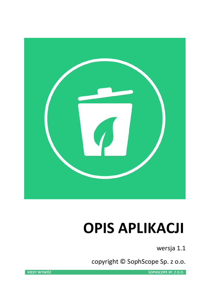 OPIS APLIKACJI wersja 1.1 copyright © SophScope Sp. z o.o. KIEDY WYWÓZ SOPHSCOPE SP. Z O.O. Aplikacja Kiedy Wywóz umożliwia przeglądanie harmonogramu wywozu odpadów w wybranych lokalizacjach w sposób przystępny i zrozumiały (przykład na rysunku obok). Przy pomocy aplikacji możliwe jest ponadto przekazywanie do gminy informacji m.in. o jakości usług świadczonych przez firmy oczyszczania miasta, przepełnionych pojemnikach i lokalizacji odpadów „niczyich”, a także zgłaszanie chęci udziału w zbiórkach okazjonalnych (takich jak np. zbiórka odzieży). Aplikacja zawiera aktualizowany na bieżąco spis stałych punktów selektywnej zbiórki odpadów komunalnych (PSZOK), a także innych lokalizacji, w których możliwe jest pozostawienie odpadów (takich jak leki, baterie czy sprzęt RTV/AGD). Lista prezentowanych punktów jest zależna od lokalizacji geograficznej, w której znajduje się w danej chwili telefon. Aplikacja pozwala również na wyznaczenie drogi do wybranego punktu. APLIKACJA JEST DOSTĘPNA ZA DARMO W SKLEPACH AppStore, Google Play oraz Windows Phone Store. MOŻNA Z NIEJ KORZYSTAĆ NA WSZYSTKICH SMARTFONACH DZIAŁAJĄCYCH POD KONTROLĄ SYSTEMÓW iOS, Android i Windows Phone 8. KIEDY WYWÓZ SOPHSCOPE SP. Z O.O. Szanowni Państwo, Ustawa o odpadach obowiązująca od lipca 2013 roku zobowiązuje do selektywnej zbiórki odpadów komunalnych i nakłada na gminy szereg obowiązków związanych z gospodarowaniem odpadami komunalnymi. Zgodnie z zapisami ustawy gminy nadzorują gospodarowanie odpadami komunalnymi, w tym realizację zadań powierzonych podmiotom odbierającym odpady komunalne od właścicieli nieruchomości. Gminy zobowiązane są pokrywać koszty funkcjonowania systemu gospodarowania odpadami komunalnymi, między innymi koszty: • odbierania, transportu, zbierania, odzysku i unieszkodliwiania odpadów komunalnych, • tworzenia i utrzymania punktów selektywnego zbierania odpadów komunalnych, • obsługi administracyjnej systemu, • usług dodatkowych. Gminy zobowiązane są także do prowadzenia działań informacyjnych i edukacyjnych. Aby wesprzeć Państwa w realizowaniu powyższych przygotowaliśmy mobilne rozwiązanie informatyczne Kiedy Wywóz. zadań, KIEDY WYWÓZ SophScope Sp. z o.o. SOPHSCOPE SP. Z O.O. APLIKACJA KIEDY WYWÓZ umożliwia przeglądanie harmonogramu wywozu odpadów w wybranych lokalizacjach oraz dokonywanie oceny jakości usług wywozowych świadczonych przez firmy oczyszczania miasta. Ponadto, zawiera aktualizowany na bieżąco spis stałych punktów selektywnej zbiórki odpadów (PSZOK) i innych lokalizacji, w których możliwe jest pozostawienie odpadów. Aplikacja jest efektem współpracy SophScope Sp. z o.o. i Katedry Logistyki Uniwersytetu Ekonomicznego we Wrocławiu. NAJWAŻNIEJSZE FUNKCJE APLIKACJI: • • • • • udostępnianie harmonogramów wywozu różnych typów odpadów (np. papier, szkło, tworzywa, BIO, zmieszane, itp.), udostępnianie informacji o zbiórkach okazjonalnych (RTV/AGD, baterie, leki itp.), możliwość oceny jakości usług świadczonych przez firmy wywozowe (mail ze zdjęciem do gminy), możliwość wyznaczenia trasy do miejsca, w którym znajduje się pojemnik na odpady, udostępnianie informacji o aktualizowanym na bieżąco spisie stałych punktów selektywnej zbiórki odpadów (PSZOK). Szczegółowy opis funkcji aplikacji znajduje się w dalszej części dokumentu. Patronat nad projektem Kiedy Wywóz objęła Organizacja Odzysku EkoCykl S.A., która od wielu lat wspomaga gminy w realizacji procesu gospodarowania odpadami. KONTAKT: SophScope Sp. z o.o. ul. Powstańców Śląskich 28/30, 53-‐333 Wrocław tel.: +48 71 33 50 592 e-‐mail: [email protected] www.sophscope.com www.kiedywywoz.pl www.facebook.com/KiedyWywoz KIEDY WYWÓZ SOPHSCOPE SP. Z O.O. Szczegółowy opis działania aplikacji Aplikacja Kiedy Wywóz może być zainstalowana przez użytkownika za pośrednictwem sklepu dostępnego w jego telefonie. Instalacja i uruchomienie aplikacji są tak proste, jak zainstalowanie każdej innej aplikacji lub gry. Aby odnaleźć aplikację w sklepie, wystarczy wpisać w pole wyszukiwania jej nazwę: „kiedy wywóz”. Głównym celem aplikacji jest umożliwienie mieszkańcom sprawdzania w sposób komfortowy i prosty harmonogramów wywozu odpadów i miejsc odbiorów odpadów w zależności od lokalizacji telefonu. Istniejące w wielu miastach strony internetowe zawierające wspomniane powyżej informacje nie spełniają w pełni swoich zadań, gdyż odczytanie bieżącego harmonogramu oznacza konieczność uruchomienia komputera. Problemu nie rozwiązuje także wydrukowanie harmonogramu, bowiem harmonogramy mogą okresowo być modyfikowane. Wyświetlenie strony internetowej za pośrednictwem smartfona wymaga natomiast dostępu do Internetu, ponadto skorzystanie ze strony dedykowanej dla komputera na smartfonie często jest niekomfortowe. Aplikacja Kiedy Wywóz pozbawiona jest powyższych wad. W celu sprawdzenia harmonogramu wystarczy sięgnąć po telefon. W momencie sprawdzania terminu wywozu nie jest konieczne aktywne podłączenie do Internetu, gdyż dane o harmonogramie mogą być pobrane wcześniej (jednorazowo telefon może pobrać dane na okres 1 miesiąca) i zostać wyświetlone z pamięci telefonu. Ponadto, aplikacja oferuje szereg dodatkowych funkcji, które pozwolą gminom w sposób zaawansowany i tani wywiązywać sie z obowiązków, jakie nakłada na nie Ustawa. W szczególności, są to funkcje pozwalające na ocenę jakości systemu zbiórki odpadów komunalnych i usług świadczonych przez firmy oczyszczania miasta. Ponadto, dzięki aplikacji użytkownik może korzystać z aktualizowanej listy stałych punktów odbiorów odpadów, takich jak PSZOK. Docelowo lista ta będzie rozszerzana o inne przedsiębiorstwa, które mogą zagospodarować odpady – co z pewnością zwiększy efektywność powstającego obecnie w Polsce ogólnokrajowego systemu zbiórki odpadów. KI