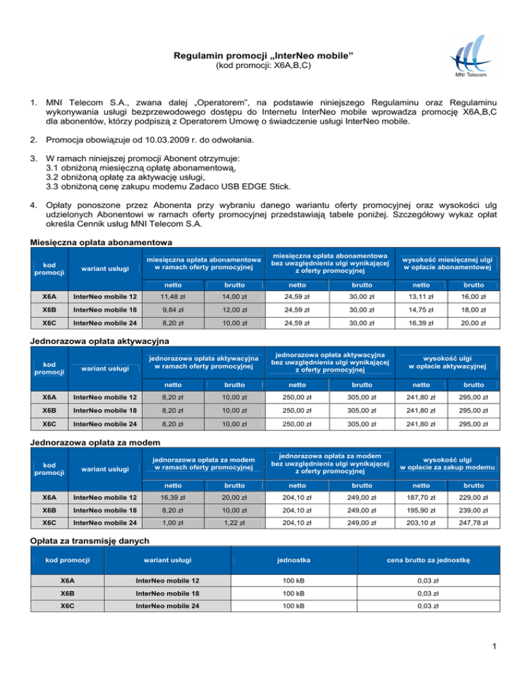 Regulamin promocji „InterNeo mobile” (kod promocji: X6A,B,C) 1. MNI Telecom S.A., zwana dalej „Operatorem”, na podstawie niniejszego Regulaminu oraz Regulaminu wykonywania usługi bezprzewodowego dostępu do Internetu InterNeo mobile wprowadza promocję X6A,B,C dla abonentów, którzy podpiszą z Operatorem Umowę o świadczenie usługi InterNeo mobile. 2. Promocja obowiązuje od 10.03.2009 r. do odwołania. 3. W ramach niniejszej promocji Abonent otrzymuje: 3.1 obniżoną miesięczną opłatę abonamentową, 3.2 obniżoną opłatę za aktywację usługi, 3.3 obniżoną cenę zakupu modemu Zadaco USB EDGE Stick. 4. Opłaty ponoszone przez Abonenta przy wybraniu danego wariantu oferty promocyjnej oraz wysokości ulg udzielonych Abonentowi w ramach oferty promocyjnej przedstawiają tabele poniżej. Szczegółowy wykaz opłat określa Cennik usług MNI Telecom S.A. Miesięczna opłata abonamentowa kod promocji miesięczna opłata abonamentowa w ramach oferty promocyjnej wariant usługi miesięczna opłata abonamentowa bez uwzględnienia ulgi wynikającej z oferty promocyjnej wysokość miesięcznej ulgi w opłacie abonamentowej netto brutto netto brutto netto brutto X6A InterNeo mobile 12 11,48 zł 14,00 zł 24,59 zł 30,00 zł 13,11 zł 16,00 zł X6B InterNeo mobile 18 9,84 zł 12,00 zł 24,59 zł 30,00 zł 14,75 zł 18,00 zł X6C InterNeo mobile 24 8,20 zł 10,00 zł 24,59 zł 30,00 zł 16,39 zł 20,00 zł Jednorazowa opłata aktywacyjna kod promocji jednorazowa opłata aktywacyjna w ramach oferty promocyjnej wariant usługi jednorazowa opłata aktywacyjna bez uwzględnienia ulgi wynikającej z oferty promocyjnej wysokość ulgi w opłacie aktywacyjnej netto brutto netto brutto netto brutto X6A InterNeo mobile 12 8,20 zł 10,00 zł 250,00 zł 305,00 zł 241,80 zł 295,00 zł X6B InterNeo mobile 18 8,20 zł 10,00 zł 250,00 zł 305,00 zł 241,80 zł 295,00 zł X6C InterNeo mobile 24 8,20 zł 10,00 zł 250,00 zł 305,00 zł 241,80 zł 295,00 zł Jednorazowa opłata za modem kod promocji jednorazowa opłata za modem w ramach oferty promocyjnej wariant usługi jednorazowa opłata za modem bez uwzględnienia ulgi wynikającej z oferty promocyjnej wysokość ulgi w opłacie za zakup modemu netto brutto netto brutto netto brutto X6A InterNeo mobile 12 16,39 zł 20,00 zł 204,10 zł 249,00 zł 187,70 zł 229,00 zł X6B InterNeo mobile 18 8,20 zł 10,00 zł 204,10 zł 249,00 zł 195,90 zł 239,00 zł X6C InterNeo mobile 24 1,00 zł 1,22 zł 204,10 zł 249,00 zł 203,10 zł 247,78 zł Opłata za transmisję danych kod promocji wariant usługi jednostka cena brutto za jednostkę X6A InterNeo mobile 12 100 kB 0,03 zł X6B InterNeo mobile 18 100 kB 0,03 zł X6C InterNeo mobile 24 100 kB 0,03 zł 1 5. Abonent może w dowolnej chwili zmienić opcję usługi InterNeo mobile, z której korzysta na usługę o wyższej opłacie abonamentowej bez ponoszenia opłat manipulacyjnych. Nowa usługa będzie aktywowana z początkiem kolejnego miesiąca rozliczeniowego. 6. Abonent może zmienić opcję usługi InterNeo mobile na usługę o niższej opłacie abonamentowej za opłatą zgodnie z cennikiem usług Operatora. 7. Każdy, kto skorzysta z promocji jest zobowiązany do pozostania w sieci Operatora i korzystania z usługi InterNeo mobile przez co najmniej taki okres na jaki została zawarta umowa. Po upływie tego okresu umowa ta ulegnie automatycznemu przedłużeniu na czas nieokreślony, z opłatą abonamentową w pełnej wysokości (czyli bez przyznania Abonentowi ulgi w wysokości określonej w pkt 4, dla danego wariantu usługi) chyba, że Abonent na 30 dni przed upływem zakończenia umowy wyrazi pisemnie inną wolę. 8. W przypadku rozwiązania Umowy o świadczenie usługi InterNeo mobile z winy Abonenta lub rezygnacji z tej usługi przez Abonenta przed upływem okresu na jaki została ona zawarta, Abonent zostanie obciążony karą umowną, której wysokość stanowić będzie sumę: 8.1 iloczynu liczby miesięcy, które pozostały do końca okresu, na jaki została zawarta umowa i wysokości miesięcznej ulgi w opłacie abonamentowej dla danego wariantu oferty promocyjnej, 8.2 ulgi udzielonej w opłacie aktywacyjnej udzielanej Abonentowi w ofercie promocyjnej, 8.3 ulgi udzielonej w opłacie za zakup modemu. 9. Abonenci Operatora mogą skorzystać z tej promocji tylko wtedy, gdy na ich koncie nie widnieje zadłużenie wobec Operatora. 10. Operator nie ponosi odpowiedzialności za niedostępność świadczonej przez niego usługi wynikającą z nieosiągnięcia przez Abonenta parametrów technicznych do skorzystania z tej usługi przez urządzenia używane przez Abonenta, w szczególności sprzęt komputerowy oraz zainstalowane w nim oprogramowanie. 11. Operator zastrzega sobie prawo do skrócenia lub przedłużenia czasu trwania promocji bez podawania przyczyn. 12. W sprawach nieuregulowanych przepisami niniejszego regulaminu mają zastosowanie przepisy Regulaminu wykonywania usługi bezprzewodowego dostępu do Internetu InterNeo mobile przez Operatora oraz Prawa telekomunikacyjnego. 2