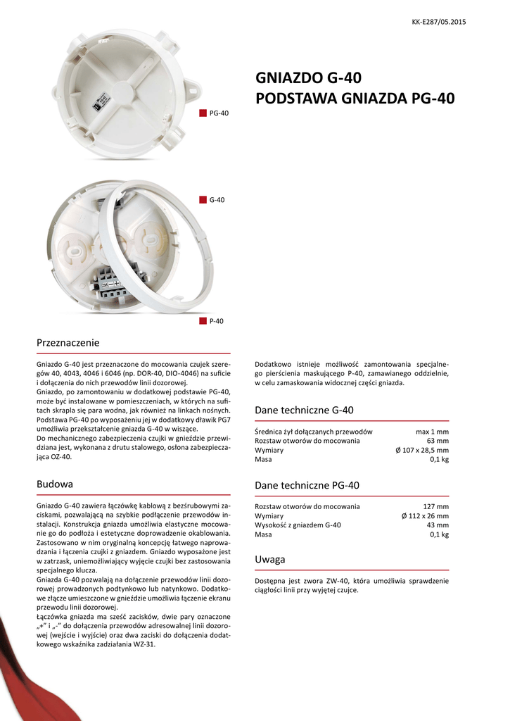 KK-E287/05.2015 GNIAZDO G-40 PODSTAWA GNIAZDA PG-40 PG-40 G-40 P-40 Przeznaczenie Gniazdo G-40 jest przeznaczone do mocowania czujek szeregów 40, 4043, 4046 i 6046 (np. DOR-40, DIO-4046) na suficie i dołączenia do nich przewodów linii dozorowej. Gniazdo, po zamontowaniu w dodatkowej podstawie PG-40, może być instalowane w pomieszczeniach, w których na sufitach skrapla się para wodna, jak również na linkach nośnych. Podstawa PG-40 po wyposażeniu jej w dodatkowy dławik PG7 umożliwia przekształcenie gniazda G-40 w wiszące. Do mechanicznego zabezpieczenia czujki w gnieździe przewidziana jest, wykonana z drutu stalowego, osłona zabezpieczająca OZ-40. Średnica żył dołączanych przewodów Rozstaw otworów do mocowania Wymiary Masa Budowa Dane techniczne PG-40 Gniazdo G-40 zawiera łączówkę kablową z bezśrubowymi zaciskami, pozwalającą na szybkie podłączenie przewodów instalacji. Konstrukcja gniazda umożliwia elastyczne mocowanie go do podłoża i estetyczne doprowadzenie okablowania. Zastosowano w nim oryginalną koncepcję łatwego naprowadzania i łączenia czujki z gniazdem. Gniazdo wyposażone jest w zatrzask, uniemożliwiający wyjęcie czujki bez zastosowania specjalnego klucza. Gniazda G-40 pozwalają na dołączenie przewodów linii dozorowej prowadzonych podtynkowo lub natynkowo. Dodatkowe złącze umieszczone w gnieździe umożliwia łączenie ekranu przewodu linii dozorowej. Łączówka gniazda ma sześć zacisków, dwie pary oznaczone „+” i „-” do dołączenia przewodów adresowalnej linii dozorowej (wejście i wyjście) oraz dwa zaciski do dołączenia dodatkowego wskaźnika zadziałania WZ-31. Rozstaw otworów do mocowania Wymiary Wysokość z gniazdem G-40 Masa Dodatkowo istnieje możliwość zamontowania specjalnego pierścienia maskującego P-40, zamawianego oddzielnie, w celu zamaskowania widocznej części gniazda. Dane techniczne G-40 max 1 mm 63 mm Ø 107 x 28,5 mm 0,1 kg 127 mm Ø 112 x 26 mm 43 mm 0,1 kg Uwaga Dostępna jest zwora ZW-40, która umożliwia sprawdzenie ciągłości linii przy wyjętej czujce.
