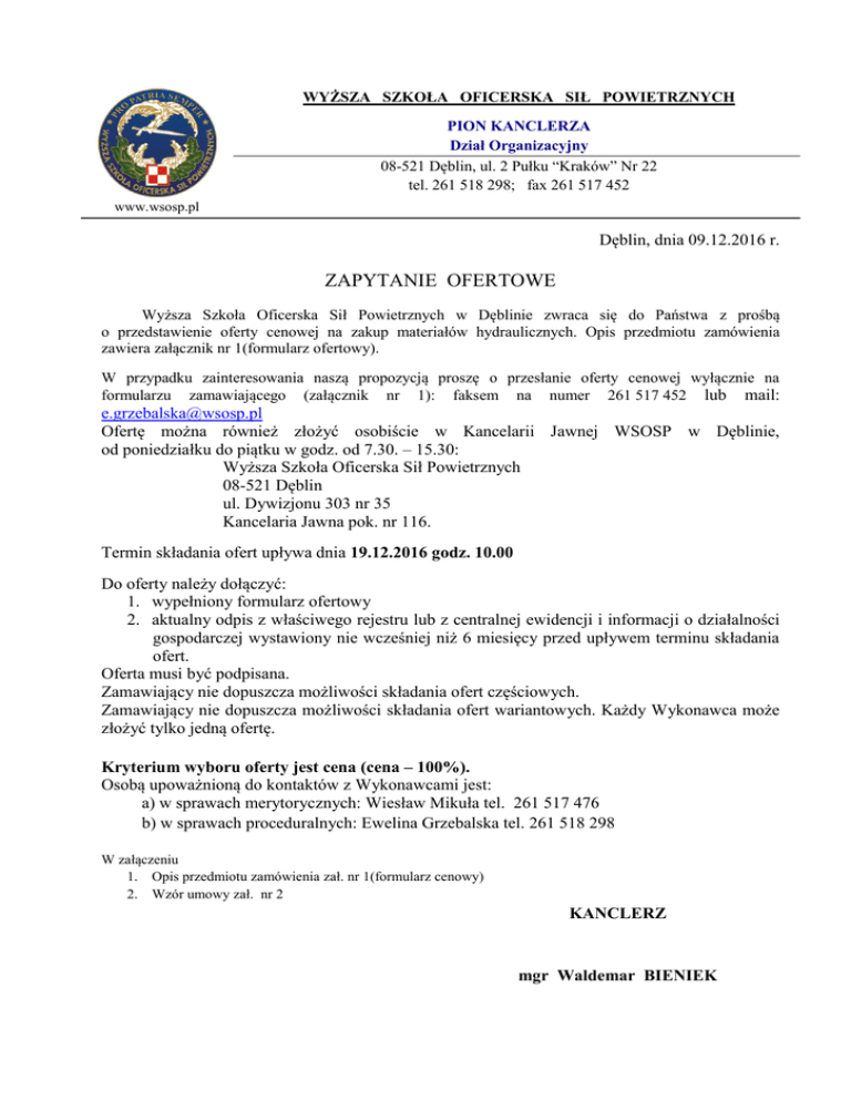 WYŻSZA SZKOŁA OFICERSKA SIŁ POWIETRZNYCH PION KANCLERZA Dział Organizacyjny 08-521 Dęblin, ul. 2 Pułku “Kraków” Nr 22 tel. 261 518 298; fax 261 517 452 www.wsosp.pl Dęblin, dnia 09.12.2016 r. ZAPYTANIE OFERTOWE Wyższa Szkoła Oficerska Sił Powietrznych w Dęblinie zwraca się do Państwa z prośbą o przedstawienie oferty cenowej na zakup materiałów hydraulicznych. Opis przedmiotu zamówienia zawiera załącznik nr 1(formularz ofertowy). W przypadku zainteresowania naszą propozycją proszę o przesłanie oferty cenowej wyłącznie na formularzu zamawiającego (załącznik nr 1): faksem na numer 261 517 452 lub mail: [email protected] Ofertę można również złożyć osobiście w Kancelarii Jawnej WSOSP w Dęblinie, od poniedziałku do piątku w godz. od 7.30. – 15.30: Wyższa Szkoła Oficerska Sił Powietrznych 08-521 Dęblin ul. Dywizjonu 303 nr 35 Kancelaria Jawna pok. nr 116. Termin składania ofert upływa dnia 19.12.2016 godz. 10.00 Do oferty należy dołączyć: 1. wypełniony formularz ofertowy 2. aktualny odpis z właściwego rejestru lub z centralnej ewidencji i informacji o działalności gospodarczej wystawiony nie wcześniej niż 6 miesięcy przed upływem terminu składania ofert. Oferta musi być podpisana. Zamawiający nie dopuszcza możliwości składania ofert częściowych. Zamawiający nie dopuszcza możliwości składania ofert wariantowych. Każdy Wykonawca może złożyć tylko jedną ofertę. Kryterium wyboru oferty jest cena (cena – 100%). Osobą upoważnioną do kontaktów z Wykonawcami jest: a) w sprawach merytorycznych: Wiesław Mikuła tel. 261 517 476 b) w sprawach proceduralnych: Ewelina Grzebalska tel. 261 518 298 W załączeniu 1. Opis przedmiotu zamówienia zał. nr 1(formularz cenowy) 2. Wzór umowy zał. nr 2 KANCLERZ mgr Waldemar BIENIEK Załącznik nr 1 OPIS PREZEDMIOTU ZAMÓWIENIA / FORMULARZ OFERTOWY Lp. 1 2 3 4 5 6 7 8 9 Nazwa ORAS wąż natrysku wzmacniany chrom dł. 1500 mm Rączka natryskowa FERRO Amber chrom 5funkcyjna (deszcz, masaż, mieszany, lekki, mgła), z zaworem przeciw zassaniowym, sitko wyposażone w wkładkę umożliwiającą łatwe usuwanie kamienia, wykończenie PVD Zawór czerpalny 1/2 cala ze złączką do węża Złącze harmonijkowe W.C. z pamięcią kształtu dł. 500 mm Jednotorowa bateria stojąca zlweozmywakowa z obrotową wylewką. Głowica ceramiczna z ogranicznikiem wypływu gorącej wody. Posiadająca I grupę akustyczną i klasę przepływu A. Zasięg wylewki 200 mm. Proponowana bateria KLUDI LOGO NEO Głowica ceramiczna do baterii jednouchwytowej fi 35 mm niska Głowica ceramiczna do baterii jednouchwytowej fi 40 mm niska Zawór spłukujący do kompaktu ALCAPLAST oszczędny z przyciskiem STOP Taśma teflonowa uniwersalna do uszczelniania połączeń gwintowych w instalacjach wodnych, maks. Temperatura pracy 260oC, Ilość szt. 100 100 30 30 30 50 20 50 20 Cena jednostkowa netto [zł.] Wartość netto [zł.] VAT % Wartość brutto [zł.] 10 Valvex MONA bateria wannowa ścienna jednouchwytowa zkompletem natryskowym. Materiał - mosiądz, kolor - chrom, wylewka dł. 350 mm, komplet zawiera: baterię, rączke natryskową uchwyt punktowy, wąż natryskowy. 10 11 Wylewka płaska typu L 350 mm 3/4" 20 12 Mocowanie do deski WC stalowe TIGER (wykonanie ze stali nierdzewnej) Odpowietrznik automatyczny 1/2" FERRO przeznaczony do usuwania powietrzaz zamkniętych instalacji grzewczych. Bateria prysznicowa jednouchwytowa firmy GROHEserii BAULOOP z kompletem prysznicowym (wąż + słuchawka natryskowa) Automatyczny zawór pisuarowy VALVEX URIVEX do stosowania w budynkach z instalacją zimnej wody, ciśnienie max 1,0MPa Wężyk w oplocie stalowym z uszczelką dł. 400 mm 1/2" N/N FERRO PWS3 50 17 Mufka ocynkowana 1/2" - element instalacji wodociągowej wykonany ze stali ocynkowanej 30 18 Zaślepka (korek) ocynkowana 1/2" - element instalacji wodociągowej wykonany ze stali ocynkowanej 40 19 Pakuły lniane WARKOCZ 100 g - max temperatura robocza 130oC 5 20 Pasta uszczelniająca do gwintów BISAN - spoiwo organiczne z wypełniaczami do uszczelnienia metalowych połączeń gwintowych w instalacjach gazowych, wodnych i C.O. 10 13 14 15 16 Razem 30 30 20 40 Pozostałe wymagania wymagania jakościowe - materiały hydrauliczne wysokiej jakości, wykonane zgodne z normami polskimi i europejskimi warunki dostawy - dostawa sukcesywna warunki odbioru - Dęblin, magazyn WSOSP Kierownik Działu – W. Mikuła termin realizacji zamówienia - do 22.12.2016 r. płatność - do 21 dni od daty dostawy Protokół odbioru gwarancja - 12 m-cy na dostarczony towar Magazynier – J. Kornas Wykonawca: ................................................................................................................................................................................................................. Siedziba/adres:............................................................................................................................................................................................................... Nr telefonu:...................................................... Nr faksu: ….................................................. e-mail: ……………………………………….…… Nr NIP: .......................................... Nr REGON: ..........................................Nr KRS ………………………… Nr PESEL: ……………………….. W odpowiedzi na zapytanie Wyższej Szkoły Oficerskiej Sił Powietrznych w Dęblinie składamy niniejszą ofertę oświadczając, że akceptujemy w całości treści zawarte w szczegółowym opisie przedmiotu zamówienia oraz wszystkie warunki zawarte w projekcie umowy. Oświadczamy, że zapoznaliśmy się z postanowieniami umowy i zobowiązujemy się, w przypadku wyboru naszej oferty, do zawarcia umowy zgodnej z niniejszą ofertą, w miejscu i terminie wyznaczonym przez Zamawiającego. W przypadku wyboru mojej oferty jako najkorzystniejszej, osob