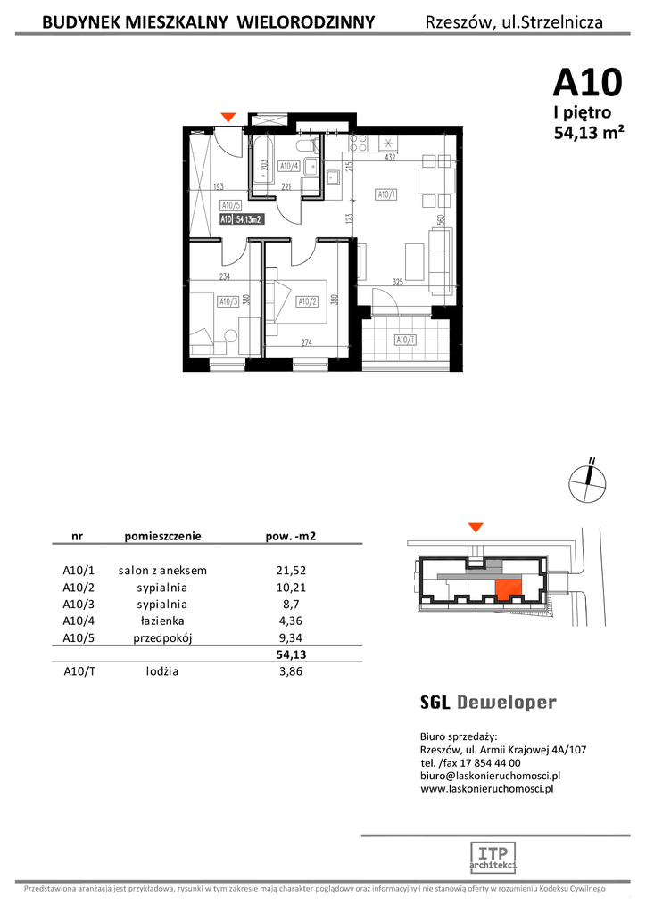 nr pomieszczenie pow. -m2 A10/1 A10/2 A10/3 A10/4 A10/5 salon z aneksem sypialnia sypialnia łazienka przedpokój A10/T lodżia 21,52 10,21 8,7 4,36 9,34 54,13 3,86