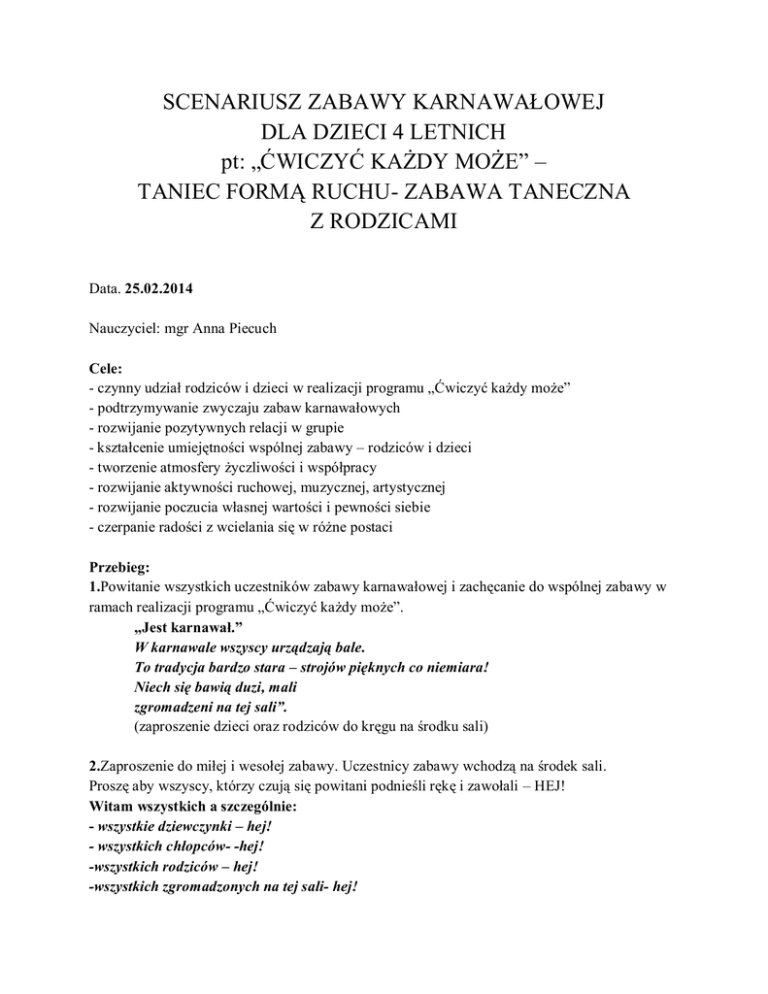 SCENARIUSZ ZABAWY KARNAWAŁOWEJ DLA DZIECI 4 LETNICH pt: „ĆWICZYĆ KAŻDY MOŻE” – TANIEC FORMĄ RUCHU- ZABAWA TANECZNA Z RODZICAMI Data. 25.02.2014 Nauczyciel: mgr Anna Piecuch Cele: - czynny udział rodziców i dzieci w realizacji programu „Ćwiczyć każdy może” - podtrzymywanie zwyczaju zabaw karnawałowych - rozwijanie pozytywnych relacji w grupie - kształcenie umiejętności wspólnej zabawy – rodziców i dzieci - tworzenie atmosfery życzliwości i współpracy - rozwijanie aktywności ruchowej, muzycznej, artystycznej - rozwijanie poczucia własnej wartości i pewności siebie - czerpanie radości z wcielania się w różne postaci Przebieg: 1.Powitanie wszystkich uczestników zabawy karnawałowej i zachęcanie do wspólnej zabawy w ramach realizacji programu „Ćwiczyć każdy może”. „Jest karnawał.” W karnawale wszyscy urządzają bale. To tradycja bardzo stara – strojów pięknych co niemiara! Niech się bawią duzi, mali zgromadzeni na tej sali”. (zaproszenie dzieci oraz rodziców do kręgu na środku sali) 2.Zaproszenie do miłej i wesołej zabawy. Uczestnicy zabawy wchodzą na środek sali. Proszę aby wszyscy, którzy czują się powitani podnieśli rękę i zawołali – HEJ! Witam wszystkich a szczególnie: - wszystkie dziewczynki – hej! - wszystkich chłopców- -hej! -wszystkich rodziców – hej! -wszystkich zgromadzonych na tej sali- hej! -wszystkich, którzy lubią się wspólnie bawić-hej! -wszystkich, którzy lubią tańczyć – hej! 3. Zabawa integracyjna „Witam was” Dzieci chodzą po sali w rytm muzyki „Wszyscy są, witam Was Zaczynamy już czas Jestem ja, jesteś Ty Raz dwa trzy” 4.Zabawa integracyjna „Rozruszanka”. Sprawdźmy czy wszyscy zabrali ze sobą na bal: - ręce? (machamy) - nogi? (tupiemy) - głowy? (potrząsamy) - bioderka? (kręcimy) „Ruch i podskok to zabawa, taniec dla dzieci to ważna sprawa, Ręce w górę, w przód i w bok, skłon do przodu, przysiad, skok. Głowa, ramiona, kolana, pięty, kolana, pięty, kolana, pięty” 5. Prezentacja strojów. Dzieci wychodzą na środek sali i opowiadają za kogo są przebrane. Nagradzanie oklaskami każdego dziecka. 6. Taniec z balonami. Dzieci dobierają się w pary. Każda para dostaje balon, który ma podtrzymywać różnymi częściami ciała. W czasie tańca balon nie może spaść na ziemię, gdy urywa się muzyka, balon umieszcza się w miejscu podanym przez nauczyciela. Partnerzy trzymają: 1. rękoma, 2.ramionami, 3.plecami, 4.czołami, 5.brzuchami. Wygrywa ta para, której nie upadnie balon. 7. Swobodne tańce przy muzyce. 8. Słuchanie bajki czytanej przez nauczyciela pt. ”Kopciuszek”. 9. Bajkowe zagadki – „Kopciuszek”. Dzieci wraz z rodzicami odpowiadają na pytania. Oto pytania: I.W której bajce jest mowa o balu: a)Jaś i Małgosia b)Kopciuszek c)Królewna Śnieżką II. Czym Kopciuszek jechał na bal :a)samochodem b)czarodziejskim dywanem c)karetą III. Jakie zwierzęta ciągnęły karetę; a)pingwiny b) strusie c)konie IV. Czym ozdabiamy salę na bal: a)skarpetkami b)balonami c) łyżeczkami V. Gdzie odbywał się bal na którym był Kopciuszek: a)w przedszkolu c)w zamku d)na leśnej polanie VI. Jakie buciki miał Kopciuszek na balu; a)kalosze b)pantofelki c) sandałki VII.W jakim stroju tańczył Kopciuszek; a) piżama b) suknia c)spódnica VIII. Kto podarował Kopciuszkowi suknię: a)macocha b)sklepowa c)matka chrzestna IX.Z kim Kopciuszek tańczył na balu; a) z Mikołajem b) z królewiczem c)z strażakiem X. Co królewicz miał na głowie ;a) kapelusz b) koronę c) beret Nagrodzenie dzieci za poprawne odpowiedzi brawami. 10. Taniec z kapeluszem. Po usłyszeniu muzyki uczestnicy tańczą w kole, przekazując sobie z ręki do ręki kapelusz. Gdy muzyka zostaje przerwana uczestnik, który ma kapelusz, zakłada go wchodząc do środka koła i wymyśla ruchy, które naśladują pozostali. Gdy znowu słychać muzykę, wychodzi ze środka koła i kapelusz przekazuje pozostałym uczestnikom zabawy. Zabawę powtarzamy podczas trwania jednej piosenki. 11. Zabawa przy muzyce „Kaczuszki”. Uczestnicy naśladują ruchy. Wprowadzenie kroków tanecznych do piosenki „Kaczuszki”. 12. Taniec z piłką. Po usłyszeniu muzyki uczestnicy tańczą w kole, przekazując sobie z ręki do ręki piłkę. Gdy muzyka zostaje przerwana uczestnik który ma piłkę odpada z zabawy. Nagrodzenie brawami osoby, która zwyciężyła. 13. Taniec na gazecie. Uczestnicy tańczą na gazecie, kiedy muzyka umilknie, składają gazetę na pół. Na ponowny głos muzyki, tańczą dalej. Gdy uczestnicy wyjdą za gazetę, odpadają z zabawy. Zwycięska para otrzymuje oklaski. 14. Zabawa przy piosence „Makarena”. Wprowadzenie kroków tanecznych do piosenki. 15. Zabawa „Pingwinek” ”Och jak przyjemnie i jak wesoło W pingwinka bawić się, się, się Raz nóżka w prawo, raz nóżka w lewo Do przodu, do tyłu i raz dwa trzy”. 16. Zabawa uspakajająca do piosenki „ Nie chcę Cię znać”. 17. Zakończenie zabawy. Podziękowanie wszystkim uczestnikom za wspólną zabawę. Wręczenie dzieciom drobnych upominków. Słodki poczęstunek.
