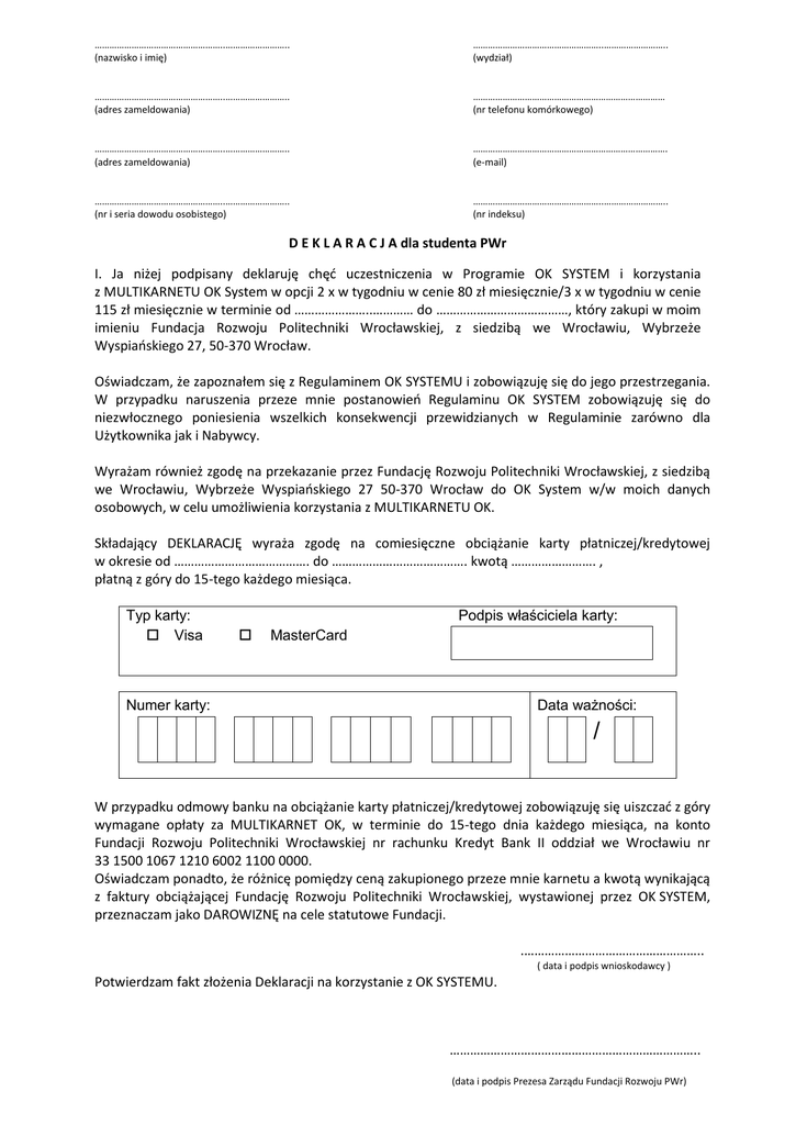 ……………………………………………..…………………….. (nazwisko i imię) ……………………………………………..…………………….. (wydział) ……………………………………………..…………………….. (adres zameldowania) …………………………………………………………………… (nr telefonu komórkowego) ……………………………………………..…………………….. (adres zameldowania) ……………………………………………………………………. (e-mail) ……………………………………………..…………………….. (nr i seria dowodu osobistego) ……………………………………………..…………………….. (nr indeksu) D E K L A R A C J A dla studenta PWr I. Ja niżej podpisany deklaruję chęć uczestniczenia w Programie OK SYSTEM i korzystania z MULTIKARNETU OK System w opcji 2 x w tygodniu w cenie 80 zł miesięcznie/3 x w tygodniu w cenie 115 zł miesięcznie w terminie od …………………..………… do …………………………………, który zakupi w moim imieniu Fundacja Rozwoju Politechniki Wrocławskiej, z siedzibą we Wrocławiu, Wybrzeże Wyspiańskiego 27, 50-370 Wrocław. Oświadczam, że zapoznałem się z Regulaminem OK SYSTEMU i zobowiązuję się do jego przestrzegania. W przypadku naruszenia przeze mnie postanowień Regulaminu OK SYSTEM zobowiązuję się do niezwłocznego poniesienia wszelkich konsekwencji przewidzianych w Regulaminie zarówno dla Użytkownika jak i Nabywcy. Wyrażam również zgodę na przekazanie przez Fundację Rozwoju Politechniki Wrocławskiej, z siedzibą we Wrocławiu, Wybrzeże Wyspiańskiego 27 50-370 Wrocław do OK System w/w moich danych osobowych, w celu umożliwienia korzystania z MULTIKARNETU OK. Składający DEKLARACJĘ wyraża zgodę na comiesięczne obciążanie karty płatniczej/kredytowej w okresie od …………………………………. do …………………………………. kwotą ……………………. , płatną z góry do 15-tego każdego miesiąca. Typ karty: Visa Podpis właściciela karty: MasterCard Data ważności: Numer karty: / W przypadku odmowy banku na obciążanie karty płatniczej/kredytowej zobowiązuję się uiszczać z góry wymagane opłaty za MULTIKARNET OK, w terminie do 15-tego dnia każdego miesiąca, na konto Fundacji Rozwoju Politechniki Wrocławskiej nr rachunku Kredyt Bank II oddział we Wrocławiu nr 33 1500 1067 1210 6002 1100 0000. Oświadczam ponadto, że różnicę pomiędzy ceną zakupionego przeze mnie karnetu a kwotą wynikającą z faktury obciążającej Fundację Rozwoju Politechniki Wrocławskiej, wystawionej przez OK SYSTEM, przeznaczam jako DAROWIZNĘ na cele statutowe Fundacji. .…………………………………………….. ( data i podpis wnioskodawcy ) Potwierdzam fakt złożenia Deklaracji na korzystanie z OK SYSTEMU. ……………………………………………………………….. (data i podpis Prezesa Zarządu Fundacji Rozwoju PWr)