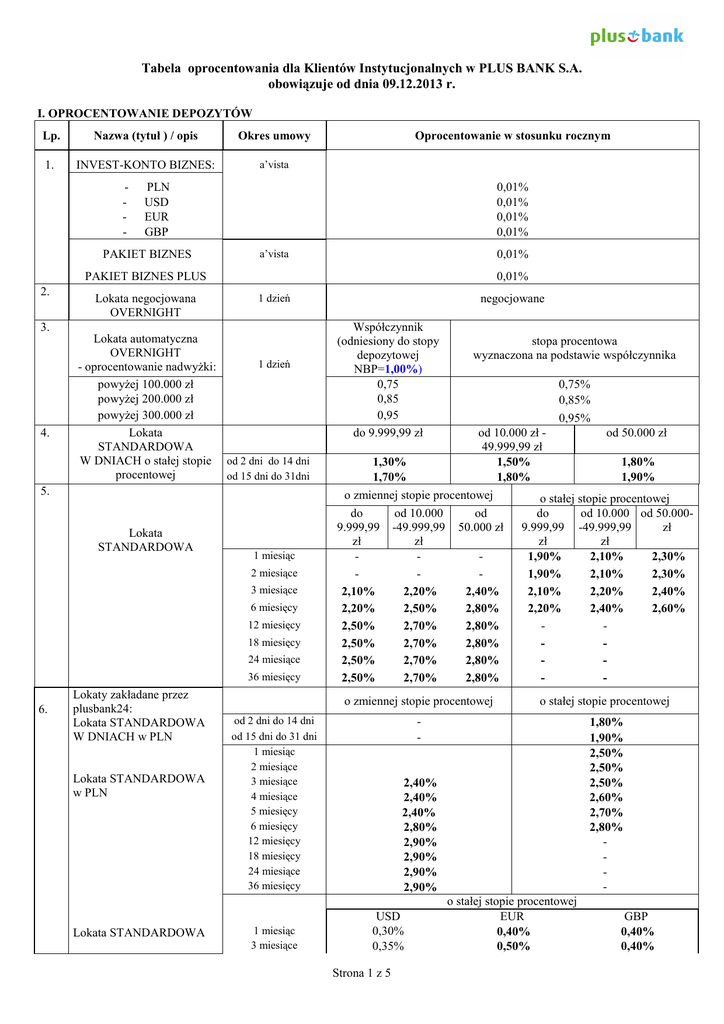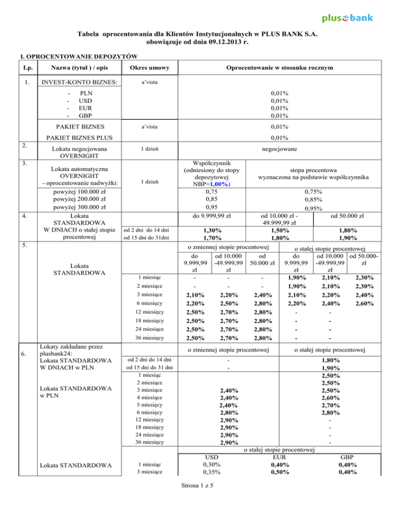 Tabela oprocentowania dla Klientów Instytucjonalnych w PLUS BANK S.A. obowiązuje od dnia 09.12.2013 r. I. OPROCENTOWANIE DEPOZYTÓW Lp. Nazwa (tytuł ) / opis Okres umowy 1. INVEST-KONTO BIZNES: a’vista - Oprocentowanie w stosunku rocznym PLN USD EUR GBP PAKIET BIZNES 0,01% 0,01% 0,01% 0,01% a’vista 0,01% PAKIET BIZNES PLUS 2. Lokata negocjowana OVERNIGHT 0,01% 1 dzień 3. 4. Lokata automatyczna OVERNIGHT 1 dzień - oprocentowanie nadwyżki: powyżej 100.000 zł powyżej 200.000 zł powyżej 300.000 zł Lokata STANDARDOWA W DNIACH o stałej stopie od 2 dni do 14 dni procentowej od 15 dni do 31dni 5. Lokata STANDARDOWA 1 miesiąc 2 miesiące 3 miesiące 6 miesięcy 12 miesięcy 18 miesięcy 24 miesiące 36 miesięcy 6. Lokaty zakładane przez plusbank24: Lokata STANDARDOWA W DNIACH w PLN Lokata STANDARDOWA w PLN Lokata STANDARDOWA negocjowane Współczynnik (odniesiony do stopy depozytowej NBP=1,00%) 0,75 0,85 0,95 do 9.999,99 zł 0,75% 0,85% 0,95% od 10.000 zł od 50.000 zł 49.999,99 zł 1,30% 1,50% 1,80% 1,70% 1,80% 1,90% o zmiennej stopie procentowej o stałej stopie procentowej do 9.999,99 zł 2,10% 2,20% 2,50% 2,50% 2,50% 2,50% od 10.000 -49.999,99 zł 2,20% 2,50% 2,70% 2,70% 2,70% 2,70% od 50.000 zł 2,40% 2,80% 2,80% 2,80% 2,80% 2,80% do 9.999,99 zł 1,90% 1,90% 2,10% 2,20% - od 10.000 od 50.000-49.999,99 zł zł 2,10% 2,30% 2,10% 2,30% 2,20% 2,40% 2,40% 2,60% - o zmiennej stopie procentowej o stałej stopie procentowej - 1,80% 1,90% 2,50% 2,50% 2,50% 2,60% 2,70% 2,80% - od 2 dni do 14 dni od 15 dni do 31 dni 1 miesiąc 2 miesiące 3 miesiące 4 miesiące 5 miesięcy 6 miesięcy 12 miesięcy 18 miesięcy 24 miesiące 36 miesięcy 1 miesiąc 3 miesiące stopa procentowa wyznaczona na podstawie współczynnika 2,40% 2,40% 2,40% 2,80% 2,90% 2,90% 2,90% 2,90% USD 0,30% 0,35% Strona 1 z 5 o stałej stopie procentowej EUR 0,40% 0,50% GBP 0,40% 0,40% 7. 8. 9. w walutach wymienialnych 6 miesięcy 0,50% 0,60% o zmiennej stopie procentowej 0,60% Lokata STANDARDOWA w walutach wymienialnych 12 miesięcy USD 0,60% EUR 0,80% GBP 0,70% do 9.999,99 zł 1,7% 1,8% 2,3% 2,4% 2,5% 2,7% 2,8% 2,9% 3,0% 3,1% 3,2% 3,3% USD 0,20% 0,25% 0,40% USD od 10.00049.999,99 zł 1,8% 1,9% 2,4% 2,5% 2,6% 2,8% 2,9% 3,0% 3,1% 3,2% 3,3% 3,4% EUR 0,30% 0,40% 0,50% EUR od 50.000 zł 2,0% 2,1% 2,6% 2,7% 2,8% 3,0% 3,1% 3,2% 3,3% 3,4% 3,5% 3,6% GBP 0,30% 0,30% 0,50% GBP 0,50% 0,70% 0,60% Lokaty PROGRESYWNE o zmiennej stopie procentowej Lokata STANDARDOWA w walutach wymienialnych o stałej stopie procentowej Lokaty STANDARDOWE w walutach wymienialnych o zmiennej stopie procentowej okres utrzymania - 1 miesiąc - 2 miesiące - 3 miesiące - 4 miesiące - 5 miesięcy - 6 miesięcy - 7 miesięcy - 8 miesięcy - 9 miesięcy 10 miesięcy - 11 miesięcy - 12 miesięcy 1 miesiąc 3 miesiące 6 miesięcy 12 miesięcy Strona 2 z 5 II. OPROCENTOWANIE KREDYTÓW Lp. 1. 2. 3. 4. Nazwa ( tytuł ) Oprocentowanie w stosunku rocznym Kredyty na cele związane z działalnością gospodarczą z okresem kredytowania do 3 miesięcy 1) 1) kredyty kasowe 2) kredyty w rachunku bieżącym 3) kredyty odnawialne i nieodnawialne w rachunku kredytowym 4) kredyty inwestycyjne 5) kredyty odnawialne i nieodnawialne w rachunku kredytowym w USD 6) kredyty odnawialne i nieodnawialne w rachunku kredytowym w EUR 7) kredyty inwestycyjne w USD 8) kredyty inwestycyjne w EUR Kredyty na cele związane z działalnością gospodarczą z okresem kredytowania powyżej 3 miesięcy 1) 1) kredyty w rachunku bieżącym oraz odnawialne i nieodnawialne w rachunku kredytowym z okresem kredytowania do 12 miesięcy 2) kredyty odnawialne i nieodnawialne w rachunku kredytowym z okresem kredytowania powyżej 12 miesięcy 3) kredyty inwestycyjne 4) kredyty odnawialne i nieodnawialne w rachunku kredytowym w USD 5) kredyty odnawialne i nieodnawialne w rachunku kredytowym w EUR 6) kredyty inwestycyjne w USD 7) kredyty inwestycyjne w EUR 8) pożyczka hipoteczna Kredyt EUROINWESTYCJA – wspomagający wykorzystanie środków z Funduszy Strukturalnych Unii Europejskiej Odnawialne kredyty obrotowe w rachunku kredytowym udzielane Sprzedawcom współpracującym z PLUS BANK S.A. stała stopa procentowa stawka WIBOR 1 M + marża Banku stawka WIBOR 1 M + marża Banku stawka WIBOR 1 M + marża Banku stawka WIBOR 1 M + marża Banku stawka LIBOR 1 M + marża Banku stawka EURIBOR 1 M + marża Banku stawka LIBOR 1 M + marża Banku stawka EURIBOR 1 M + marża Banku zmienna stopa procentowa stawka WIBOR 1 M lub 3M + marża Banku stawka WIBOR 3 M lub 6 M + marża Banku stawka WIBOR 3 M lub 6 M + marża Banku stawka LIBOR 3 M lub 6 M + marża Banku stawka EURIBOR 3 M lub 6 M + marża Banku stawka LIBOR 3 M lub 6 M + marża Banku stawka EURIBOR 3 M lub 6 M + marża Banku stawka WIBOR 3 M lub 6 M + marża Banku WIBOR 3M, 6M + marża zmienna stopa procentowa WIBOR 3M + marża Banku 5. Kredyty udzielane samorządom 1) 6. 7. stawka WIBOR, LIBOR, EURIBOR wymagana w Specyfikacji przetargowej + marża Banku Odpowiednia (1/3/6M) stawka WIBOR, LIBOR, EURIBOR notowana na 2 dni przed podpisaniem umowy kredytu / terminem zmiany oprocentowania Stopa kredytu lombardowego + marża Banku min. 3,0 Pożyczka lombardowa pkt. proc. 2) 4) Kredyt samochodowy 1) w PLN a) samochody nowe - do 12 miesięcy 8,90 % - powyżej 12 miesięcy do 24 miesięcy 9,90 % - powyżej 24 miesięcy do 36 miesięcy 10,90 % - powyżej 36 miesięcy do 48 miesięcy 11,90 % - powyżej 48 miesięcy do 72 miesięcy 12,40 % - powyżej 72 miesięcy 13,30 % b) samochody używane do 4 lat - do 24 miesięcy 12,40 % - powyżej 24 miesięcy do 36 miesięcy 13,40 % Strona 3 z 5 8. - powyżej 36 miesięcy do 48 miesięcy 14,40 % - powyżej 48 miesięcy do 72 miesięcy 14,90 % - powyżej 72 miesięcy 16,90 % c) samochody używane powyżej 4 lat - do 24 miesięcy 14,90 % - powyżej 24 miesięcy do 36 miesięcy 15,90 % - powyżej 36 miesięcy do 48 miesięcy 17,90 % - powyżej 48 miesięcy do 72 miesięcy 17,90 % 18,90 % powyżej 72 miesięcy 2) denominowany d