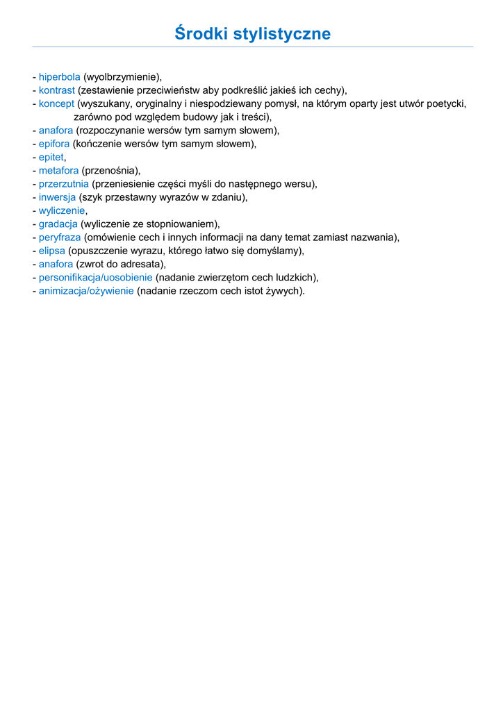 Środki stylistyczne - hiperbola (wyolbrzymienie), - kontrast (zestawienie przeciwieństw aby podkreślić jakieś ich cechy), - koncept (wyszukany, oryginalny i niespodziewany pomysł, na którym oparty jest utwór poetycki, zarówno pod względem budowy jak i treści), - anafora (rozpoczynanie wersów tym samym słowem), - epifora (kończenie wersów tym samym słowem), - epitet, - metafora (przenośnia), - przerzutnia (przeniesienie części myśli do następnego wersu), - inwersja (szyk przestawny wyrazów w zdaniu), - wyliczenie, - gradacja (wyliczenie ze stopniowaniem), - peryfraza (omówienie cech i innych informacji na dany temat zamiast nazwania), - elipsa (opuszczenie wyrazu, którego łatwo się domyślamy), - anafora (zwrot do adresata), - personifikacja/uosobienie (nadanie zwierzętom cech ludzkich), - animizacja/ożywienie (nadanie rzeczom cech istot żywych).