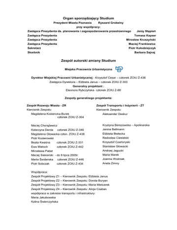 Organ sporządzający Studium Prezydent Miasta Poznania Ryszard Grobelny przy współpracy: Zastępca Prezydenta ds. planowania i zagospodarowania przestrzennego Jerzy Stępień Zastępca Prezydenta Tomasz Kayser Zastępca Prezydenta Mirosław Kruszyński Zastępca Prezydenta Maciej Frankiewicz Sekretarz Piotr Kołodziejczyk Skarbnik Barbara Sajnaj Zespół autorski zmiany Studium Miejska Pracownia Urbanistyczna Dyrektor Miejskiej Pracowni Urbanistycznej - Krzysztof Cesar – członek ZOIU Z-436 Zastępca Dyrektora – Elżbieta Janus – członek ZOIU Z-303 Generalny projektant : Eleonora Rybczyńska członek ZOIU Z-88 Zespoły generalnego projektanta: Zespół Rozwoju Miasta - ZR Zespół Transportu i Inżynierii - ZT Kierownik Zespołu: Kierownik Zespołu: Magdalena Kostencka-Burek członek ZOIU Z-304 Aleksander Deskur Maciej Chorążewicz Krystyna Berezowska – Apolinarska Katarzyna Derda członek ZOIU Z-349 Janina Bellmann Magdalena Głowacka człon. ZOIU Z-438 Elżbieta Bielecka Piotr Kozierowski Radosław Ciesielski Beata Kwaśna członek ZOIU Z-331 Krzysztof Czartoryski Ewa Mieloch członek ZOIU Z-442 Stanisław Głowacki Mirosława Pabel Andrzej Jagucki Maciej Siekierski - do 8 lipca 2005r. Maria Marek Marta Świderska członek ZOIU Z-446 Joanna Woźniak Piotr Sobczak członek ZOIU Z-434 Aneta Zimny Współpraca: Zespół Projektowy Z1 – Kierownik Zespołu: Elżbieta Janus Zespół Projektowy Z2 – Kierownik Zespołu: Dorota Buryan Zespół Projektowy Z3 – Kierownik Zespołu: Maria Mielcarek Zespół Projektowy Z4 – Kierownik Zespołu: Alicja Czaban współpraca w zakresie transportu i infrastruktury: Maria Jakubowska Kalina Świerczyńska W opracowaniu wykorzystano m.in. materiały przekazane przez: Wydziały Urzędu Miasta Poznania: Wydział Gospodarki Komunalnej i Mieszkaniowej Wydział Ochrony Środowiska Wydział Oświaty Wydział Rozwoju Miasta Wydział Spraw Obywatelskich Wydział Urbanistyki i Architektury Wydział Zdrowia i Spraw Społecznych Miejski Inspektorat Obrony Cywilnej Miejski Konserwator Zabytków Zarząd Geodezji i Katastru Miejskiego „Geopoz”