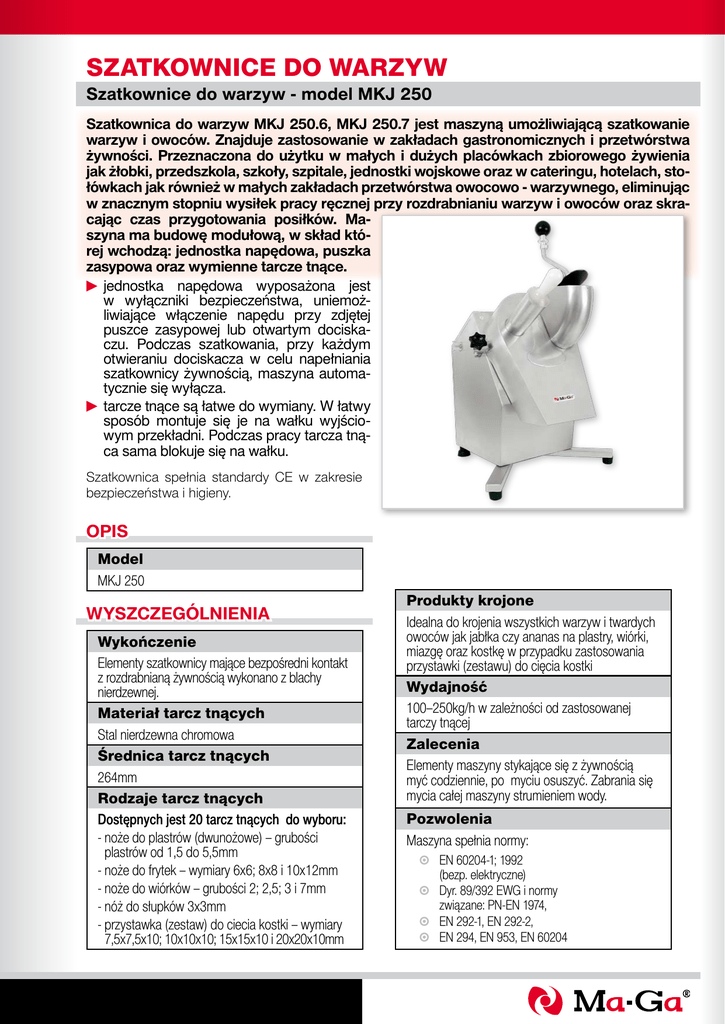 SZATKOWNICE DO WARZYW Szatkownice do warzyw - model MKJ 250 Szatkownica do warzyw MKJ 250.6, MKJ 250.7 jest maszyną umożliwiającą szatkowanie warzyw i owoców. Znajduje zastosowanie w zakładach gastronomicznych i przetwórstwa żywności. Przeznaczona do użytku w małych i dużych placówkach zbiorowego żywienia jak żłobki, przedszkola, szkoły, szpitale, jednostki wojskowe oraz w cateringu, hotelach, stołówkach jak również w małych zakładach przetwórstwa owocowo - warzywnego, eliminując w znacznym stopniu wysiłek pracy ręcznej przy rozdrabnianiu warzyw i owoców oraz skracając czas przygotowania posiłków. Maszyna ma budowę modułową, w skład której wchodzą: jednostka napędowa, puszka zasypowa oraz wymienne tarcze tnące. > jednostka napędowa wyposażona jest w wyłączniki bezpieczeństwa, uniemożliwiające włączenie napędu przy zdjętej puszce zasypowej lub otwartym dociskaczu. Podczas szatkowania, przy każdym otwieraniu dociskacza w celu napełniania szatkownicy żywnością, maszyna automatycznie się wyłącza. > tarcze tnące są łatwe do wymiany. W łatwy sposób montuje się je na wałku wyjściowym przekładni. Podczas pracy tarcza tnąca sama blokuje się na wałku. Szatkownica spełnia standardy CE w zakresie bezpieczeństwa i higieny. OPIS Model MKJ 250 WYSZCZEGÓLNIENIA Wykończenie Elementy szatkownicy mające bezpośredni kontakt z rozdrabnianą żywnością wykonano z blachy nierdzewnej. Materiał tarcz tnących Stal nierdzewna chromowa Średnica tarcz tnących 264mm Rodzaje tarcz tnących Dostępnych jest 20 tarcz tnących do wyboru: -noże do plastrów (dwunożowe) – grubości plastrów od 1,5 do 5,5mm -noże do frytek – wymiary 6x6; 8x8 i 10x12mm -noże do wiórków – grubości 2; 2,5; 3 i 7mm -nóż do słupków 3x3mm -przystawka (zestaw) do ciecia kostki – wymiary 7,5x7,5x10; 10x10x10; 15x15x10 i 20x20x10mm Produkty krojone Idealna do krojenia wszystkich warzyw i twardych owoców jak jabłka czy ananas na plastry, wiórki, miazgę oraz kostkę w przypadku zastosowania przystawki (zestawu) do cięcia kostki Wydajność 100–250kg/h w zależności od zastosowanej tarczy tnącej Zalecenia Elementy maszyny stykające się z żywnością myć codziennie, po myciu osuszyć. Zabrania się mycia całej maszyny strumieniem wody. Pozwolenia Maszyna spełnia normy: A A A A EN 60204-1; 1992 (bezp. elektryczne) Dyr. 89/392 EWG i normy związane: PN-EN 1974, EN 292-1, EN 292-2, EN 294, EN 953, EN 60204 SZATKOWNICE DO WARZYW Szatkownice do warzyw - model MKJ 250 TABLICA WYMIAROWA WYMIARY Szatkownice: MKJ 250.6, MKJ 250.7 A B C D E F 606mm 708mm 596mm 553mm 175mm 133mm G H I J K Kąt 424mm 464mm 411mm 438mm 271mm 158O DANE TECHNICZNE (specyfikacja) Szatkownice: MKJ 250.6, MKJ 250.7 Wymiary gabarytowe 464 x 596 x 606(H)mm Rozstaw nóżek 4115 x 271mm oraz 411 x 438mm Średnica tarczy tnącej 264mm Obroty tarczy tnącej ok. 300 obr./min. zgodnie z kierunkiem strzałki na puszce zasypowej Szatkownica MKJ 250.6 - 400V 50Hz 3 fazy Zasilanie Szatkownica MKJ 250.7 - 230V 50Hz 1 faza Moc 550W Waga (ciężar netto) 36KG ; 28KG maszyna bez tarcz Uwagi Szatkownica MKJ 250.7 różni się od szatkownicy MKJ 250.6 jedynie silnikiem napędowym. W modelu tym występuje silnik jednofazowy zasilany napięciem 230V 50Hz SPECYFIKACJE WYSYŁKOWE Wymiary kartonu Szatkownice MKJ 250.6 MKJ 250.7 Długość 650mm 650mm Szerokość 500mm 500mm Wysokość 650mm 650mm Ciężar brutto 50kG 50kG