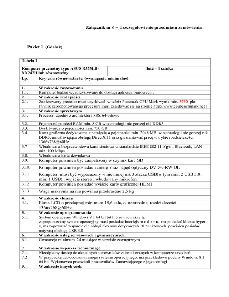 Załącznik nr 6 – Uszczegółowienie przedmiotu zamówienia Pakiet 1 (Gdańsk) Tabela 1 Komputer przenośny typu ASUS R553LBXX247H lub równoważny Lp. Kryteria równoważności (wymagania minimalne): 1. 1.1. 2. 2.1. 3. 3.1. 3.2. 3.3. 3.4. 3.7 3.8. 3.9. Ilość – 1 sztuka W zakresie zastosowania Komputer będzie wykorzystywany do obsługi aplikacji biurowych . W zakresie wydajności Zaoferowany procesor musi uzyskiwać w teście Passmark CPU Mark wynik min. 3750 pkt. (wynik zaproponowanego procesora musi znajdować się na stronie http://www.cpubenchmark.net ) W zakresie sprzętowym Procesor zgodny z architekturą x86, 64-bitowy Pojemność pamięci RAM min. 8 GB w technologii nie gorszej niż DDR3 Dysk twardy o pojemności min. 750 GB Karta graficzna dedykowana z pamięcią o pojemności min. 2048 MB, w technologii nie gorszej niż DDR3, umożliwiająca obsługę DirectX 11 oraz gwarantować pracę w trybie rozdzielczości 1366x768@60Hz Wbudowana bezprzewodowa karta sieciowa w standardzie IEEE 802.11 b/g/n , Bluetooth, LAN min. 100 Mbps Wbudowana karta dźwiękowa Komputer powinien być zaopatrzony w czytnik kart SD 3.10. Komputer powinien posiadać kamerę oraz napęd optyczny DVD+/-RW DL 3.11 3.12 Komputer musi być wyposażony w nie mniej niż 3 złącza USB(w tym min. 2 USB 3.0 i min. 1 USB) , wyjście stereo i wbudowany mikrofon Komputer powinien posiadać wyjście karty graficznej HDMI 3.13 Waga maksymalna nie powinna przekraczać 2,5 kg 4. 4.1. 5. 5.1. 6. 6.1. 7. 7.1. 7.2 9. W zakresie ekranu Ekran LCD o przekątnej minimum 15,6 cala, o nominalnej rozdzielczości 1366x768@60Hz W zakresie oprogramowania System operacyjny Windows 8.1 64 bit bit lub równoważny tj. zaproponowany system operacyjny musi posiadać interfejs m o d e r n, ma posiadać klienta hyperv, ma zapewniać wsparcie dla obługi ekranów dotykowych 10 punktowych, powinien posiadać natywną obsługę USB 3.0 W zakresie usług serwisowych i gwarancyjnych. Gwarancja minimum 24 miesiące w serwisie zewnętrznym. W zakresie wsparcia technicznego Nieodpłatny dostęp do aktualnych sterowników zainstalowanych w komputerze urządzeń W przypadku zastosowania innego systemu operacyjnego, niż przykładowo podany Windows 8.1 64 bit, Wykonawca przeszkoli pracowników Zamawiającego z jego obsługi W zakresie innych cech. 9.1. 9.2. 9.3. 9.4. 10. 10.1. Komputer musi być fabrycznie nowy. Zgodności systemu operacyjnego z oferowanym modelem komputera. Komputer musi posiadać myszkę komputerową. Myszka komputerowa wykonana w technologii optycznej, przewodowa, z 2 przyciskami oraz rolką przewijania (scroll) i interfejsie USB. Do komputera ma być dołączona torba służąca do jego transportowania W zakresie certyfikatów i standardów. Deklaracja zgodności CE - dopuszcza się złożenie w języku angielskim (należy dołączyć do oferty) Tabela nr 2 Monitor LCD Lp. Opis minimalnych wymagań lub konfiguracji Ilość – 1 sztuka 1. W zakresie sprzętowym 1.1 1.2 1.3 1.4 1.5 1.6 1.7 1.8 1.9 1.10 1.11 1.12 1.13 1.14 3. przekątna rodzaj podświetlenia rozdzielczość nominalna kontrast jasność czas reakcji kąt widzenia pion kąt widzenia poziom D-Sub 15 pin cyfrowe złącze DVI porty wejścia/wyjścia zgodność z technologią HDCP głośniki Waga W zakresie usług serwisowych i gwarancyjnych min. 24 cale LED 1920 x 1080 piksele min. 1000:1 min. 250 cd/m2 max. 2ms min. 160 stopni min. 170 stopni tak tak słuchawkowe, min. 1 x HDMI tak tak max. 7 kg 3.1 Gwarancja Gwarancja min. 2 lata Pakiet 2 (Warszawa) Tabela 3 Komputer przenośny typu HP ProBook 430 (G6W29EA) lub równoważny Lp. Kryteria równoważności (wymagania minimalne): 1. 1.1. 2. 2.1. 3. 3.1. 3.2. 3.3. 3.4. 3.7 Ilość – 1 sztuka W zakresie zastosowania Komputer będzie wykorzystywany do obsługi aplikacji biurowych . W zakresie wydajności Zaoferowany procesor musi uzyskiwać w teście Passmark CPU Mark wynik min. 2650 pkt. (wynik zaproponowanego procesora musi znajdować się na stronie http://www.cpubenchmark.net ) W zakresie sprzętowym Procesor zgodny z architekturą x86, 64-bitowy Pojemność pamięci RAM min. 4 GB w technologii nie gorszej niż DDR3 Dysk twardy SSD o pojemności min. 128 GB Karta graficzna z pamięcią o pojemności min. 512 MB, w technologii nie gorszej niż DDR3, umożliwiająca obsługę DirectX 11 oraz gwarantować pracę w trybie rozdzielczości 1366x768@60Hz Wbudowana bezprzewodowa karta sieciowa w standardzie IEEE 802.11 b/g/n , Bluetooth, LAN min. 1 Gbps Wbudowana karta dźwiękowa 3.8. 3.9. Komputer powinien być zaopatrzony w czytnik kart SD 3.10. Komputer powinien posiadać kamerę 3.11 3.12 Komputer musi być wyposażony w nie mniej niż 3 złącza USB(w tym min. 2 USB 3.0 i min. 1 USB) , wyjście stereo i wbudowany mikrofon Komputer powinien posiadać wyjście karty graficznej D-Sub i HDMI 3.13 Waga maksymalna nie powinna przekraczać 1,6 kg 4. 4.1. 5. 5.1. 6. 6.1. 7. 7.1. 7.2 9. 9.1. 9.2. 9.3. 9.4. W zakresie ekranu Ekran LCD o przekątnej minimum 13,3 cala, o nominalnej rozdzielczości 1366x768@60Hz W zakresie oprogramowania System operacyjny Windows 8 64 bit bit lub równoważny tj. zaproponowany system operacyjny musi posiadać interfejs m o d e r n, ma posiadać klienta hyperv, ma zapewniać wsparcie dla obługi ekranów dotykowych 10 punktowych, powinien posiadać natywną obsługę USB 3.0 W zakresie usług serwisowych i gwarancyjnych. Gwarancja minimum 12 miesięcy w serwisie zewnętrznym. W zakresie wsparcia technicznego Nieodpłatny dostęp do aktualnych sterowników zainstalowanych w komputerze urządzeń W przypadku zastosowania innego systemu operacyjnego, niż przykładowo podany Windows 8 64 bit, Wykonawca przeszkoli pracowników Zamawiającego z jego obsługi W zakresie innych cech. Komputer musi być fabrycznie nowy. Zgodności systemu operacyjnego z oferowanym modelem komputera. Komputer musi posiadać myszkę komputerową. Myszka komputerowa wykonana w technologii optycznej, przewodowa, z 2 przycis