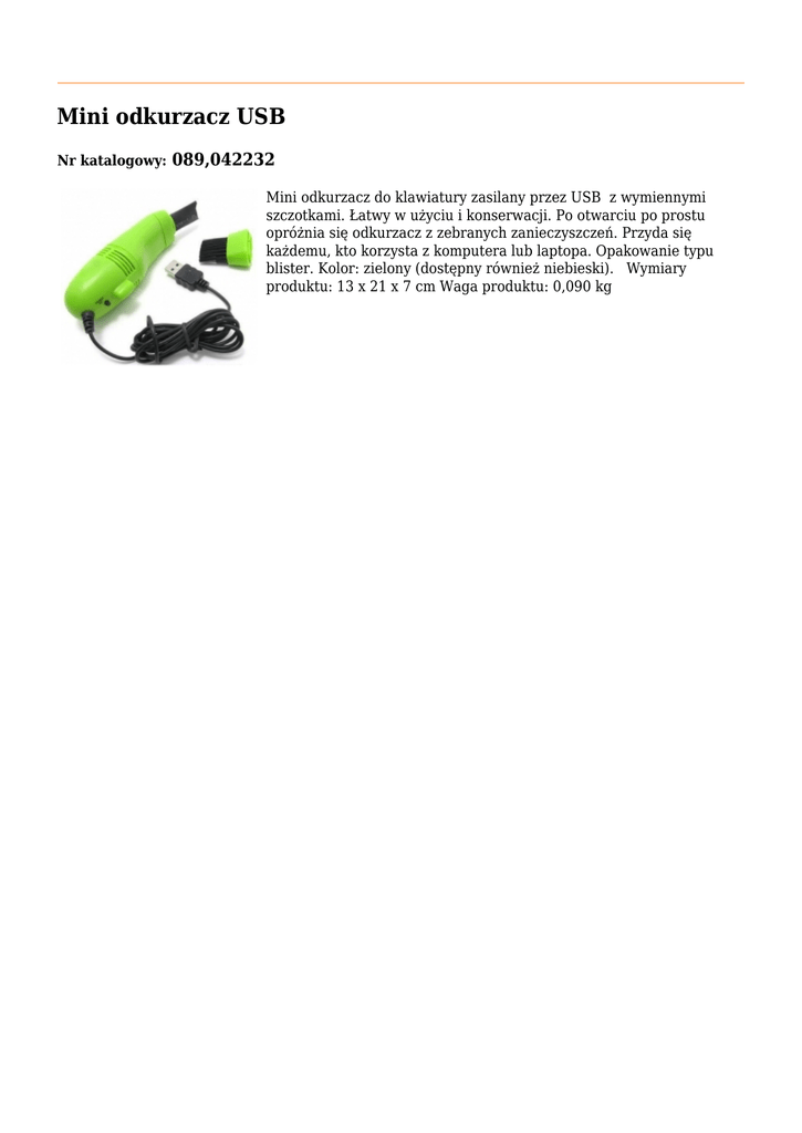 Mini odkurzacz USB Nr katalogowy: 089,042232 Mini odkurzacz do klawiatury zasilany przez USB z wymiennymi szczotkami. Łatwy w użyciu i konserwacji. Po otwarciu po prostu opróżnia się odkurzacz z zebranych zanieczyszczeń. Przyda się każdemu, kto korzysta z komputera lub laptopa. Opakowanie typu blister. Kolor: zielony (dostępny również niebieski). Wymiary produktu: 13 x 21 x 7 cm Waga produktu: 0,090 kg