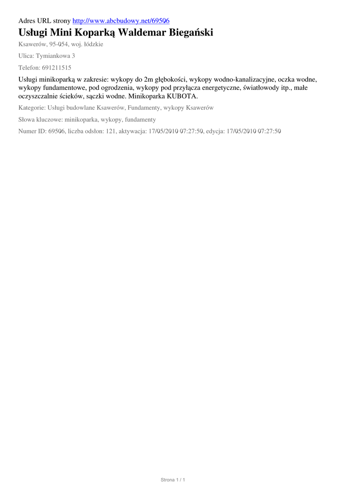 Adres URL strony http://www.abcbudowy.net/69506 Usługi Mini Koparką Waldemar Biegański Ksawerów, 95-054, woj. łódzkie Ulica: Tymiankowa 3 Telefon: 691211515 Usługi minikoparką w zakresie: wykopy do 2m głębokości, wykopy wodno-kanalizacyjne, oczka wodne, wykopy fundamentowe, pod ogrodzenia, wykopy pod przyłącza energetyczne, światłowody itp., małe oczyszczalnie ścieków, sączki wodne. Minikoparka KUBOTA. Kategorie: Usługi budowlane Ksawerów, Fundamenty, wykopy Ksawerów Słowa kluczowe: minikoparka, wykopy, fundamenty Numer ID: 69506, liczba odsłon: 121, aktywacja: 17/05/2010 07:27:50, edycja: 17/05/2010 07:27:50 Strona 1 / 1