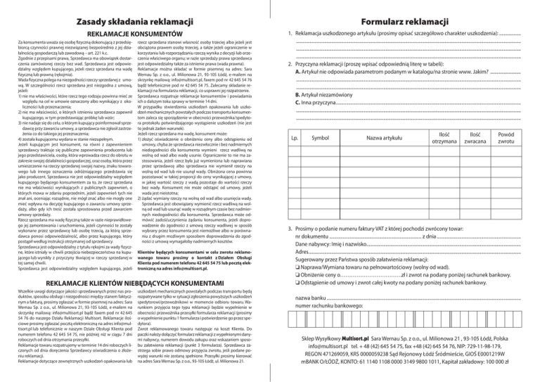Zasady składania reklamacji Formularz reklamacji REKLAMACJE KONSUMENTÓW 1. Reklamacja uszkodzonego artykułu (prosimy opisać szczegółowo charakter uszkodzenia):.................... ....................................................................................................................................................................................................... ....................................................................................................................................................................................................... ....................................................................................................................................................................................................... 2. Przyczyna reklamacji (proszę wpisać odpowiednią literę w tabeli): A. Artykuł nie odpowiada parametrom podanym w katalogu/na stronie www. Jakim? . .......................... ....................................................................................................................................................................................................... ....................................................................................................................................................................................................... B. Artykuł niezamówiony C. Inna przyczyna.................................................................................................................................................................... ....................................................................................................................................................................................................... ....................................................................................................................................................................................................... Za konsumenta uważa się osobę fizyczną dokonującą z przedsiębiorcą czynności prawnej niezwiązanej bezpośrednio z jej działalnością gospodarczą lub zawodową – art. 221 k.c. Zgodnie z przepisami prawa, Sprzedawca ma obowiązek dostarczenia zamówionej rzeczy bez wad. Sprzedawca jest odpowiedzialny względem kupującego, jeżeli rzecz sprzedana ma wadę fizyczną lub prawną (rękojmia). Wada fizyczna polega na niezgodności rzeczy sprzedanej z umową. W szczególności rzecz sprzedana jest niezgodna z umową, jeżeli: 1) nie ma właściwości, które rzecz tego rodzaju powinna mieć ze względu na cel w umowie oznaczony albo wynikający z okoliczności lub przeznaczenia; 2) nie ma właściwości, o których istnieniu sprzedawca zapewnił kupującego, w tym przedstawiając próbkę lub wzór; 3) nie nadaje się do celu, o którym kupujący poinformował sprzedawcę przy zawarciu umowy, a sprzedawca nie zgłosił zastrzeżenia co do takiego jej przeznaczenia; 4) została kupującemu wydana w stanie niezupełnym. Jeżeli kupującym jest konsument, na równi z zapewnieniem sprzedawcy traktuje się publiczne zapewnienia producenta lub jego przedstawiciela, osoby, która wprowadza rzecz do obrotu w zakresie swojej działalności gospodarczej, oraz osoby, która przez umieszczenie na rzeczy sprzedanej swojej nazwy, znaku towarowego lub innego oznaczenia odróżniającego przedstawia się jako producent. Sprzedawca nie jest odpowiedzialny względem kupującego będącego konsumentem za to, że rzecz sprzedana nie ma właściwości wynikających z publicznych zapewnień, o których mowa w zdaniu poprzednim, jeżeli zapewnień tych nie znał ani, oceniając rozsądnie, nie mógł znać albo nie mogły one mieć wpływu na decyzję kupującego o zawarciu umowy sprzedaży, albo gdy ich treść została sprostowana przed zawarciem umowy sprzedaży. Rzecz sprzedana ma wadę fizyczną także w razie nieprawidłowego jej zamontowania i uruchomienia, jeżeli czynności te zostały wykonane przez sprzedawcę lub osobę trzecią, za którą sprzedawca ponosi odpowiedzialność, albo przez kupującego, który postąpił według instrukcji otrzymanej od sprzedawcy. Sprzedawca jest odpowiedzialny z tytułu rękojmi za wady fizyczne, które istniały w chwili przejścia niebezpieczeństwa na kupującego lub wynikły z przyczyny tkwiącej w rzeczy sprzedanej w tej samej chwili. Sprzedawca jest odpowiedzialny względem kupującego, jeżeli rzecz sprzedana stanowi własność osoby trzeciej albo jeżeli jest obciążona prawem osoby trzeciej, a także jeżeli ograniczenie w korzystaniu lub rozporządzaniu rzeczą wynika z decyzji lub orzeczenia właściwego organu; w razie sprzedaży prawa sprzedawca jest odpowiedzialny także za istnienie prawa (wada prawna). Reklamacje można składać w formie pisemnej na adres: Sara Wernau Sp. z o.o., ul. Milionowa 21, 93-105 Łódź, e-mailem na skrzynkę mailową: [email protected], faxem pod nr 42 645 54 76 bądź telefonicznie pod nr 42 645 54 75. Zalecamy składanie reklamacji na formularzu reklamacji, co usprawni jej rozpatrzenie. Sprzedawca rozpatruje reklamacje konsumentów i powiadamia ich o dalszym toku sprawy w terminie 14 dni. W przypadku stwierdzenia uszkodzeń opakowania lub uszkodzeń mechanicznych powstałych podczas transportu konsumentom zaleca się sporządzenie w obecności przewoźnika/spedytora protokołu potwierdzającego wystąpienie uszkodzeń (nie jest to jednak żaden warunek). Jeżeli rzecz sprzedana ma wadę, konsument może: 1) złożyć oświadczenie o obniżeniu ceny albo odstąpieniu od umowy, chyba że sprzedawca niezwłocznie i bez nadmiernych niedogodności dla konsumenta wymieni rzecz wadliwą na wolną od wad albo wadę usunie. Ograniczenie to nie ma zastosowania, jeżeli rzecz była już wymieniona lub naprawiana przez sprzedawcę albo sprzedawca nie wymienił rzeczy na wolną od wad lub nie usunął wady. Obniżona cena powinna pozostawać w takiej proporcji do ceny wynikającej z umo