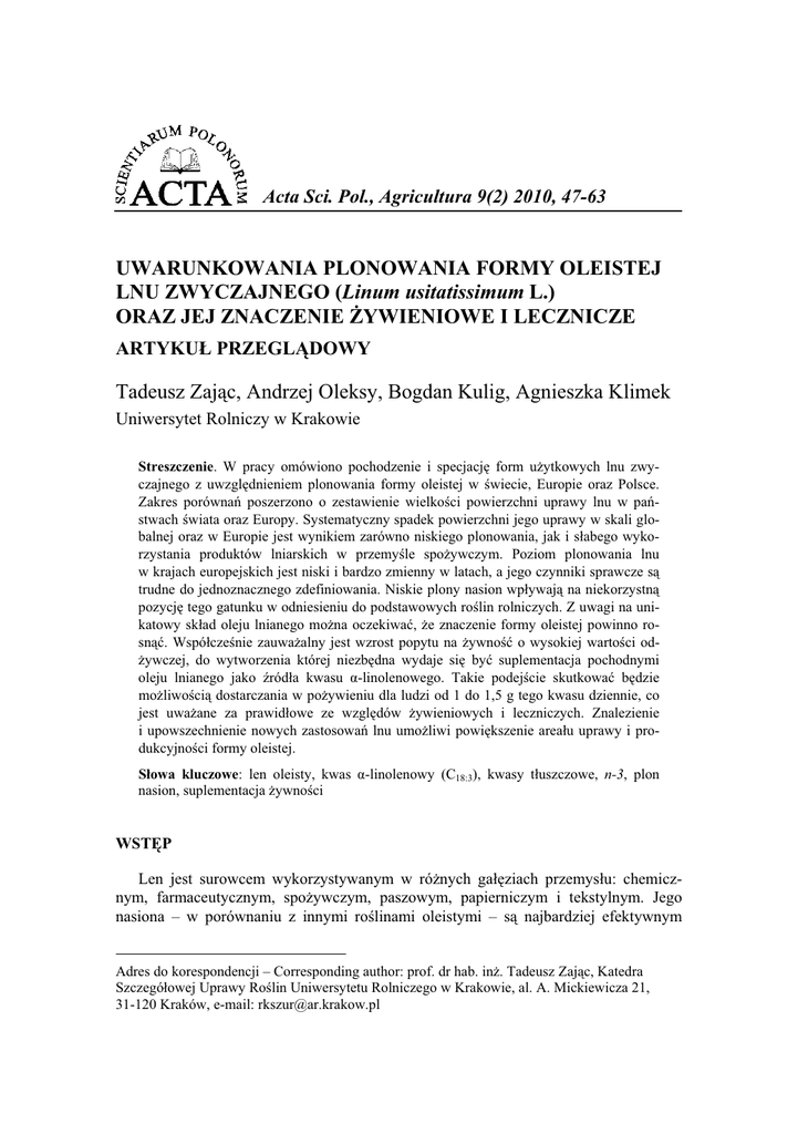 Acta Sci. Pol., Agricultura 9(2) 2010, 47-63 UWARUNKOWANIA PLONOWANIA FORMY OLEISTEJ LNU ZWYCZAJNEGO (Linum usitatissimum L.) ORAZ JEJ ZNACZENIE YWIENIOWE I LECZNICZE ARTYKU PRZEGLDOWY Tadeusz Zajc, Andrzej Oleksy, Bogdan Kulig, Agnieszka Klimek Uniwersytet Rolniczy w Krakowie 1 Streszczenie. W pracy omówiono pochodzenie i specjacj form uytkowych lnu zwyczajnego z uwzgldnieniem plonowania formy oleistej w wiecie, Europie oraz Polsce. Zakres porówna poszerzono o zestawienie wielkoci powierzchni uprawy lnu w pastwach wiata oraz Europy. Systematyczny spadek powierzchni jego uprawy w skali globalnej oraz w Europie jest wynikiem zarówno niskiego plonowania, jak i sabego wykorzystania produktów lniarskich w przemyle spoywczym. Poziom plonowania lnu w krajach europejskich jest niski i bardzo zmienny w latach, a jego czynniki sprawcze s trudne do jednoznacznego zdefiniowania. Niskie plony nasion wpywaj na niekorzystn pozycj tego gatunku w odniesieniu do podstawowych rolin rolniczych. Z uwagi na unikatowy skad oleju lnianego mona oczekiwa, e znaczenie formy oleistej powinno rosn. Wspóczenie zauwaalny jest wzrost popytu na ywno o wysokiej wartoci odywczej, do wytworzenia której niezbdna wydaje si by suplementacja pochodnymi oleju lnianego jako róda kwasu -linolenowego. Takie podejcie skutkowa bdzie moliwoci dostarczania w poywieniu dla ludzi od 1 do 1,5 g tego kwasu dziennie, co jest uwaane za prawidowe ze wzgldów ywieniowych i leczniczych. Znalezienie i upowszechnienie nowych zastosowa lnu umoliwi powikszenie areau uprawy i produkcyjnoci formy oleistej. Sowa kluczowe: len oleisty, kwas -linolenowy (C18:3), kwasy tuszczowe, n-3, plon nasion, suplementacja ywnoci WSTP Len jest surowcem wykorzystywanym w rónych gaziach przemysu: chemicznym, farmaceutycznym, spoywczym, paszowym, papierniczym i tekstylnym. Jego nasiona – w porównaniu z innymi rolinami oleistymi – s najbardziej efektywnym Adres do korespondencji – Corresponding author: prof. dr hab. in. Tadeusz Zajc, Katedra Szczegóowej Uprawy Rolin Uniwersytetu Rolniczego w Krakowie, al. A. Mickiewicza 21, 31-120 Kraków, e-mail: [email protected] 48 T. Zajc, A. Oleksy, B. Kulig, A. Klimek i stabilnym oraz tanim ródem kwasu -linolenowego z rodziny n-3. Nasiona lnu, zwyczajowo zwane siemieniem lnianym (Semen lini), od dawna wykorzystywane byy jako rodek leczniczy, szczególnie przydatny w leczeniu chorób przewodu pokarmowego ze wzgldu na dziaanie dietetyczne, przeczyszczajce i osaniajce [Rumiska 1990]. Siemi lniane mielone lub preparowane, przyjmowane w iloci 2-3 yeczki dziennie, daje uczucie sytoci, co moe by istotne dla osób otyych [Tokarz 1994]. Ostatnio uzyskane estry etylowe oleju lnianego, wyprodukowane z oleju wytoczonego na zimno, mog by uyte do suplementacji rónych produktów ywnociowych, majcych due znaczenie w profilaktyce chorób dietozalenych u ludzi [Regua-Sardat i in. 2008]. Cae nasiona, wytoki lniane i ruta poekstrakcyjna wykorzystywane s jako pokarm i pasza, poniewa s szczególnie zasobne we wókno, luzy, lignany, zwizki fenolowe oraz niezbdne nienasycone kwasy tuszczowe (NNKT), gównie z rodziny n-3. W skali wiata zarysowa si obecnie trend wzrostu popytu na ywno o wysokiej wartoci odywczej, odznaczajcej si odpowiednimi dla konsumenta walorami dietetycznymi. Do wytworzenia takiej ywnoci przydatne s oleje rolinne, cae nasiona rolin oleistych oraz makuchy i ruty poekstrakcyjne, w tym zwaszcza lnu. W ywieniu zwierzt zaleca si stosowa makuchy i ruty poekstrakcyjne oraz zmielone nasiona rolin oleistych – gównie rzepaku i lnu, a take pynne oleje rybne i rolinne w celu zwikszenia zawartoci w produktach zwierzcych NNKT, gwarantujcych spadek poziomu cholesterolu w misie, mleku i ótkach jaj [wiek 2006]. NNKT stosowane s w ywieniu zwierzt jako dodatek 3-6%-owy, obliczony dla suchej masy dawki pokarmowej [wiek 2006]. Uproszczenie diety spoeczestw przemysowych skutkuje rozszerzeniem proporcji NNKT z rodzin n-6 i n-3, zwikszajc ryzyko wystpienia wielu dietozalenych chorób cywilizacyjnych, w tym take niektórych nowotworowych [Simopoulos 1999]. Zdaniem wielu badaczy z obszaru medycyny, konieczne jest wzbogacenie diety ludzi w NNKT z rodziny n-3. Zrozumienie ywieniowej i leczniczej roli kwasu -linolenowego w diecie wspóczesnych ludzi wpyno na poszukiwanie innych róde rolinnych ni len. Wskazano, e tak rolin moe by lewkonia szara, zwana take maciejk ogrodow (Matthiola incana R. Br.) z rodziny kapustowatych [Zohara i in. 1997]. Jednak waciwoci botaniczne i rolniczo-uytkowe tego gatunku nie rokuj uzyskania przez ni istotnego znaczenia gospodarczego w Polsce, gównie z uwagi na ciepolubno i wraliwo na przymrozki. Rolina ta w warunkach dowiadczalnych (Izrael) daa plon nasion wysokoci 750 kgha-1, zawierajcych 20-25% tuszczu. Nasiona tego gatunku s bardzo mae, a masa 1000 nasion oscyluje wokó 2 gramów. Formy lnianki – ozima i jara, od dawna uprawiane w Polsce, zawieraj olej, w skad którego wchodz kwas -linolenowy, ale równoczenie erukowy, utrudniajcy jego ywieniowe wykorzystanie. Pene pokrycie rosncych potrzeb w zakresie zwikszenia produkcji oleju lnianego na cele ywieniowe moe nastpi wycznie przez wzrost areau uprawy lnu oleistego z równoczesnym podniesieniem plonowania. Ograniczenie w ostatnich latach uprawy lnu wóknistego skutkuje mniejszym dopywem nasion pozyskiwanych jako plon uboczny. Zajc [2004b] podkrela, e forma oleista lnu na wiecie miaa stabiln powierzchni zasiewów w latach 90. XX wieku, a jej plonowanie w skali wiata naley uzna za stosunkowo stae, aczkolwiek pozostajce na niskim poziomie. Powierzchnia lnu uprawianego na wókno w analogicznym okresie zmniejszya si prawie dwukrotnie, przy czym temu spadkowi towarzyszy znaczny wzrost plonu wókna. wiadczy to prawdopodobnie o tym, e w krajach, które utrzymay wókienniczy przemys lniarski, w odpowiednich warunkach siedliska wprowadzono intensywn technologi uprawy. Acta Sci. Pol. Uwarunkowania plonowania... 49 Poziom plonowania lnu w krajach europejskich jest niski,
