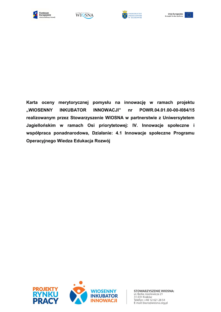 Karta oceny merytorycznej pomysłu na innowację w ramach projektu „WIOSENNY INKUBATOR INNOWACJI” nr POWR.04.01.00-00-I084/15 realizowanym przez Stowarzyszenie WIOSNA w partnerstwie z Uniwersytetem Jagiellońskim w ramach Osi priorytetowej: IV. Innowacje społeczne i współpraca ponadnarodowa, Działanie: 4.1 Innowacje społeczne Programu Operacyjnego Wiedza Edukacja Rozwój Kryteria merytoryczne dostępu Kryterium Nowość proponowanego rozwiązania Kryterium Opis Punktacja Opisane we wniosku rozwiązanie ma duże szanse, by w nowy lub znacząco zmieniony względem istniejących rozwiązań sposób rozwiązać wskazane problemy społeczne. Nowość rozwiązania oceniana jest na poziomie krajowym. Zadaniem wnioskodawcy jest opisanie proponowanego sposobu na tle istniejących, stosunkowo najbardziej podobnych rozwiązań istniejących w kraju. Tak/nie Kryteria merytoryczne punktowane Kryterium Kryterium Przedmiotem oceny będzie powiązanie zakładanych efektów projektu (celów) z problemami społecznymi. W ramach oceny będą brane pod uwagę: poprawność zdefiniowania celów i wskaźników efektów (produktów i rezultatów), uzasadnienie w jaki sposób Użyteczność efekty projektu mogą przełożyć się na rozwiązanie problemu, rozwiązania znaczenie innowacji dla otoczenia. 0-5 (minimum 3) W ramach kryterium przedmiotem oceny będzie możliwość wdrożenia rozwiązania w skali mikro (w środowisku lokalnym np. na terenie konkretnej gminy, powiatu, zakładu pracy etc.). W ramach oceny będą brane pod uwagę: poprawnie zdefiniowani interesariusze oraz ich preferencje, wykazanie, że interesariusze Możliwość będą zainteresowani wdrożeniem/będzie ono dla nich zaimplementowa korzystne/atrakcyjne (np. bardziej efektywne) - także w kontekście nia innych dostępnych dla nich możliwości. 0-5 (minimum 3) W ramach kryterium przedmiotem oceny będzie możliwość wdrożenia rozwiązania w skali makro - możliwość upowszechnienia opracowanych innowacji społecznych na szeroką skalę po zakończeniu projektu. W ramach oceny będą brane pod uwagę: a) poprawnie zdefiniowani interesariusze oraz ich preferencje, b) liczba potencjalnych ostatecznych odbiorców opracowanych innowacji społecznych, c) wykazanie, że interesariusze będą zainteresowani wdrożeniem/będzie ono dla nich korzystne/atrakcyjne np. bardziej efektywne (także w kontekście innych dostępnych dla nich opcji); np. opis dotyczący pracodawców Możliwość może odnosić się do opłacalności zatrudnienia możliwości d) replikowania i zaangażowanie wnioskodawcy we wdrażanie rozwiązania w skali skalowalności makro. 0-5 (minimum 3) Włączenie odbiorców ostatecznych w W ramach kryterium oceniane będzie w jaki sposób realizowany proces tworzenia jest otwarty model innowacji tzn. czy najważniejsi interesariusze innowacji innowacji są włączani w proces jej tworzenia. 0-5 (minimum 3) W ramach kryterium przedmiotem oceny będą: a) doświadczenie wnioskodawcy w realizacji podobnych projektów, b) doświadczenie Potencjał zespołu projektowego, c) sposób zarządzania w projekcie, d) wnioskodawcy doświadczenie wnioskodawcy w realizacji procesów do wdrożenia innowacyjnych, e) kompetencje (kreatywność, twórcze myślenie) innowacji w skali wnioskodawcy, f) motywacja do wdrożenia pomysłu, poziom mikro i sposób zaangażowania. zaplanowania Punkty a, b, c nie dotyczą osób fizycznych i grup nieformalnych. wdrożenia. 0-10 (minimum 6) Szczegółowe uzasadnienie oceny i przyznanej liczby punktów w każdym z kryteriów: …………………………………………………………………………………………………………………………………………………………… …………………………………………………………………………………………………………………………………………………………… …………………………………………………………………………………………………………………………………………………………… …………………………………………………………………………………………………………………………………………………………… W przypadku zaznaczenia w kryterium „Nowość proponowanego rozwiązania” odpowiedzi „nie” wniosek zostaje oceniony negatywnie i nie podlega dalszej ocenie merytorycznej. Niniejszym oświadczam, że: - zapoznałem/zapoznałam się z procedurami dotyczącymi projektu grantowego „WIOSENNY INKUBATOR INNOWACJI”, - w przypadku stwierdzenia przeze mnie zależności pozostawania w związku małżeńskim albo w stosunku pokrewieństwa lub powinowactwa w linii prostej, pokrewieństwa lub powinowactwa w linii bocznej do drugiego stopnia i/lub związania z tytułu przysposobienia, opieki, kurateli z którymkolwiek z podmiotów ubiegających się o dofinansowanie, ich zastępcami prawnymi lub członkami władz osób prawnych ubiegających się o udzielenie dofinansowania, zobowiązuję się do niezwłocznego poinformowania o tym fakcie Stowarzyszenie WIOSNA i wycofania się z oceny projektu; - zgodnie z posiadaną przeze mnie wiedzą w ciągu ostatnich trzech lat poczynając od daty rozpoczęcia posiedzenia Komisji nie pozostawałem/łam w stosunku pracy lub zlecenia z żadnym z podmiotów ubiegających się o dofinansowanie ani nie byłem/łam członkiem władz żadnej z osób prawnych ubiegających się o dofinansowanie. W przypadku stwierdzenia takiej zależności zobowiązuję się do niezwłocznego poinformowania o tym fakcie Stowarzyszenie WIOSNA i wycofania się z oceny projektu; - zgodnie z posiadaną przeze mnie wiedzą nie pozostaję z żadnym z podmiotów ubiegających się o dofinansowanie, w takim stosunku prawnym lub faktycznym, że może to budzić uzasadnione wątpliwości co do mojej bezstronności. W przypadku stwierdzenia takiej zależności zobowiązuję się do