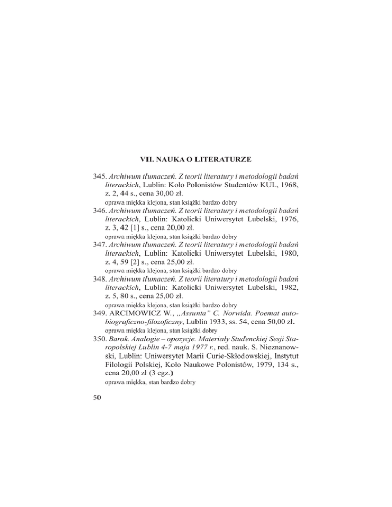 VII. NAUKA O LITERATURZE 345. Archiwum tłumaczeń. Z teorii literatury i metodologii badań literackich, Lublin: Koło Polonistów Studentów KUL, 1968, z. 2, 44 s., cena 30,00 zł. oprawa miękka klejona, stan książki bardzo dobry 346. Archiwum tłumaczeń. Z teorii literatury i metodologii badań literackich, Lublin: Katolicki Uniwersytet Lubelski, 1976, z. 3, 42 [1] s., cena 20,00 zł. oprawa miękka klejona, stan książki bardzo dobry 347. Archiwum tłumaczeń. Z teorii literatury i metodologii badań literackich, Lublin: Katolicki Uniwersytet Lubelski, 1980, z. 4, 59 [2] s., cena 25,00 zł. oprawa miękka klejona, stan książki bardzo dobry 348. Archiwum tłumaczeń. Z teorii literatury i metodologii badań literackich, Lublin: Katolicki Uniwersytet Lubelski, 1982, z. 5, 80 s., cena 25,00 zł. oprawa miękka klejona, stan książki bardzo dobry 349. ARCIMOWICZ W., „Assunta” C. Norwida. Poemat autobiograficzno-filozoficzny, Lublin 1933, ss. 54, cena 50,00 zł. oprawa miękka klejona, stan książki dobry 350. Barok. Analogie – opozycje. Materiały Studenckiej Sesji Staropolskiej Lublin 4-7 maja 1977 r., red. nauk. S. Nieznanowski, Lublin: Uniwersytet Marii Curie-Skłodowskiej, Instytut Filologii Polskiej, Koło Naukowe Polonistów, 1979, 134 s., cena 20,00 zł (3 egz.) oprawa miękka, stan bardzo dobry 50 VII. Nauka o literaturze 351. BIDWELL G., U kolebki angielskiego realizmu, „Wiedza Powszechna”, Warszawa 1960, ss. 231 + 3 nlb., cena 30,00 zł. oprawa miękka klejona, stan książki bardzo dobry 352. BIERNACKA B., Style i postawy. Szkice o poezji, Wydawnictwo Poznańskie, Poznań 1969, ss. 251, cena 20,00 zł. oprawa miękka klejona, stan książki bardzo dobry 353. BLÜTH R. M., Pisma literackie, oprac. P. Nowaczyński, „Znak”, Kraków 1984, ss. 367, cena 40,00 zł. oprawa miękka klejona, stan książki bardzo dobry 354. BRODZIŃSKI K., Pisma estetyczno-krytyczne, t. I-II, oprac. A. Łucki, Warszawa 1934, ss. 416 + 337, cena 100,00 zł. oprawa twarda, stan książki bardzo dobry 355. BUTOR M., Powieść jako poszukiwanie. Wybór esejów, Czytelnik, Warszawa 1971, ss. 324, cena 30,00 zł. oprawa miękka klejona, stan książki bardzo dobry 356. CHMIELOWSKI P., Historya Literatury Polskiej, t. III-VI, Drukarnia „Biblioteki Dzieł Wyborowych”, Warszawa 1899-1900, ss. 234 + 266 + 278 + 315, cena 160,00 zł. oprawa miękka klejona, stan książki bardzo dobry 357. CHRUŚCIŃSKI K., Józef Dzierzkowski. Pisarz i działacz polityczny okresu międzypowstaniowego (1881-1863), Gdańskie Towarzystwo Naukowe, Gdańsk 1970, ss. 167, cena 16,00 zł. oprawa miękka klejona, stan książki dobry 358. DĄBAŁA J., Horyzonty komunikacji medialnej, 166 s., Lublin: Wydawnictwo UMCS, 2006, cena 25,00 zł. oprawa miękka klejona, stan książki bardzo dobry 359. DĄBROWOLSKA H. M., O Karolu Irzykowskim, Wydawnictwo Władysława Bąka, Łódź-Wrocław [b.r.w.], ss. 159 + 12 nlb., cena 22,00 zł. oprawa miękka klejona, stan książki bardzo dobry 51 VII. Nauka o literaturze 360. DUNAJSKI A. ks., Chrześcijańska interpretacja dziejów w pismach Cypriana Norwida, Lublin: RW KUL, 1985, 282 [4] s., cena 40,00 zł (2 egz.) oprawa miękka klejona, lekko przetarta na krawędziach, stan książki dobry 361. DUNINÓWNA H., Kobieto puchu marny, Wydawnictwo Łódzkie, Łódź 1965, ss. 225 + 2 nlb., cena 28,00 zł. oprawa miękka, stan bardzo dobry 362. DYBOSKI R., Wielcy pisarze amerykańscy, „Pax”, Warszawa 1958, ss. 658, cena 50,00 zł. oprawa miękka, stan bardzo dobry 363. FRANIA A., Poświatowska, Marjańska, Cichla-Czarniawska. Trzy szkice typu ziemia-ziemia-ziemia, Wydawnictwo „e media”, Częstochowa 2007, ss. 87, cena 10,00 zł. oprawa miękka, stan bardzo dobry 364. GŁOWIŃSKI M., Gry powieściowe, PWN, Warszawa 1973, ss. 347, cena 40,00 zł. oprawa miękka, stan bardzo dobry 365. GORIACZKO-BORKOWSKA A., Twórczość poetycka Augusta Bielowskiego, Wrocław 1965, ss. 188 + 1 nlb., cena 20,00 zł. oprawa miękka, stan bardzo dobry 366. Grass: punkty widzenia, red. i wybór: M. Janion, W. Maksymowicz, S. Rosiek, „Hybrydy”, Warszawa 1984, ss. 53-147, cena 15,00 zł. oprawa miękka, stan bardzo dobry 367. HERNAS C., Literatura baroku, Warszawa: Państwowe Wydawnictwo Naukowe, 1976, 317 s., cena 30,00 zł. oprawa miękka, stan bardzo dobry 368. HEUCKELOM K. van, „Patrzeć w promień od ziemi odbity”. Wizualność w poezji Czesława Miłosza, Warszawa: Wydawnictwo IBL, 2004, 225 [3] nlb., cena 40,00 zł. oprawa miękka klejona, stan książki bardzo dobry 52 VII. Nauka o literaturze 369. Historycznoliterackie prace ćwiczeniowe, red. T. Polanowski, P. Doroszewski, KUL, Lublin 1972, ss. 126, cena 25,00 zł. oprawa miękka, stan bardzo dobry 370. Historycznoliterackie prace ćwiczeniowe, red. W. Dąbrowski, P. Doroszewski, T. Polanowski, KUL, Lublin 1974, ss. 67, cena 25,00 zł. oprawa miękka, stan bardzo dobry 371. Historycznoliterackie prace ćwiczeniowe, z. 3, red. A. Dobak, RW KUL, Lublin 1979, ss. 126, cena 25,00 zł. oprawa miękka, stan bardzo dobry 372. Historycznoliterackie prace ćwiczeniowe, z. 4, red. L. Formela, RW KUL, Lublin 1981, ss. 72 + 36 fot., cena 25,00 zł. oprawa miękka, stan bardzo dobry 373. HUTNIKIEWICZ A., Od czystej formy do literatury faktu. Główne teorie i programy literackie XX wieku, wyd. 1, Toruń: Towarzystwo Naukowe w Toruniu, 1965, 225 s., cena 30,00 zł. oprawa miękka klejona z obwolutą częściowo naderwaną, stan dobry 374. JABŁKOWSKA R., Joseph Conrad 1857-1924, Zakład Narodowy im. Ossolińskich, PAN, Wrocław, Warszawa, Kraków 1961, ss. 406, cena 45,00 zł. oprawa miękka, stan dobry 375. JASTRUN M., Szkic o Adamie Mickiewiczu, Wydawnictwo „Polonia”, Warszawa 1956, ss. 76, cena 8,00 zł. oprawa miękka, stan dobry 376. JASIŃSKA-WOJTKOWSKA M., Horyzonty literackiego sacrum, Wydawnictwo KUL, Lublin 2003, ss. 498, cena 35,00 zł. oprawa miękka, stan bardzo dobry 53 VII. Nauka o literaturze 377. JUSZYŃSKI H., Dykcyona