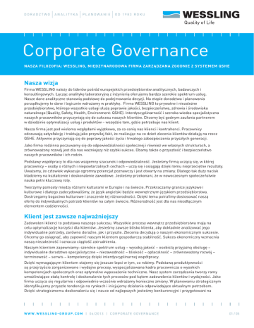 DORADZTWO ANALITYKA PLANOWANIE OD 1983 ROKU Corporate Governance NASZA FILOZOFIA: WESSLING, MIĘDZYNARODOWA FIRMA ZARZĄDZANA ZGODNIE Z SYSTEMEM QSHE Nasza wizja Firma WESSLING należy do liderów pośród europejskich przedsiębiorstw analitycznych, badawczych i konsultingowych. Łącząc analitykę laboratoryjną z inżynierią oferujemy bardzo szerokie spektrum usług. Nasze dane analityczne stanowią podstawę do podejmowania decyzji. Na etapie doradztwa i planowania porządkujemy te dane i logicznie wdrażamy w praktykę. Firma WESSLING to prywatne i niezależne przedsiębiorstwo, którego wszystkie usługi służą poprawie jakości, bezpieczeństwa, zdrowia i środowiska naturalnego (Quality, Safety, Health, Environment: QSHE). Interdyscyplinarność i szeroka wiedza specjalistyczna naszych pracowników przyczyniają się do sukcesu naszych klientów. Chcemy być godnym zaufania partnerem w dziedzinie optymalizacji usług i produktów – wszędzie tam, gdzie potrzebuje nas klient. Nasza firma jest pod wieloma względami wyjątkowa, za co cenią nas klienci i kontrahenci. Pracownicy odczuwają satysfakcję i traktują jako przywilej fakt, że realizując na co dzień zlecenia klientów działają na rzecz QSHE. Aktywnie przyczyniają się do poprawy jakości życia i trwałego zabezpieczenia przyszłych generacji. Jako firma rodzinna poczuwamy się do odpowiedzialności społecznej i również we własnych strukturach, a zrównoważony rozwój jest dla nas ważniejszy niż szybki sukces. Dbamy także o przyszłość i bezpieczeństwo naszych pracowników i ich rodzin. Podstawy współpracy to dla nas wzajemny szacunek i odpowiedzialność. Jesteśmy firmą uczącą się, w której pracownicy – osoby o różnych i niepowtarzalnych cechach – uczą się i osiągają dzięki temu nieprzeciętne rezultaty. Uważamy, że człowiek wykazuje ogromny potencjał poznawczy i jest otwarty na zmiany. Dlatego tak duży nacisk kładziemy na kształcenie i doskonalenie zawodowe. Jesteśmy przekonani, że w nowoczesnym społeczeństwie nauka pełni kluczową rolę. Tworzymy pomosty między różnymi kulturami w Europie i na świecie. Przekraczamy granice językowe i kulturowe i dlatego zadecydowaliśmy, że język angielski będzie wewnętrznym językiem przedsiębiorstwa. Dostrzegamy bogactwo kulturowe i znaczenie tej różnorodności. Dzięki temu potrafimy dostosować naszą ofertę do indywidualnych potrzeb klientów na całym świecie. Różnorodność jest dla nas nieodłącznym elementem codzienności. Klient jest zawsze najważniejszy Zadowoleni klienci to podstawa naszego sukcesu. Wszystkie procesy wewnątrz przedsiębiorstwa mają na celu optymalizację korzyści dla klientów. Jesteśmy zawsze blisko klienta, aby dokładnie analizować jego indywidualne potrzeby, zarówno doraźne, jak i przyszłe. Zlecenia decydują o naszym ekonomicznym sukcesie. Chcemy go osiągnąć, aby zapewnić naszym klientom gospodarczą stabilność. Sukces ekonomiczny wzmacnia naszą niezależność i oznacza ciągłość zatrudnienia. Naszym klientom zapewniamy: szerokie spektrum usług – wysoką jakość – osobistą przyjazną obsługę – indywidualne doradztwo specjalistyczne – niezawodność – bliskość – opłacalność – zrównoważony rozwój – terminowość – serwis – kompetencję dzięki interdyscyplinarnej współpracy. Dzięki wymagającym klientom stajemy się jeszcze lepsi w tym, co robimy. Podstawą produktywności są przejrzyście zorganizowane i wydajne procesy, wyspecjalizowana kadra pracownicza o wysokich kompetencjach społecznych oraz optymalne wyposażenie techniczne. Nasz system zarządzania tworzy ramy umożliwiające stałą kontrolę i doskonalenie tych procesów pod kątem zadowolenia klientów i wydajności. Jako firma ucząca się regularnie i odpowiednio wcześnie wdrażamy konieczne zmiany. W planowaniu strategicznym identyfikujemy przyszłe tendencje na rynkach i inicjujemy działania odpowiadające aktualnym potrzebom. Dzięki strategicznemu doskonaleniu się i nauce od najlepszych jesteśmy konkurencyjni i przygotowani na W W W . W E S S L I N G - G R O U P . C O M | 0 6 /2 0 1 3 | C O R P O R AT E G O V E R N A N C E 01 / 05 DORADZTWO ANALITYKA PLANOWANIE OD 1983 ROKU przyszłość, którą chcemy aktywnie współtworzyć. Innowacje w procesach i usługach są siłą napędową sukcesu zarówno naszego przedsiębiorstwa, jak i naszych klientów. Jako międzynarodowy koncern o zdecentralizowanej strukturze posiadamy przedstawicielstwa regionalne. Dzięki nim klient wie, że jesteśmy zawsze blisko niego, dyspozycyjni i efektywni. Dynamiczny wzrost przedsiębiorstwa wynika z jego siły i opiera się na ciągłym zdobywaniu doświadczeń oraz innowacyjności (strategia małych kroków). Tym samym zdecentralizowana struktura stanowi podstawę naszego sukcesu wśród zleceniodawców na całym świecie. Gęsta sieć przedstawicielstw, skoncentrowanie na potrzebach klientów, niezależność i innowacyjność, indywidualne rozwiązania i niezawodność – to dzięki tym czynnikom nawiązujemy długotrwałą współpracę z klientami. Niezależność – ważny filar przedsiębiorstwa Nasza niezależność jest ważnym filarem filozofii przedsiębiorstwa i jednym z ważniejszych czynników jego sukcesu, a także sukcesu gospodarczego naszych klientów. Składa się na nią nasz system wartości, szerokie spektrum usług oraz duże i zdywersyfikowane grono klientów. Nie tolerujemy korupcji i aktywnie się jej sprzeciwiamy. Ścisłe przestrzeganie regulacji prawnych i norm to dla nas oczywistość. Firma ucząca się – wspólne poszukiwanie rozwiązań Jesteśmy firmą uczącą się i temu założeniu podporządkowaliśmy naszą strukturę organizacyjną. Nauka stanowi punkt wyjścia wszystkich procesów. Nawet najlepsza usługa i najlepsza metoda nie są na tyle doskonałe, by nie można udoskonalić ich jeszcze bardziej. Aby sprostać konkurencji, chcemy 