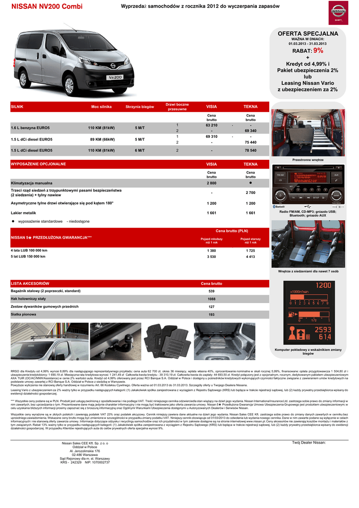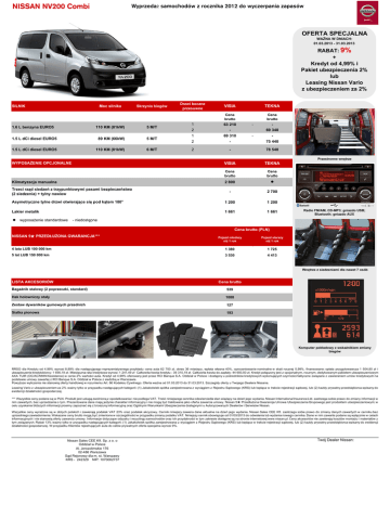 NISSAN NV200 Combi Wyprzedaż samochodów z rocznika 2012 do wyczerpania zapasów OFERTA SPECJALNA WAŻNA W DNIACH: 01.03.2013 - 31.03.2013 RABAT: 9% + Kredyt od 4,99% i Pakiet ubezpieczenia 2% lub Leasing Nissan Vario z ubezpieczeniem za 2% SILNIK Moc silnika 1.6 L benzyna EURO5 Skrzynia biegòw 110 KM (81kW) 5 M/T 1.5 L dCi diesel EURO5 89 KM (66kW) 5 M/T 1.5 L dCi diesel EURO5 110 KM (81kW) 6 M/T Drzwi boczne przesuwne VISIA TEKNA Cena brutto Cena brutto 1 63 210 2 - 1 69 310 2 - 75 440 2 - 78 540 VISIA TEKNA Cena brutto Cena brutto - 69 340 - - Przestronne wnętrze WYPOSAŻENIE OPCJONALNE Klimatyzacja manualna 2 800 Trzeci rząd siedzeń z trzypunktowymi pasami bezpieczeństwa (2 siedzenia) + tylny nawiew - 2 700 Asymetryczne tylne drzwi otwierające się pod kątem 180° 1 200 1 200 Lakier metalik 1 661 1 661 wyposażenie standardowe Radio FM/AM, CD-MP3; gniazdo USB; Bluetooth; gniazdo AUX - niedostępne Cena brutto (PLN) NISSAN 5★ PRZEDŁUŻONA GWARANCJA*** Pojazd młodszy niż 1 rok Pojazd starszy niż 1 rok 4 lata LUB 100 000 km 1 380 1 725 5 lat LUB 150 000 km 3 530 4 413 Wnętrze z siedzeniami dla nawet 7 osób LISTA AKCESORIÓW Cena brutto Bagażnik stalowy (2 poprzeczki, standard) 539 Hak holowniczy stały 1088 Zestaw dywaników gumowych przednich 127 Siatka pionowa 193 Komputer pokładowy z wskaźnikiem zmiany biegów RRSO dla Kredytu od 4,99% wynosi 8,89% dla następującego reprezentatywnego przykładu: cena auta 62 700 zł, okres 36 miesięcy, wpłata własna 40%, oprocentowanie nominalne w skali rocznej 5,99%, finansowane: opłata przygotowawcza 1 504,80 zł i ubezpieczenie kredytobiorcy: 1 690,19 zł. Miesięczna rata kredytowa wynosi: 1 241,49 zł Całkowita kwota kredytu : 39 310,19 zł. Całkowita kwota do zapłaty: 44 693,50 zł. Kredyt połączony jest z opcjonalnym, rocznym, dedykowanym pakietem ubezpieczeniowym AXA TUiR (OC/AC/NNW/Assistance) w cenie 2% wartości auta. Kredyt od 4,99% oferowany jest przez RCI Banque S.A. Oddział w Polsce i dostępny u pośredników kredytowych wykonujących czynności faktyczne związane z zawieraniem umów kredytowych na podstawie umowy zawartej z RCI Banque S.A. Oddział w Polsce z siedzibą w Warszawie. Powyższe wyliczenia nie stanowią oferty handlowej w rozumieniu Art. 66 Kodeksu Cywilnego. Oferta ważna od 01.03.2013 do 31.03.2013. Szczegóły oferty u Twojego Dealera Nissana. Leasing Vario z ubezpieczeniem za 2% ważny tylko w przypadku następujących kategorii: (1) Jakakolwiek spółka zarejestrowana z wyciągiem z Rejestru Sądowego (KRS) lub będąca w trakcie rejestracji sądowej, lub (2) każdy prywatny przedsiębiorca wpisany do ewidencji działalności gospodarczej. *** Wszystkie ceny podane są w PLN. Produkt jest usługą zwolnioną z opodatkowania i nie podlega VAT. Treść niniejszego cennika odzwierciedla stan wiążący na dzień jego wydania. Nissan InternationalInsurance Ltd. zastrzega sobie prawo do zmiany informacji w nim zawartych, bez uprzedzania o tym. Prezentowane dane mają jedynie charakter informacyjny i nie mogą być traktowane jako oferta zawarcia umowy. Nissan 5★ Przedłużona Gwarancja Umowa Ubezpieczenia Grupowego jest produktem ubezpieczeniowym; w celu uzyskania bliższych informacji prosimy zapoznać się z broszurą informacyjną oraz Ogólnymi Warunkami Ubezpieczenia dostępnymi u Autoryzowanych Dealerów i Serwisów Nissan. Wszystkie ceny wyrażone są w złotych polskich i zawierają podatek VAT 23% oraz podatek akcyzowy. Cennik niniejszy zawiera dane aktualne na dzień jego wydania. Nissan Sales CEE Kft. zastrzega sobie prawo do zmiany danych zawartych w cenniku bez uprzedniego zawiadomienia. Wskazane ceny brutto mogą być zmienione w szczególności w przypadku zmiany podatku VAT. Niniejszy cennik obowiązuje od 01/03/2013 do odwołania lub wydania nowego cennika. Dane w nim zawarte podane są wyłącznie w celach informacyjnych i nie stanowią oferty zawarcia umowy. Informacje dotyczące odzysku i recyclingu samochodów oraz ich przydatności w tym zakresie dostępne są na stronie internetowej www.nissan.pl. Ceny akcesoriów nie zawierają kosztów montażu i materiałów z tym związanych. Rabat 13% ważny tylko w przypadku następujących kategorii: (1) Jakakolwiek spółka zarejestrowana z wyciągiem z Rejestru Sądowego (KRS) lub będąca w trakcie rejestracji sądowej, lub (2) każdy prywatny przedsiębiorca wpisany do ewidencji działalności gospodarczej. W przypadku Klientów rejestrujących auta do celów prywatnych oferta specjalna wynosi 9%. Nissan Sales CEE Kft. Sp. z o. o Oddział w Polsce Al. Jerozolimskie 176 02-486 Warszawa Sąd Rejonowy dla m. st. Warszawy KRS - 242329 NIP: 1070002737 Twój Dealer Nissan: NISSAN NV200 Wyposażenie Bezpieczeństwo ABS + EBD Poduszka powietrzna kierowcy Poduszka powietrzna pasażera Trzypunktowe pasy bezpieczeństwa z napinaczami i ogranicznikami siły napięcia Sygnalizator braku zapięcia pasów bezpieczeństwa (kierowcy i pasażera) Trzypunktowe pasy bezpieczeństwa w drugim rzędzie siedzeń Przednie lampy przeciwmgłowe Tylne lampy przeciwmgłowe Wspomaganie kierownicy Regulacja pochylenia kolumny kierowniczej Immobilizer Układ wspomagania hamowania bazujący na czujnikach prędkości Pełnowymiarowe koło zapasowe Nadwozie 14" felgi stalowe Opony - 175/70 R14 C Lusterka boczne w kolorze czarnym Zewnętrzne klamki drzwi w kolorze czarnym Przednie reflektory halogenowe z manualną regulacją wysokości Zderzaki w kolorze czarnym Zderzaki w kolorze nadwozia (przód i tył) Pełnowymiarowe kołpaki Zaślepka na koło z logo Nissan Drzwi / Przestrzeń ładunkowa Przeszklone prawe drzwi przesuwne Przeszklone lewe drzwi przesuwne Tylna klapa z zieloną szybą + podgrzewanie tylnej szyby + tylna wycieraczka Asymetryczne tylne drzwi otwierające się pod kątem 180° z zieloną szybą + podgrzewanie tylnej szyby z kontrolką + tylna wycieraczka Wnętrze / Komfort i wyposażenie techniczne Klimatyzacja maualna Komputer pokładowy 