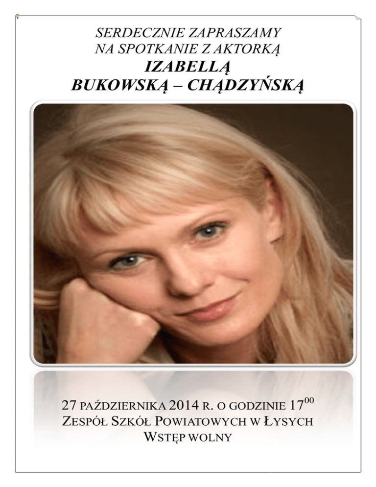 SERDECZNIE ZAPRASZAMY ZAPRASZAM NA SPOTKANIE Z AKTORKĄ AKTORKĄ IZABELLĄ BUKOWSKĄ – CHĄDZYŃSKĄ Ą ŃSKĄ 00 27 PAŹDZIER RNIKA 2014 R. O GODZINIE 17 ZESPÓŁ SZKÓŁ POWIATOWYCH W ŁYSYCH WSTĘP WOLNY