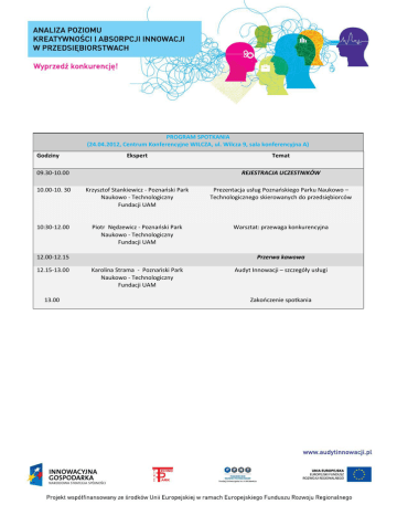 PROGRAM SPOTKANIA (24.04.2012, Centrum Konferencyjne WILCZA, ul. Wilcza 9, sala konferencyjna A) Godziny Ekspert 09.30-10.00 Temat REJESTRACJA UCZESTNIKÓW 10.00-10. 30 Krzysztof Stankiewicz - Poznański Park Naukowo - Technologiczny Fundacji UAM Prezentacja usług Poznańskiego Parku Naukowo – Technologicznego skierowanych do przedsiębiorców 10:30-12.00 Piotr Nędzewicz - Poznański Park Naukowo - Technologiczny Fundacji UAM Warsztat: przewaga konkurencyjna 12.00-12.15 12.15-13.00 13.00 Przerwa kawowa Karolina Strama - Poznański Park Naukowo - Technologiczny Fundacji UAM Audyt Innowacji – szczegóły usługi Zakończenie spotkania