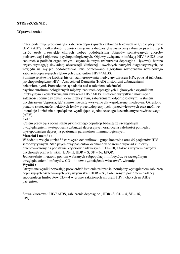 STRESZCZENIE : Wprowadzenie : Praca podejmuje problematykę zaburzeń depresyjnych i zaburzeń lękowych w grupie pacjentów HIV+/ AIDS. Podkreślono trudności związane z diagnostyką różnicową zaburzeń psychicznych wśród osób przewlekle chorych wobec podobieństwa objawów somatycznych choroby podstawowej i objawów psychopatologicznych. Objawy związane z infekcją HIV / AIDS oraz zaburzeń o podłożu organicznym i czynnościowym (zaburzenia depresyjne i lękowe), bardzo często wymagają dokładnej obserwacji klinicznej i swoistych narzędzi diagnostycznych, ze względu na mylące podobieństwo. Nie opracowano algorytmu rozpoznania różnicowego zaburzeń depresyjnych i lękowych u pacjentów HIV+/ AIDS. Pomimo relatywnie krótkiej historii zainteresowania medycyny wirusem HIV, powstał już obraz psychopatologiczny HIV – Assocciated Dementia (HAD) z istotnymi zaburzeniami behawioralnymi. Prowadzone są badania nad ustaleniem zależności psychoneuroimmunologicznych między zaburzeń depresyjnych i lękowych a czynnikiem infekcyjnym i konsekwencjami zakażenia HIV/ AIDS. Ustalenie wszystkich możliwych zależności pomiędzy czynnikiem infekcyjnym, zaburzeniami odpornościowymi, a stanem psychicznym (depresja, lęk) stanowi swoiste wyzwanie dla współczesnej medycyny. Określono ponadto skuteczność niektórych leków przeciwdepresyjnych i przeciwlękowych oraz możliwe interakcje i działania niepożądane, wynikające z jednoczesnego leczenia antyretrowirusowego (ARV). Cel : Celem pracy była ocena stanu psychicznego populacji badanej ze szczególnym uwzględnieniem występowania zaburzeń depresyjnych oraz ocena zależności pomiędzy występowaniem depresji a poziomem parametrów immunologicznych. Materiał i metoda : W badaniu wzięło udział 32 zdrowych ochotników – grupa kontrolna oraz 85 pacjentów HIV seropozytywnych. Stan psychiczny pacjentów oceniano w oparciu o wywiad kliniczny przeprowadzony na podstawie kryteriów badawczych ICD – 10, a także z użyciem narzędzi psychometrycznych : skal; BDI- II, HDR – S, SF – 36, EPQR. Jednocześnie mierzono poziom wybranych subpopulacji limfocytów, ze szczególnym uwzględnieniem limfocytów CD – 4 i tzw. : „obciążenia wirusowe”, wiremię. Wyniki : Otrzymane wyniki pozwalają potwierdzić istnienie zależności pomiędzy wystąpieniem zaburzeń depresyjnych oszacowanych przy użyciu skali HDR – S , a obniżonym poziomem badanej subpopulacji limfocytów CD – 4 w grupie zakażonych wirusem HIV i chorych na AIDS pacjentów. Słowa kluczowe : HIV/ AIDS, zaburzenia depresyjne , HDR -S, CD – 4, SF – 36, EPQR.