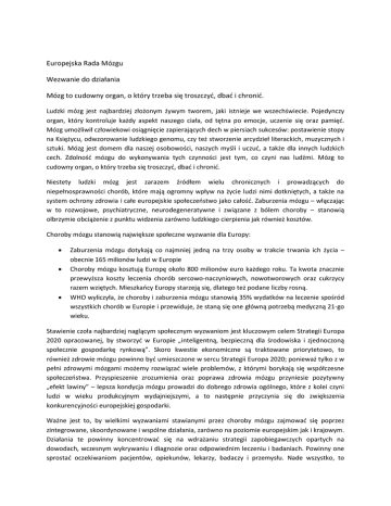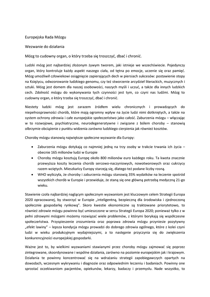 Europejska Rada Mózgu Wezwanie do działania Mózg to cudowny organ, o który trzeba się troszczyć, dbać i chronić. Ludzki mózg jest najbardziej złożonym żywym tworem, jaki istnieje we wszechświecie. Pojedynczy organ, który kontroluje każdy aspekt naszego ciała, od tętna po emocje, uczenie się oraz pamięć. Mózg umożliwił człowiekowi osiągnięcie zapierających dech w piersiach sukcesów: postawienie stopy na Księżycu, odwzorowanie ludzkiego genomu, czy też stworzenie arcydzieł literackich, muzycznych i sztuki. Mózg jest domem dla naszej osobowości, naszych myśli i uczuć, a także dla innych ludzkich cech. Zdolność mózgu do wykonywania tych czynności jest tym, co czyni nas ludźmi. Mózg to cudowny organ, o który trzeba się troszczyć, dbać i chronić. Niestety ludzki mózg jest zarazem źródłem wielu chronicznych i prowadzących do niepełnosprawności chorób, które mają ogromny wpływ na życie ludzi nimi dotkniętych, a także na system ochrony zdrowia i całe europejskie społeczeństwo jako całość. Zaburzenia mózgu – włączając w to rozwojowe, psychiatryczne, neurodegeneratywne i związane z bólem choroby – stanowią olbrzymie obciążenie z punktu widzenia zarówno ludzkiego cierpienia jak również kosztów. Choroby mózgu stanowią największe społeczne wyzwanie dla Europy: Zaburzenia mózgu dotykają co najmniej jedną na trzy osoby w trakcie trwania ich życia – obecnie 165 milionów ludzi w Europie Choroby mózgu kosztują Europę około 800 milionów euro każdego roku. Ta kwota znacznie przewyższa koszty leczenia chorób sercowo-naczyniowych, nowotworowych oraz cukrzycy razem wziętych. Mieszkańcy Europy starzeją się, dlatego też podane liczby rosną. WHO wyliczyła, że choroby i zaburzenia mózgu stanowią 35% wydatków na leczenie spośród wszystkich chorób w Europie i przewiduje, że staną się one główną potrzebą medyczną 21-go wieku. Stawienie czoła najbardziej naglącym społecznym wyzwaniom jest kluczowym celem Strategii Europa 2020 opracowanej, by stworzyć w Europie „inteligentną, bezpieczną dla środowiska i zjednoczoną społecznie gospodarkę rynkową”. Skoro kwestie ekonomiczne są traktowane priorytetowo, to również zdrowie mózgu powinno być umieszczone w sercu Strategii Europa 2020; ponieważ tylko z w pełni zdrowymi mózgami możemy rozwiązać wiele problemów, z którymi borykają się współczesne społeczeństwa. Przyspieszenie zrozumienia oraz poprawa zdrowia mózgu przyniesie pozytywny „efekt lawiny” – lepsza kondycja mózgu prowadzi do dobrego zdrowia ogólnego, które z kolei czyni ludzi w wieku produkcyjnym wydajniejszymi, a to następnie przyczynia się do zwiększenia konkurencyjności europejskiej gospodarki. Ważne jest to, by wielkimi wyzwaniami stawianymi przez choroby mózgu zajmować się poprzez zintegrowane, skoordynowane i wspólne działania, zarówno na poziomie europejskim jak i krajowym. Działania te powinny koncentrować się na wdrażaniu strategii zapobiegawczych opartych na dowodach, wczesnym wykrywaniu i diagnozie oraz odpowiednim leczeniu i badaniach. Powinny one sprostać oczekiwaniom pacjentów, opiekunów, lekarzy, badaczy i przemysłu. Nade wszystko, to pacjenci muszą znaleźć się w centrum całego procesu, żeby zapewnić konkretnemu pacjentowi skuteczne leczenie we właściwym czasie. W tym celu, podczas konferencji zamykającej Europejski Miesiąc Mózgu w maju 2013 roku, zorganizowanej wspólnie przez Komisję Europejską oraz Przewodniczącą UE Irlandię, wystosowano wezwanie dla państw członkowskich UE i krajów stowarzyszonych do „ rozwinięcia, lub udoskonalenia narodowych strategii badań mózgu i opieki zdrowotnej w nadrzędnym kontekście europejskim”, zwracając uwagę, że „przykłady udanych narodowych strategii w pozostałych obszarach badań, takich jak nowotwór, już w Europie istnieją.” Chociaż dokonano wielkiego postępu, obecnie bardziej niż kiedykolwiek jest potrzebne lepsze zrozumienie mózgu. Osiągnąć to można dzięki zaangażowaniu i współpracy między wszystkimi zainteresowanymi i państwami członkowskimi w zakresie przełożenia wyników badań na poprawę ludzkiego zdrowia, opieki nad pacjentami oraz korzyści dla społeczeństwa jako całości. Traktat o funkcjonowaniu Unii Europejskiej przewiduje, iż należy zapewnić wysoki poziom ochrony zdrowia człowieka przy określaniu oraz wprowadzaniu w życie wszystkich polityk i działań UE. Respektując tę zasadę, a także w świetle powyższych słów wzywamy wszystkie europejskie instytucje do wyrażenia wsparcia dla zdrowia mózgu we wszystkich europejskich oraz krajowych działaniach: Wzywamy Komisję Europejską do przedstawienia strategii zwalczania chorób mózgu we wspólny, zintegrowany i całościowy sposób, jak i do dalszego wspierania państw członkowskich UE i krajów stowarzyszonych w ich staraniach mających na celu eliminację efektów zaburzeń mózgu. Wzywamy państwa członkowskie UE i kraje stowarzyszone do wprowadzenia ogólnych programów zdrowia, chroniących zdrowie mózgu w sposób systematyczny, stosujących najlepsze dostępne metody, po to by stymulować częstsze i lepiej skoordynowane badania dotyczące mózgu, a także rozwijać strategie zapobiegania, wczesnego wykrywania, diagnozowania oraz odpowiedniego leczenia. Przypisy: 1 koszty powodowane zaburzeniami mózgu w Europie, 2 tamże 3 koszty związane z innymi typami chorób – patrz: