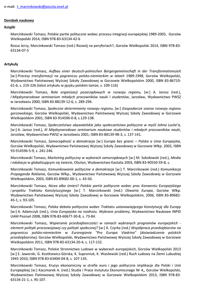 e-mail: [email protected] Dorobek naukowy Książki Marcinkowski Tomasz, Polskie partie polityczne wobec procesu integracji europejskiej 1989-2005, Gorzów Wielkopolski 2014, ISBN 978-83-63134-42-6 Rossa Jerzy, Marcinkowski Tomasz (red.) Rozwój na peryferiach?, Gorzów Wielkopolski 2014, ISBN 978-8363134-07-5 Artykuły Marcinkowski Tomasz, Aufbau einer deutsch-polnischen Bürgergemeinschaft in der Transformationszeit [w:] Procesy transformacji na pograniczu polsko-niemieckim w latach 1989-1998, Gorzów Wielkopolski, Wydawnictwo Państwowej Wyższej Szkoły Zawodowej w Gorzowie Wielkopolskim 2000, ISBN 83-8671061-6, s. 219-226 (tekst artykułu w języku polskim tamże, s. 109-116) Marcinkowski Tomasz, Rola organizacji pozarządowych w rozwoju regionu, [w:] A. Jarosz (red.), I Międzynarodowe seminarium młodych pracowników nauki i studentów, Jarosław, Wydawnictwo PWSZ w Jarosławiu 2000, ISBN 83-88139-12-6, s. 289-294. Marcinkowski Tomasz, Społeczne determinanty rozwoju regionu, [w:] Gospodarcze szanse rozwoju regionu gorzowskiego, Gorzów Wielkopolski, Wydawnictwo Państwowej Wyższej Szkoły Zawodowej w Gorzowie Wielkopolskim 2001, ISBN 83-914596-0-8, s.129-138. Marcinkowski Tomasz, Społeczeństwo obywatelskie jako społeczeństwo polityczne w myśli Johna Locke’a, [w:] A. Jarosz (red.), III Międzynarodowe seminarium naukowe studentów i młodych pracowników nauki, Jarosław, Wydawnictwo PWSZ w Jarosławiu 2001, ISBN 83-88139-98-3, s. 137-141. Marcinkowski Tomasz, Samorządność a demokracja [w:] Europa bez granic – Polska a Unia Europejska, Gorzów Wielkopolski, Wydawnictwo Państwowej Wyższej Szkoły Zawodowej w Gorzowie Wlkp. 2002, ISBN 93-914596-5-9, s. 241-246. Marcinkowski Tomasz, Marketing polityczny w wyborach samorządowych [w:] M. Sokołowski (red.), Media i edukacja w globalizującym się świecie, Olsztyn, Wydawnictwo Kastalia 2003, ISBN 83-90550-59-8, s. Marcinkowski Tomasz, Komunikowanie polityczne a demokracja [w:] T. Marcinkowski (red.) Komunikacja Propaganda Reklama, Gorzów Wlkp., Wydawnictwo Państwowej Wyższej Szkoły Zawodowej w Gorzowie Wielkopolskim, 2003, ISBN 83-89682-00-1, s. 43-50. Marcinkowski Tomasz, Nicea albo śmierć! Polskie partie polityczne wobec prac Konwentu Europejskiego i projektu Traktatu Konstytucyjnego [w:] T. Marcinkowski (red.) Otwarta Europa, Gorzów Wlkp. Wydawnictwo Państwowej Wyższej Szkoły Zawodowej w Gorzowie Wielkopolskim, 2006, ISBN 83-8968245-1, s. 93-105. Marcinkowski Tomasz, Polska debata polityczna wobec Traktatu ustanawiającego Konstytucję dla Europy [w:] A. Adamczyk (red.), Unia Europejska na rozdrożu. Wybrane problemy, Wydawnictwo Naukowe INPiD UAM Poznań 2008, ISBN 978-83-60677-30-8, s. 73-84. Marcinkowski Tomasz, Wspieranie przedsiębiorczości w ramach wybranych programów europejskich element polityki prorozwojowej czy polityki społecznej? [w:] K. Czyrka (red.) Współpraca przedsiębiorstw na pograniczu polsko-niemieckim w Euroregionie "Pro Europa Viadrina" (doświadczenia polskich przedsiębiorstw), Gorzów Wielkopolski, Wydawnictwo Państwowej Wyższej Szkoły Zawodowej w Gorzowie Wielkopolskim 2011, ISBN 978-83-63134-20-4, s. 117-132. Marcinkowski Tomasz, Polskie Stronnictwo Ludowe w wyborach europejskich, Gorzów Wielkopolski 2013 [w:] E. Jaworski, G. Kostkiewicz-Górska, K. Suproniuk, K. Wasilewski (red.) Ruch Ludowy na Ziemi Lubuskiej 1945-2010, ISBN 978-83-63404-04-8, s. 107-135. Marcinkowski Tomasz, Kryzys ekonomiczny w strefie euro i jego polityczne implikacje dla Polski i Unii Europejskiej [w:] Kaczmarek A. (red.) Studia i Prace Instytutu Ekonomicznego Nr 4,, Gorzów Wielkopolski, Wydawnictwo Państwowej Wyższej Szkoły Zawodowej w Gorzowie Wielkopolskim 2013, ISBN 978-8363134-21-1, s. 95-107. Marcinkowski Tomasz, Pakt Fiskalny jako recepta na kryzys w UE i jego recepcja w Polsce [w:]P. Pavlov, K. Czyrka (red.) Ekonomiczno-zarządcze problemy w gospodarce tom II, Studia i Prace Wydziału Ekonomicznego, Gorzów Wielkopolski 2013, s. 117-133 Marcinkowski Tomasz, Wybory 4 czerwca 1989 roku na łamach tygodnika "Ziemia Gorzowska" [w:] A. Rymar, M. Rusakiewicz (red.) Ale nam się wydarzyło, Wybory 4 czerwca 1989 roku na Ziemi Lubuskiej we wspomnieniach parlamentarzystów i opracowaniach, Gorzów Wielkopolski 2014, s. 89-103, ISBN 978-83936775-3-5 Marcinkowski Tomasz, [w:] Lesiewicz E. (red.) Zmieniająca się Unia Europejska. Wybrane aspekty polityczne i społeczno-gospodarcze, Poznań 2015, ISBN 978-83-62907-60-1 Recenzje i sprawozdania Czyrka K. (red.), Przedsiębiorczość na pograniczu - wybrane problemy Tom I, Gorzów Wielkopolski 2012. Kaczmarek A. (red.), Przedsiębiorczość na pograniczu - wybrane problemy Tom II, Gorzów Wielkopolski 2012. Byczkowska M. (red.), Przedsiębiorczość na pograniczu - wybrane problemy Tom III, Gorzów Wielkopolski 2012. Bondyra K., Świdurska A. (red.), Cyfrowa szkoła zawodowa, Kraków 2013. Inna działalność naukowa Wstępy do publikacji zbiorowych: Marcinkowski Tomasz, Wprowadzenie [w:] T. Marcinkowski (red.) Otwarta Europa, Gorzów Wielkopolski 2006, Wydawnictwo Państwowej Wyższej Szkoły Zawodowej w Gorzowie Wielkopolskim, ISBN 83-8968245-1, s. 7-8 Marcinkowski Tomasz, Wstęp, [w:] T. Marcinkowski (red.), Kapitał społeczny a rozwój regionu, Gorzów Wielkopolski 2008, Fundacja na Rzecz Gorzowskiej Szkoły Wyższej, ISBN-978-83-926546-8-1, s. 6-9. Marcinkowski Tomasz, Wstęp, [w:] T. Marcinkowski (red.), Innowacje w sektorze turystycznym północnej części województwa lubuskiego, Gorzów Wielkopolski 2008, Fundacja na Rzecz Gorzowskiej Szkoły Wyższej, ISBN 978-83-926546-0-5, s. 7-9. Marcinkowski Tomasz, MŚP a rozwój regionu (wspólnie z A. Kaczmarek) [w:] Kaczmarek A., Marcinkowski T. (red.) Bariery rozwoju firm sektora MŚP w regionie lubuskim, Gorzów Wielkopolski 2008, Fundacja na Rzecz Gorzowskiej Szkoły Wyższej, ISBN 978-83-926546-4-3, s.7-16. Marcinkowski T., Wstęp [w:] Marcinkowski T. red., Wykorzystanie narzędzi marketingowych