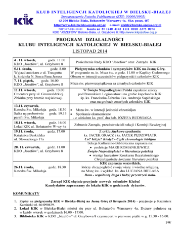 KLUB INTELIGENCJI KATOLICKIEJ W BIELSKU-BIAŁEJ Stowarzyszenie Pożytku Publicznego (KRS: 0000010905) 43-300 Bielsko-Biała, Bohaterów Warszawy 4a. Skr. poczt. 457 http://www.kik.bielsko.opoka.org.pl e-mail: [email protected] NIP 547-184-50-01 Konto nr 87 1240 4142 1111 0010 3375 0074 KDO "JÓZEFÓW" Bielsko-Biała, ul. Grzybowa 8; http://www.kikjozefow.org.pl PROGRAM DZIAŁALNOŚCI KLUBU INTELIGENCJI KATOLICKIEJ W BIELSKU-BIAŁEJ LISTOPAD 2014 4 . 11. wtorek, godz. 11.00 KDO „Józefów”, ul. Grzybowa 8 5.11. środa, godz. 8.00 Wyjazd autokaru z ul. Traugutta k. kościoła N. Serca Pana Jezusa 7. 11. piątek, godz. 16.00 KDO „Józefów”, ul. Grzybowa 8 Posiedzenie Rady KDO "Józefów" oraz Zarządu KIK Pielgrzymka członków i sympatyków KIK na Jasną Górę. W programie m. in. Msza św. o godz. 11.00 w Kaplicy Cudownego Obrazu w intencji uczestników pielgrzymki i członków KIK Msza św. pierwszopiątkowa za zmarłych członków KIK 11.11. wtorek, godz. 13.00 Cmentarz przy ul. Grunwaldzkiej. Zbiórka przy bramie wejściowej. 13.11. czwartek, Katedra Św. Mikołaja godz. 18.30 Salka na probostwie godz. 19.15 parafii Św. Mikołaja 18.11. wtorek, godz. 16.00 Lokal KIK ul. Bohaterów W-wy 4a 19.11. środa, godz. 17.00 Książnica Beskidzka ul. Słowackiego 17a 20. 11. czwartek, godz. 11.00 KDO „Józefów”, ul. Grzybowa 8 26.11. środa, godz. 18.30 Katedra Św. Mikołaja W Święto Niepodległości Polski zapalenie zniczy pod Pomnikiem Legionistów i na grobie kapelanów KIK: śp. ks. Franciszka Żebroka i ks. Andrzeja Sapińskiego oraz na grobach zmarłych członków KIK • • Msza św. w intencji jedności chrześcijan Spotkanie ekumeniczne - z udziałem ks. prof. dra hab. JÓZEFA BUDNIAKA Zebranie Zarządu, przedstawicieli sekcji i Komisji Rewizyjnej Z cyklu Jackowe spotkania: ks. JACEK GRACZ i ks. JACEK PĘDZIWIATR Co? Gdzie? Kiedy? - Czyli chronologia biblijna Sekcja Kulturalno-Biblioteczna zaprasza na: • prelekcję MARII ROMANKIEWICZ Święto Niepodległości w literaturze polskiej • występ laureatów Konkursu Recytatorskiego Chrześcijańskie korzenie literatury polskiej KIK zaprasza wszystkich, którzy chcą pogłębić swoją wiarę i wiedzę religijną, na Mszę św. i wykład ks. dra LUCJANA BIELASA Dom - wspólnotą Boga i ludzi; przestrzeń stołu. Zarząd KIK chętnie przyjmie nowych członków Klubu! Kandydatów zapraszamy do lokalu KIK w godzinach dyżurów. KOMUNIKATY 1. Zapisy na pielgrzymkę KIK w Bielsku-Białej na Jasną Górę (5 listopada 2014) - przyjmuje p. Kazimierz Kamiński tel. 664090639. 2. Lokal KIK w Bielsku-Białej mieści się przy ul. Bohaterów Warszawy 4a. Dyżury pełnione są w każdy wtorek w godzinach 16.00 - 17.00. 3. Biblioteka KIK w KDO „Józefów” ul. Grzybowa 8 czynna jest w pierwsze piątki w g. 15.30 - 16.00. PW