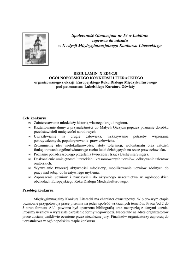 Społeczność Gimnazjum nr 19 w Lublinie zaprasza do udziału w X edycji Międzygimnazjalnego Konkursu Literackiego REGULAMIN X EDYCJI OGÓLNOPOLSKIEGO KONKURSU LITERACKIEGO organizowanego z okazji Europejskiego Roku Dialogu Międzykulturowego pod patronatem: Lubelskiego Kuratora Oświaty Cele konkursu: • Zainteresowanie młodzieŜy historią własnego kraju i regionu. • Kształtowanie dumy z przynaleŜności do Małych Ojczyzn poprzez poznanie dorobku przedstawicieli mniejszości narodowych. • UwraŜliwianie na drugie człowieka, wskazywanie potrzeby wspierania pokrzywdzonych, popularyzowanie praw człowieka. • Zrozumienie idei wielokulturowości, istoty tolerancji, wolontariatu oraz załoŜeń funkcjonowania ogólnoświatowego ruchu ludzi działających na rzecz praw człowieka. • Poznanie ponadczasowego przesłania twórczości Isaaca Bashevisa Singera. • Doskonalenie umiejętności literackich i krasomówczych uczniów, odkrywanie talentów oratorskich. • Wyzwalanie twórczej aktywności młodzieŜy, mobilizowanie uczniów zdolnych do pracy nad sobą, do kreatywnego myślenia. • Zaproszenie uczniów i nauczycieli do aktywnego uczestnictwa w ogólnopolskich obchodach Europejskiego Roku Dialogu Międzykulturowego. Przebieg konkursu: Międzygimnazjalny Konkurs Literacki ma charakter dwuetapowy. W pierwszym etapie uczniowie przygotowują pracę pisemną na jeden spośród wskazanych tematów. Praca /od 2 do 5 stron formatu A4/ powinna być opatrzona bibliografią oraz metryczką z danymi ucznia. Prosimy uczniów o wyraziste określenie formy wypowiedzi. Nadesłane na adres organizatorów prace zostaną wnikliwie ocenione przez niezaleŜne jury. Finalistów organizatorzy zaproszą do uczestnictwa w ogólnopolskim etapie konkursu. I. Etap szkolny Zakres tematyczny: 1. Magiczny świat stworzony przez pisarzy Małych Ojczyzn; Isaaca Bashevisa Singera, Erwina Strittmattera, Nadzieję Artymowicz, Edwarda Dębickiego, Papuszy… . /list, wywiad, …/ 2. Ryszard Kapuściński, Waldemar Milewicz jako obrońcy praw człowieka. /artykuł, rozprawka, …/ 3. Niezwykłe sylwetki bohaterów ksiąŜek Isaaca Bashevisa Singera. /charakterystyka, rozprawka, reportaŜ, …/ 4. Świat mniejszości narodowych utrwalony w tekstach regionalnych twórców. /esej, felieton, opowiadanie,…/ II. Finał polega na wygłoszeniu oracji /do 4 minut/ na jeden z proponowanych tematów: A. Isaac Bashevis Singer – światowej sławy noblista, mistrz kresowych klimatów i uniwersalnych prawd. B. Nauczyciele tolerancji, obrońcy pokrzywdzonych, dokumentaliści codziennych zdarzeń czy Ŝądni sławy dziennikarze: Ryszard Kapuściński, Waldemar Milewicz ... C. Czar Huculszczyzny, sekrety omszałych budowli, uroki cygańskich ballad...- na czym polega bogactwo wielokulturowości? D. Dlaczego we współczesnym świecie potrzebne są stowarzyszenia, organizacje broniące praw człowieka? Prace naleŜy przesłać do organizatorów do 15 listopada 2008 roku. Uroczyste zakończenie X edycji Międzygimnazjalnego Konkursu Literackiego odbędzie się w grudniu 2008 roku w Gimnazjum nr 19. Organizatorzy nie pokrywają kosztów przejazdu finalistom spoza Lublina. Warunki uczestnictwa w konkursie: • Do 15 listopada 2008 r. naleŜy nadesłać nagrodzone na etapie szkolnym prace /w formie wydruku i na nośniku elektronicznym/ na adres: Gimnazjum nr 19, 20- 124 Lublin, ul Szkolna 6 z dopiskiem „Międzygimnazjalny Konkurs Literacki". • W zgłoszeniu naleŜy podać imię i nazwisko uczestnika, nazwę i adres szkoły oraz tel. kontaktowy, pocztę elektroniczną, imię i nazwisko nauczyciela (opiekuna). • Prosimy o pisemną zgodę na przetwarzanie danych osobowych ucznia i nauczyciela opiekuna. Na laureatów i ich nauczycieli czekają atrakcyjne nagrody oraz dyplomy. ZAPRASZAMY!