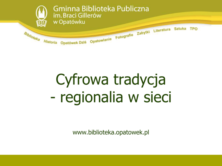 Cyfrowa tradycja - regionalia w sieci www.biblioteka.opatowek.pl www.biblioteka.opatowek.pl Jak to się zaczęło • Współpraca z Towarzystwem Przyjaciół Opatówka, wydawanie czasopisma „Opatowianin”. Po utworzeniu strony www w 2001 r. znaczną jej część poświęcono sprawom regionalnym – Opatówek i opatowianie • Inna działalność regionalna – publikowanie pokłosia konkursów i innych akcji, fotografie, literatura, sztuka • Obecnie trzecia wersja naszej strony; od początku było tu miejsce na treści regionalne • W bibliotece - 100% regionalistów z zamiłowania (w tym 50% z dyplomem historyka) Dlaczego • Ułatwienie dostępu do treści regionalnych – od legend lokalnych (Baśnie i legendy kaliskie Eligiusza KOR-Walczaka) omawianych przez uczniów w szkole, poprzez wspomnienia, po wyniki badań naukowych publikowanych w czasopismach regionalnych • Pobudzanie badań regionalnych poprzez publikacje wspomnień, rodzinnych zbiorów dokumentów • Budowanie lokalnej tożsamości • Promowanie zbiorów i biblioteki w Opatówku Autorzy • • • • • • Zespół biblioteki Redaktorzy czasopisma „Opatowianin” Studenci Naukowcy Publicyści Historycy amatorzy związani z Opatówkiem Plany • Współpraca z Fundacją KARTA – Cyfrowe Archiwa Tradycji Lokalnej • Szkolenia specjalistyczne PRB – informacja lokalna jak ją zbierać i upowszechniać • Poszerzanie grona autorów • Przebudowa układu treści na stronie • Kontynuowanie pozyskiwania różnorodnych materiałów i zamieszczanie ich na stronie • Strona biblioteki – portalem wiedzy o gminie Efekty • Strona www biblioteki w Opatówku, którą odwiedzają zainteresowani, także spoza granic naszego kraju, stąd liczne kontakty z ciekawymi ludźmi • Opracowanie hasła „Opatówek” w Wikipedii w języku angielskim i niemieckim we współpracy z Niemcem, którego przodkowie mieszkali w Opatówku i pracowali w fabryce sukna. Za jego pośrednictwem próba nawiązania kontaktów partnerskich między gminą Opatówek a gminą Wachtberg k. Kolonii Efekty • Nazwy topograficzne gminy Opatówek • Rejestracja najciekawszych nagrobków na cmentarzu w Opatówku. w Rajsku i Tłokini Kościelnej • Drzewo genealogiczne rodziny Zajączków i Radoszewskich • Galerie dawnych fotografii z rodzinnych archiwów Odbiorcy i sympatycy • • • • • • Regionaliści, hobbyści Uczniowie, studenci Nauczyciele Badacze (jesteśmy cytowani w pracach naukowych) Mieszkańcy naszej gminy i okolic Internauci, którzy „łapią bakcyla” Najciekawsze kontakty – osoby prywatne związane z Opatówkiem • • • Rodziny, potomkowie, znajomi wybitnych opatowian, np.: potomkowie rodziny Skotnickich, znajomi Łucji Pinczewskiej-Gliksman z Izraela, krewni ks. Jerzego Bekiera i ks. Józefa Szafnickiego, członkowie rodziny Gillerów, Eligiusza Kor-Walczaka, prawnuk powstańca styczniowego pochowanego na cmentarzu w Opatówku, krewni Bronisława Korejwo zasłużonego dla straży pożarnej i czytelnictwa w Opatówku, rodzina historyka Opatówka Józefa Pilińskiego, potomkowie założyciela i kierownika Preparandy Nauczycielskiej Józefa Perzyny, krewni malarki Wacławy Essersowej oraz zasłużonego lekarza Eugeniusza Dejtera, ostatnich właścicieli majątku w Opatówku, nauczyciela Alfonsa Jaskułowskiego i innych Osoby poszukujące rodzinnych korzeni, genealodzy, np. rodziny z Niemiec, USA, Kanady, autor drzewa genealogicznego rodziny Zajączków i Radoszewskich współzałożyciel Wielkopolskiego Towarzystwa Genealogicznego „Gniazdo” i wielu innych. Dziwne kontakty i zapytania, np.: „potomkowie” Zajączka” czy Pokrzywiński z Anglii, potomkowie jednego z opatowskich Niemców, który źle się zasłużył Osoby prywatne nie związane z Opatówkiem • • • • Pasjonat historii z Florydy w USA przez wiele lat przysyłał cenne materiały historyczne, wykorzystane m. in. w publikacji Z dziejów parafii w Opatówku, założył stronę www.rapperswil-castle.com z apelem poparcia dla utrzymania Muzeum Polskiego w Rapperswilu. Apel podpisało ponad 17 tys. osób z całego świata Autorzy publikacji i prac magisterskich o Tryptyku z Opatówka, o Agatonie Gillerze, Łucji Pinczewskiej-Gliksman, namiestniku Józefie Zajączku i innych Autorzy różnych stron i portali internetowych: autor strony o Stanisławowie, na której zamieściliśmy listy Agatona Gillera ze Stanisławowa; współtwórca portalu Gdziebylec z Warszawy – poszukiwania śladów Witkacego w okolicach Opatówka Potomek rodziny właścicielki czasopisma „Czytelnia Niedzielna”, którego redaktorem był Agaton Giller. Otrzymaliśmy unikalne kopie „Czytelni Niedzielnej” Instytucje • • • • • Muzeum Polskie w Rapperswilu w Szwajcarii, którego jednym z inicjatorów i oddanym pracownikiem był Agaton Giller, plany imprez i sprawozdania z działalności Muzeum Muzeum KL Auschwitz – autor artykułu o udanej ucieczce opatowianina z obozu i represjach niemieckich Muzeum Tradycji Niepodległościowych w Łodzi – dzieje ucieczki opatowianina z więzienia w Radogoszczy Muzeum im. Jacka Malczewskiego w Radomiu – dzieje rodziny Schlosserów i Ludwika Tęsiorowskiego „Rzeczpospolita” – publikacja wizerunku Agatona Gillera Dziękuję za uwagę Jadwiga Miluśka-Stasiak www.biblioteka.opatowek.pl