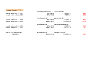 Fundusz Mieszany PPE wartość netto na 31.12.2002 wartość netto na 31.12.2003 ZmianyAktywNettoFund Liczba i WartJR 482,522.59 482,520.71 876,070.51 876,068.56 AktywNettoFund wartość netto na 31.12.2003 wartość netto na 31.12.2004 876,070.51 1,640,118.07 wartość lokat w funduszach 31.12.2004 Liczba i WartJR 876,068.56 1,640,100.36 1.95 17.71 ZmianyAktywNettoFund 876,070.51 1,640,118.07 0.00 0.00 AktywNettoFund ZestawLokatFund 1,653,391.66 1,653,391.66 0.00 AktywNettoFund wartość netto na 31.12.2003 wartość netto na 31.12.2004 1.88 1.95 876,070.51 1,640,118.07 Roczne sprawozdanie ubezpieczeniowego funduszu kapitałowego sporządzone na dzień 31.12.2004 Generali Życie Towarzystwo Ubezpieczeń S.A. Fundusz Mieszany PPE I. AKTYWA NETTO FUNDUSZU ( w zł ) Okres poprzedni Okres bieżący I. Aktywa 889,292.58 1,662,723.44 1. Lokaty 889,292.58 1,653,391.66 2. Środki pieniężne 0.00 3,654.62 3. Należności, w tym 0.00 5,677.16 3.1. Z tytułu zbycia składników portfela inwestycyjnego 0.00 5,677.16 3.2. Pozostałe należności 0.00 0.00 4. Pozostałe aktywa 0.00 0.00 II. Zobowiązania 13,222.07 22,605.37 1. Z tytułu nabytych składników portfela inwestycyjnego 8,033.50 13,066.50 2. Zobowiązania wobec ubezpieczających lub uprawnionych z umów ubezpieczenia 0.00 0.00 3. Pozostałe zobowiązania 5,188.57 9,538.87 III. Aktywa netto ( I - II ) 876,070.51 1,640,118.07 Roczne sprawozdanie ubezpieczeniowego funduszu kapitałowego sporządzone na dzień 31.12.2004 Generali Życie Towarzystwo Ubezpieczeń S.A. Fundusz Mieszany PPE II. ZMIANY AKTYWÓW NETTO FUNDUSZU ( w zł ) Okres poprzedni Okres bieżący A. Aktywa netto funduszu na początek okresu sprawozdawczego 482,522.59 876,070.51 B. Stan netto z działalności operacyjnej ( I -II ) 273,527.13 571,379.32 I. Zwiększenia funduszu 290,616.13 616,093.83 1. Tytułem składek zwiększających wartość funduszu 290,616.13 616,093.83 2. Tytułem udzielonych gwarancji 0.00 0.00 3. Pozostałe zwiększenia 0.00 0.00 II. Zmniejszenia funduszu 17,089.00 44,714.51 1. Tytułem wykupu 0.00 3,976.95 2. Tytułem wypłat pozostałych świadczeń ubezpieczeniowych 0.00 0.00 3. Tytułem opłaty za ryzyko ubezpieczeniowe oraz innych opłat potrącanych z funduszu 0.00 0.00 4. Tytułem zwrotu składek ubezpieczeniowych 0.00 0.00 5. Tytułem prowizji od składek 0.00 0.00 6. Tytułem pozostałych prowizji 0.00 0.00 7. Tytułem opłat za zarządzanie funduszem oraz innych opłat tytułem administrowania funduszem 17,089.00 40,737.56 8. Tytułem udzielonych gwarancji 0.00 0.00 9. Pozostałe zmniejszenia 0.00 0.00 C. Przychody netto z działalności inwestycyjnej ( po potrąceniu kosztów ) 108,602.12 167,753.76 1. z papierów emitowanych, poręczonych lub gwarantowanych przez Skarb Państwa lub organizacje międzynarodowe, których członkiem jest Rzeczpospolita Polska 13,457.54 50,311.82 2. z obligacji emitowanych lub poręczonych przez jednostki samorządu terytorialnego lub związki jednostek samorządu terytorialnego 0.00 0.00 3. z listów zastawnych 0.00 0.00 4. z innych dłużnych papierów wartościowych o stałej stopie dochodu 4,283.27 3,638.79 5. z innych dłużnych papierów wartościowych o zmiennej stopie dochodu 0.00 0.00 6. z akcji 89,601.14 109,732.79 7. z udziałów 0.00 0.00 8. z jednostek uczestnictwa lub certyfikatów inwestycyjnych w funduszach inwestycyjnych 0.00 0.00 9. z innych pochodnych, o ile służą zmniejszeniu ryzyka związanego z innymi aktywami stanowiącymi pokrycie rezerw techniczno-ubezpieczeniowych 0.00 0.00 10. z innych papierów wartościowych o zmiennej stopie dochodu 0.00 0.00 11. z pożyczek 0.00 0.00 12. z nieruchomości 0.00 0.00 13. z depozytów bankowych 1,260.17 4,070.36 14. z lokat dokonanych za zezwoleniem organu nadzoru, zgodnie z art.. 154 ust. 9 ustawy o działalności ubezpieczeniowej 0.00 0.00 D. Pozostałe zwiększenia 11,418.67 24,953.20 E. Pozostałe zmniejszenia 0.00 38.72 F. Aktywa netto funduszu na koniec okresu sprawozdawczego 876,070.51 1,640,118.07 Roczne sprawozdanie ubezpieczeniowego funduszu kapitałowego sporządzone na dzień 31.12.2004 Generali Życie Towarzystwo Ubezpieczeń S.A. Fundusz Mieszany PPE III. KOSZTY FUNDUSZU ( w zł ) 1. Koszty prowadzenia i obsługi rachunków bankowych 2. Okres poprzedni Okres bieżący 250.00 12.25 Koszty nabycia jednostek rozrachunkowych 0.00 0.00 3. Koszty przechowywania aktywów funduszu 192.74 2,105.23 4. Koszty transakcyjne 0.00 3,391.35 5. Koszty zarządzania i administrowania funduszem 16,646.26 30,925.43 6. Pozostałe koszty 0.00 4,303.30 7. RAZEM koszty funduszu ( suma poz. 1 - 6 ): 17,089.00 40,737.56 Roczne sprawozdanie ubezpieczeniowego funduszu kapitałowego sporządzone na dzień 31.12.2004 Generali Życie Towarzystwo Ubezpieczeń S.A. Fundusz Mieszany PPE IV. LICZBA I WARTOŚĆ JEDNOSTEK ROZRACHUNKOWYCH ( w zł ) 1. Okres poprzedni Okres bieżący Liczba jednostek rozrachunkowych: 1.1. liczba jednostek rozrachunkowych na początek okresu sprawozdawczego 39,536.295 62,837.100 1.2. liczba jednostek rozrachunkowych na koniec okresu sprawozdawczego 62,837.100 105,535.131 2. Wartość jednostki rozrachunkowej ( w zł ): 2.1. wartość jednostki rozrachunkowej na początek okresu sprawozdawczego 12.2045 13.9419 2.2 minimalna wartość jednostki rozrachunkowej w okresie sprawozdawczym 12.0720 13.9419 2.3. maksymalna wartość jednostki rozrachunkowej w okresie sprawozdawczym 14.3193 15.5408 2.4. wartość jednostki rozrachunkowej na koniec okresu sprawozdawczego 13.9419 15.5408 Roczne sprawozdanie ubezpieczeniowego funduszu kapitałowego sporządzone na dzień 31.12.2004 Generali Życie Towarzystwo Ubezpieczeń S.A. Fundusz Mieszany PPE V. ZESTAWIENIE LOKAT FUNDUSZU ( w zł ) 1 Ilość (w szt.) 2 Wartośc bilansowa (w zł) 3 Udział w aktywach funduszu (w %) 4 1. Papiery wartościowe emitowane, poręczone lub gwarantowane przez Skarb Państwa lub organizacje międzynarodowe, których członkiem jest Rzeczpospolita Polska: 963,625.86 57.95% 1.1