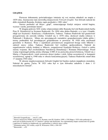 GRĄDEK Pierwsze dokumenty poświadczające istnienie tej wsi można odnaleźć na mapie z 1839 roku. Zaznaczono tam niewielką miejscowość Folwark Grądek. Ten folwark należał do dóbr ziemskich Rumoka. Kolejny zapis pochodzi z 1881 roku1. Nazwa pochodzi od słowa ,,grąd”, oznaczającego kiedyś miejsce wśród bagien, wyższe i suche, porośnięte lasem2. W drugiej połowie XIX wieku właścicielami dóbr Rumoka był ród Rudowskich herbu Prus II. Dziedziczył tu Szymon Rudowski. Po 1894 roku dobra Rumoki, a w tym i Grądek, objął syn Szymona i Katarzyny z Kalksteinów, Tadeusz. Tadeusz Rudowski był gruntownie przygotowany do zawodu rolnika. Urodził się w 1870 roku, skończył studia rolnicze w Puławach i Krakowie. Mimo nie sprzyjających warunków gospodarowania (słaba gleba i tereny podmokłe) był przodującym gospodarzem w powiecie. W 1920 roku uruchomił gorzelnie w Rumoce. Wraz z sejmikiem powiatowym uregulował brzegi rzeki Mławki i założył stawy rybne. Tadeusz Rudowski był wielkim społecznikiem. Należał do organizatorów szkoły średniej w Mławie, zorganizował Syndykat Rolniczy. Gościł u siebie sieroty wojenne. Był zwolennikiem Narodowej Demokracji i Romana Dmowskiego. Przed wojną wspomagał polską armię ofiarując 6 000 zł na pożyczkę przeciwlotniczą. Ożenił się z Marią z Chojnowskich i miał sześcioro dzieci (jeden z nich, Julian uczestniczył w kampanii wrześniowej, zginął w 1940 roku w obozie koncentracyjnym). Tadeusz Rudowski zmarł dnia 17 sierpnia 1945 roku3. W okresie międzywojennym folwark Grądek był bardzo małym majątkiem ziemskim. Należał do gminy Turza. W 1921 roku był w tym folwarku zaledwie 1 dom i 13 mieszkańców-fornali4. 1 Słownik Geograficzny…, tom II, s.801 Nazwy miejscowe Polski, pod red. K. Rymuta, tom III, Kraków 1999, s.358.Mapa z 1935 roku pokazuje iż teren jest tu podwyższony do 117 metrów i góruje nad okolicami. Na wspomnianej mapie zaznaczono też groble i zapewne to właśnie tu znajdowały się wspomniane w tekście stawy rybne. 3 Ziemianie polscy XX wieku, część II, Warszawa 1994, s.104-105 4 Skorowidz… s.93 2