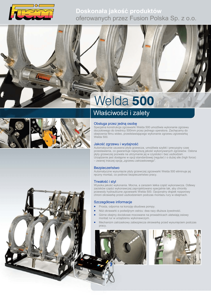Doskonała jakość produktów oferowanych przez Fusion Polska Sp. z o.o. Właściwości i zalety Obsługa przez jedną osobę Specjalna konstrukcja zgrzewarki Welda 500 umożliwia wykonanie zgrzewu doczołowego do średnicy 500mm przez jednego operatora. Zachęcamy do obejrzenia filmu wideo, przedstawiającego wykonanie zgrzewu zgrzewarką Welda 500. Jakość zgrzewu i wydajność Automatycznie usuwana płyta grzewcza, umożliwia szybki i precyzyjny czas przestawienia, co gwarantuje najwyższą jakość wykonywanych zgrzewów. Osłona płyty grzewczej pozwala na utrzymanie jej w czystości i bez uszkodzeń. Urządzenie jest dostępne w opcji standardowej (regular) i o dużej sile (high force) – zwanej inaczej opcją „zgrzewu zatrzaskowego”. Bezpieczeństwo Automatyczne wysunięcie płyty grzewczej zgrzewarki Welda 500 eliminuje jej ręczny montaż, co podnosi bezpieczeństwo pracy. Trwałość i styl Wysoka jakość wykonania. Mocna, a zarazem lekka część wykonawcza. Odlewy zacisków części wykonawczej zaprojektowano specjalnie tak, aby chroniły przewody hydrauliczne zgrzewarki Welda 500. Opcjonalny drążek rozporowy chroni okrawarkę przed uszkodzeniem podczas montażu rury w obejmach. Szczegółowe informacje • Prosta, odporna na korozję obudowa pompy. • Nóż okrawarki o podwójnym ostrzu: dwa razy dłuższa żywotność. • Górne obejmy dociskowe mocowane na prowadnicach ułatwiają osiowy montaż rur w urządzeniu wykonawczym. • Mechanizm zatrzaskowy zabezpiecza okrawarkę przed wysunięciem podczas pracy. Specyfikacja techniczna Zakres łączonych średnic zgrzewarką typu WELDA500: 250mm – 500mm. Wymiary Masa (bez wózka) (łącznie z przewodami i zespołem napędu hydraulicznego bez wózka): 363kg Długość 1090mm Szerokość 905mm Skok: 200mm Wysokość 1295mm Ciśnienie: Maks. 150bar Powierzchnia cylindra: (z wózkiem) 2 Długość 1930mm Welda 500 Regular 14,14cm Szerokość 1250mm Wysokość 1640mm Welda 500 High Force (Zgrzew 2 zatrzaskowy) 31,42cm Wyposażenie dodatkowe • Pierścienie centrujące • Rolki prowadzące – umożliwiają wsuwanie rury pod katem 45° • Łącznik kołnierzowy • Drążek rozporowy – chroni • • • okrawarkę podczas montażu rury w obejmach Wózek – system sterowania Ackermanna, opuszczany schodek operatora, wysoki prześwit nad podłożem, kliny blokujące Wciągarka wózka Łańcuchy podnoszące Więcej naszych produktów znajdziecie Państwo w katalogu firmy Fusion. Pierścienie centrujące Rolki prowadzące Drążek rozporowy Wózek Dane kontaktowe Fusion Fusion Polska Sp. z o.o. ul. Bodycha 97, Reguły 05-816 Michałowice www.fusion.com.pl Poznań ul. Fabianowska 188 62-052 Komorniki tel/fax: 61 893 66 66 tel.: 604 077 230 Szczecin Kurów 15 72-001 Kołbaskowo tel/fax: 91 311 99 54 tel.: 604 649 777 Gliwice ul. Chorzowska 58 B 44-100 Gliwice tel/fax: 32 335 30 05 tel.: 602 260 077 Gdańsk ul. Łostowicka 4 80-121 Gdańsk tel.: 58 300 44 20 fax: 58 682 28 09 tel.: 604 541 604 tel.: 22 723 88 72 fax.: 22 723 95 03 tel.: 698 642 264 e-mail: [email protected] Olsztyn ul. Lubelska 3 10-404 Olsztyn tel/fax: 89 526 41 64 tel.: 608 649 100 Wrocław tel.: 608 325 125 Kraków tel.: 608 325 400 Łódź tel.: 604 639 777